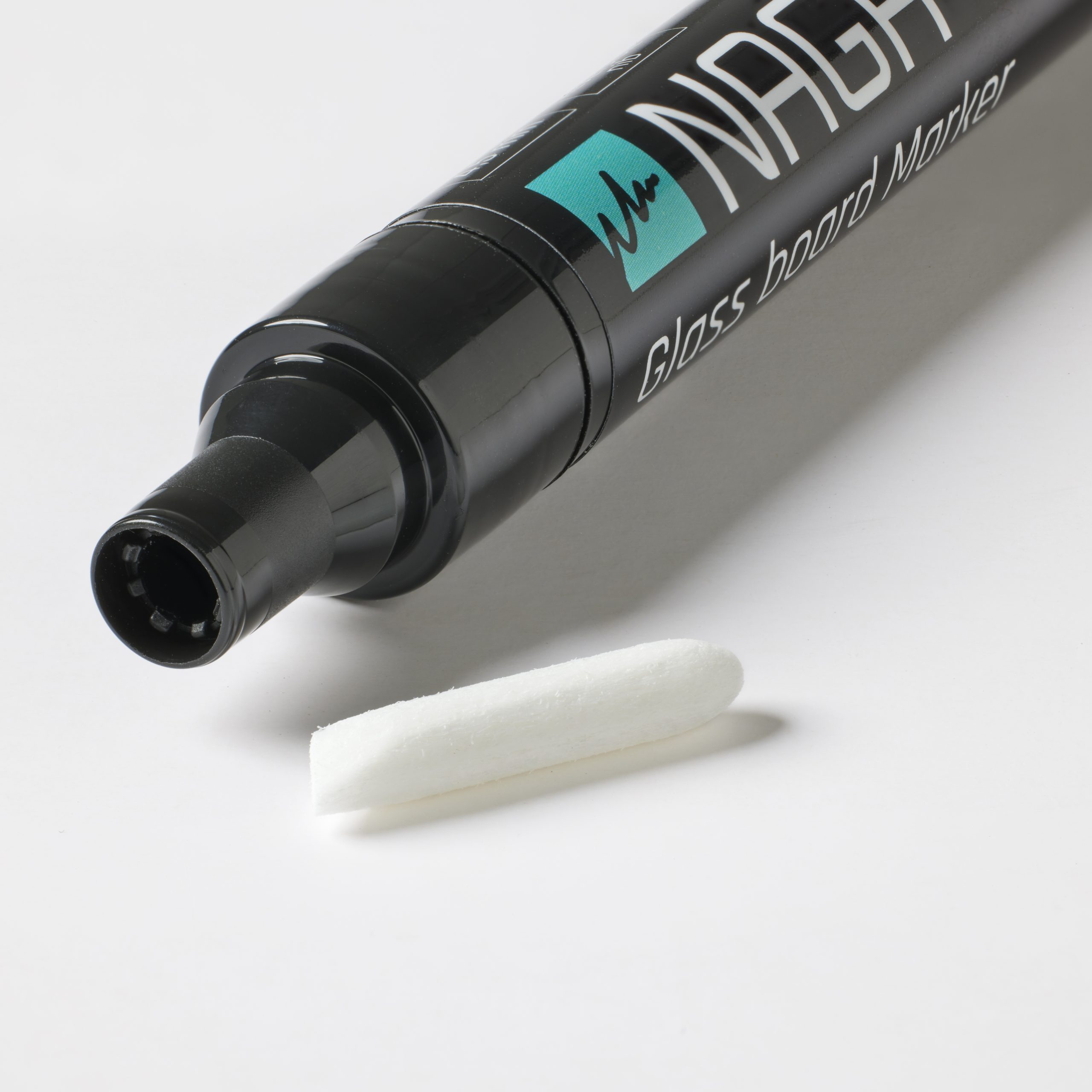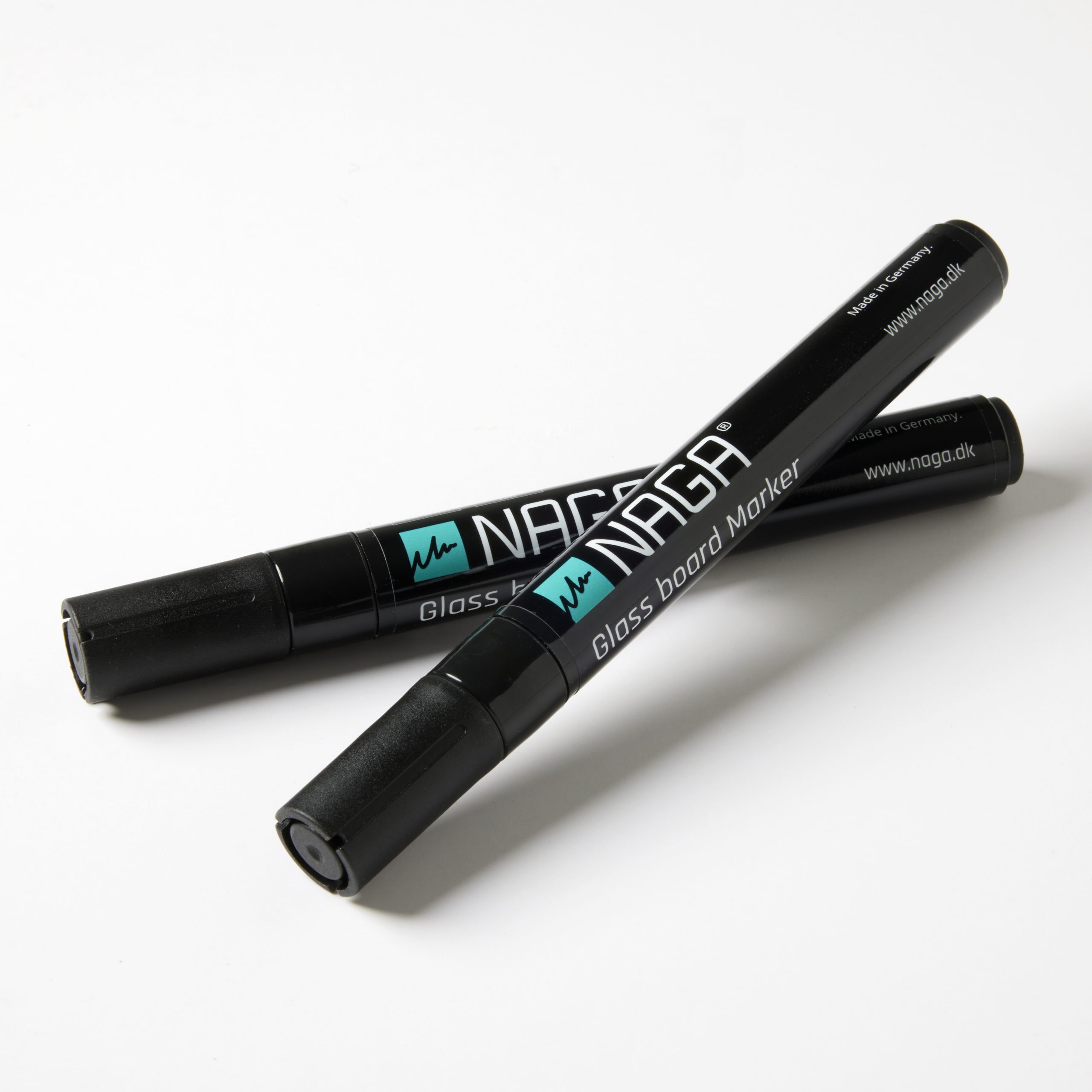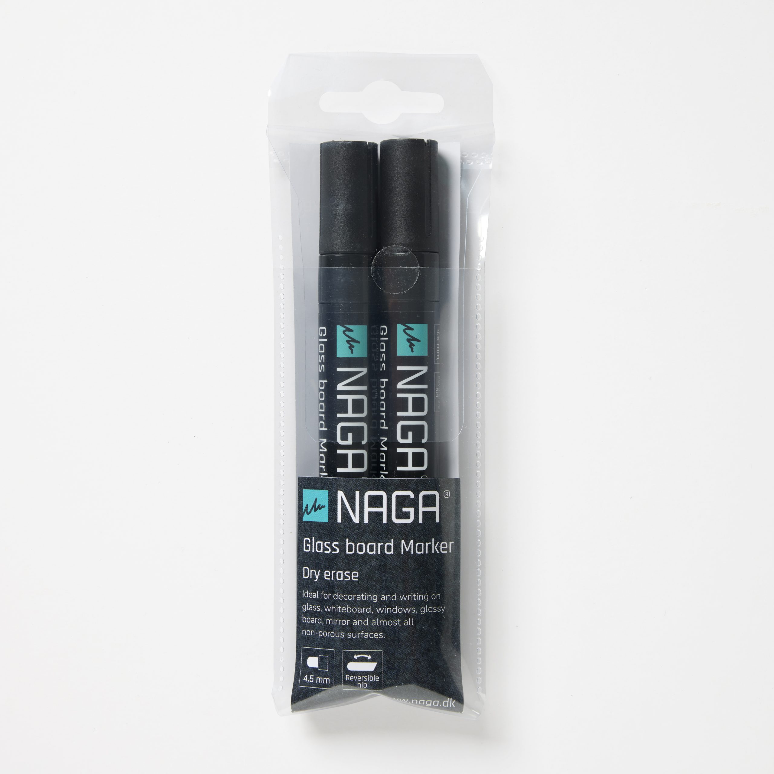 Glastavle marker, 4,5 mm. Sort. Med vendbar spids fra rund til skrå. Dry Erase. Markeren er vandbaseret, på flydende kridt. Nem at viske ud, når teksten er tør. Brug en tør klud eller en tavlesvamp. Perfekt til at lave dekorationer, og skrive på glas, vinduer, blanke tavler, spejle og andre glatte overflader. Leveres 2 stk. i miljøvenlig PP pose. Hurtig brugsvejledning:1. Ryst markeren godt, med hætten på.2. Pump markeren, indtil spidsen er fyldt med blæk.3. Skriv eller tegn med markeren. Husk at sætte hætten godt på efter brug, og opbevar markeren vandret. Se brugsvejledning til NAGA glastavle marker under fanen vejledninger.
