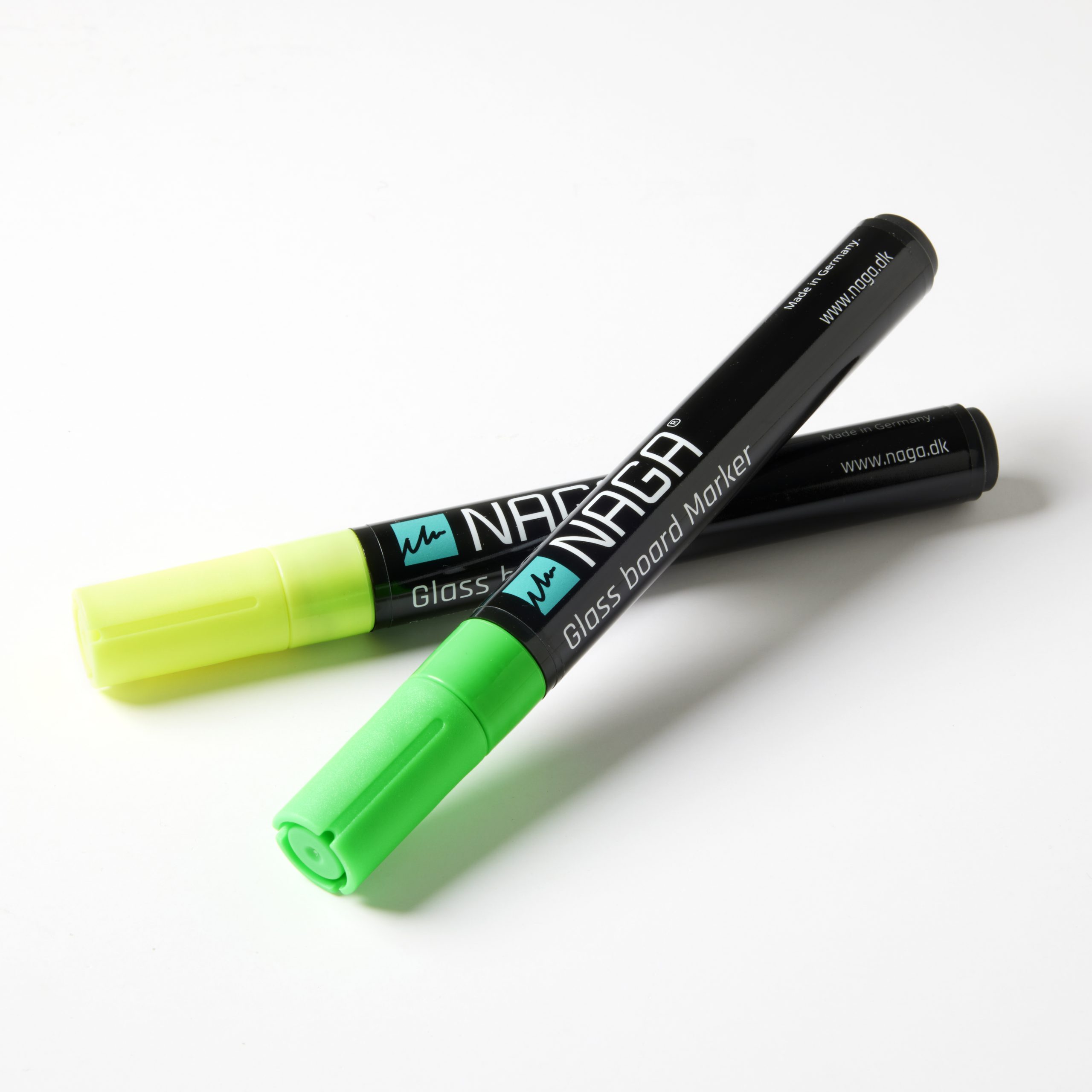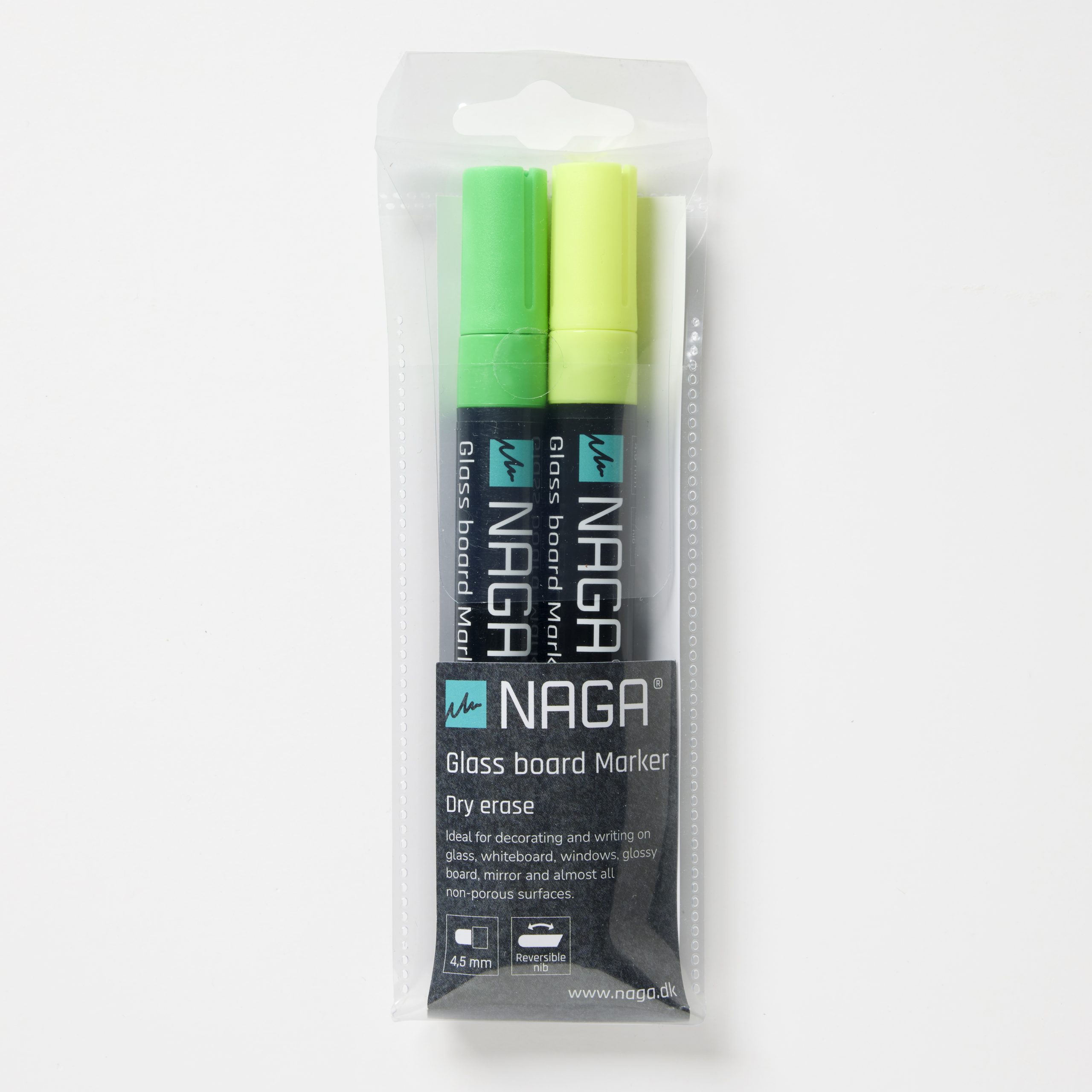Glastavle marker, 4,5 mm. Grøn og Gul. Med vendbar spids fra rund til skrå. Dry Erase. Markeren er vandbaseret, på flydende kridt. Nem at viske ud, når teksten er tør. Brug en tør klud eller en tavlesvamp. Perfekt til at lave dekorationer, og skrive på glas, vinduer, blanke tavler, spejle og andre glatte overflader. Se alle markere herLeveres 2 stk. i miljøvenlig PP pose.Hurtig brugsvejledning:1. Ryst markeren godt, med hætten på.2. Pump markeren, indtil spidsen er fyldt med blæk.3. Skriv eller tegn med markeren.Husk at sætte hætten godt på efter brug, og opbevar markeren vandret.Se brugsvejledning til NAGA glastavle marker under fanen vejledninger.