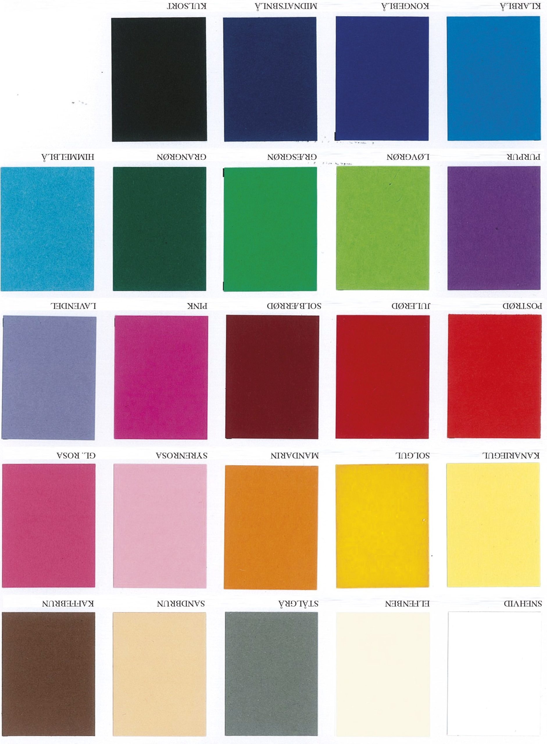 Kartonen findes i 24 flotte farver, som du kan se ovenfor under billeder.