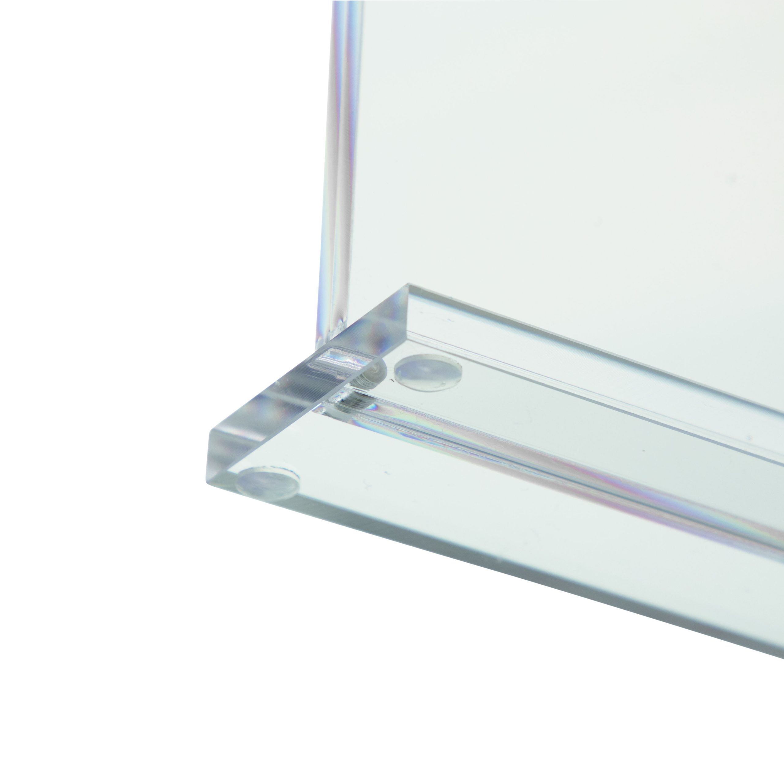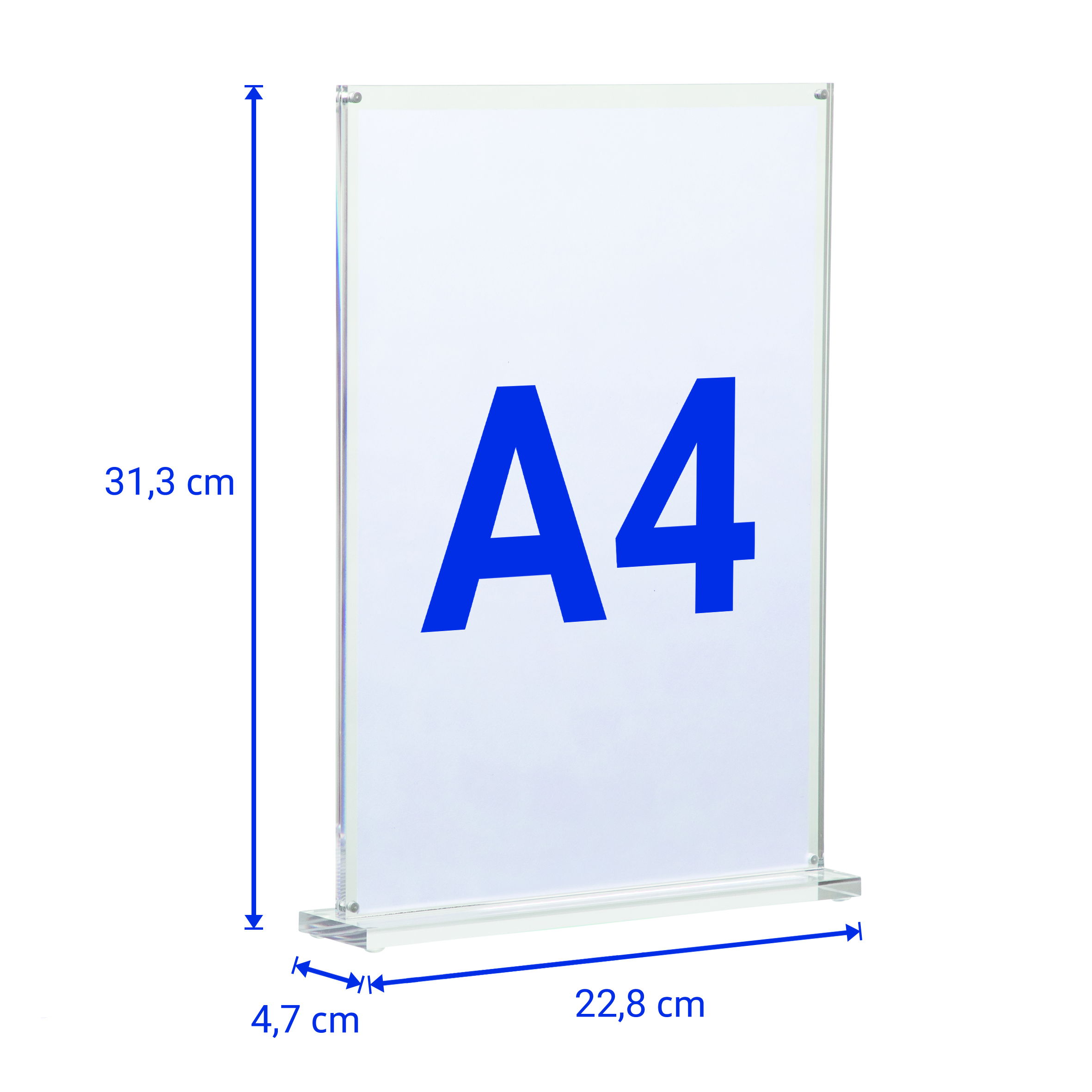 Akryl bordskilt A4 MAULvision Akryl bordskilt i A4-format er en elegant og professionel løsning til præsentation af menukort, informationsark, kampagner, billeder og opslag. Det krystalklare akryl giver et eksklusivt og minimalistisk udtryk, som passer perfekt til receptioner, restauranter, butikker, kontorer og messestande. Bordskiltet er fremstillet i kraftig, transparent akryl med to solide 4 mm plader, der holdes sikkert sammen af fire integrerede magneter – én i hvert hjørne. Den magnetiske lukning gør det nemt og hurtigt at skifte indhold: Fronten løftes af, materialet udskiftes, og fronten placeres tilbage. Bordskiltet har en stabil T-formet fod i 8 mm akryl og fire transparente gummifødder, som beskytter underlaget mod ridser og giver ekstra stabilitet. De polerede kanter understreger den høje kvalitet og giver et professionelt helhedsindtryk uden skarpe hjørner. Akrylmaterialet beskytter indholdet mod støv og snavs og er samtidig let at rengøre, så dine budskaber altid fremstår skarpe. Mål: L 22,8 x B 4,7 x H 31,8 cm
