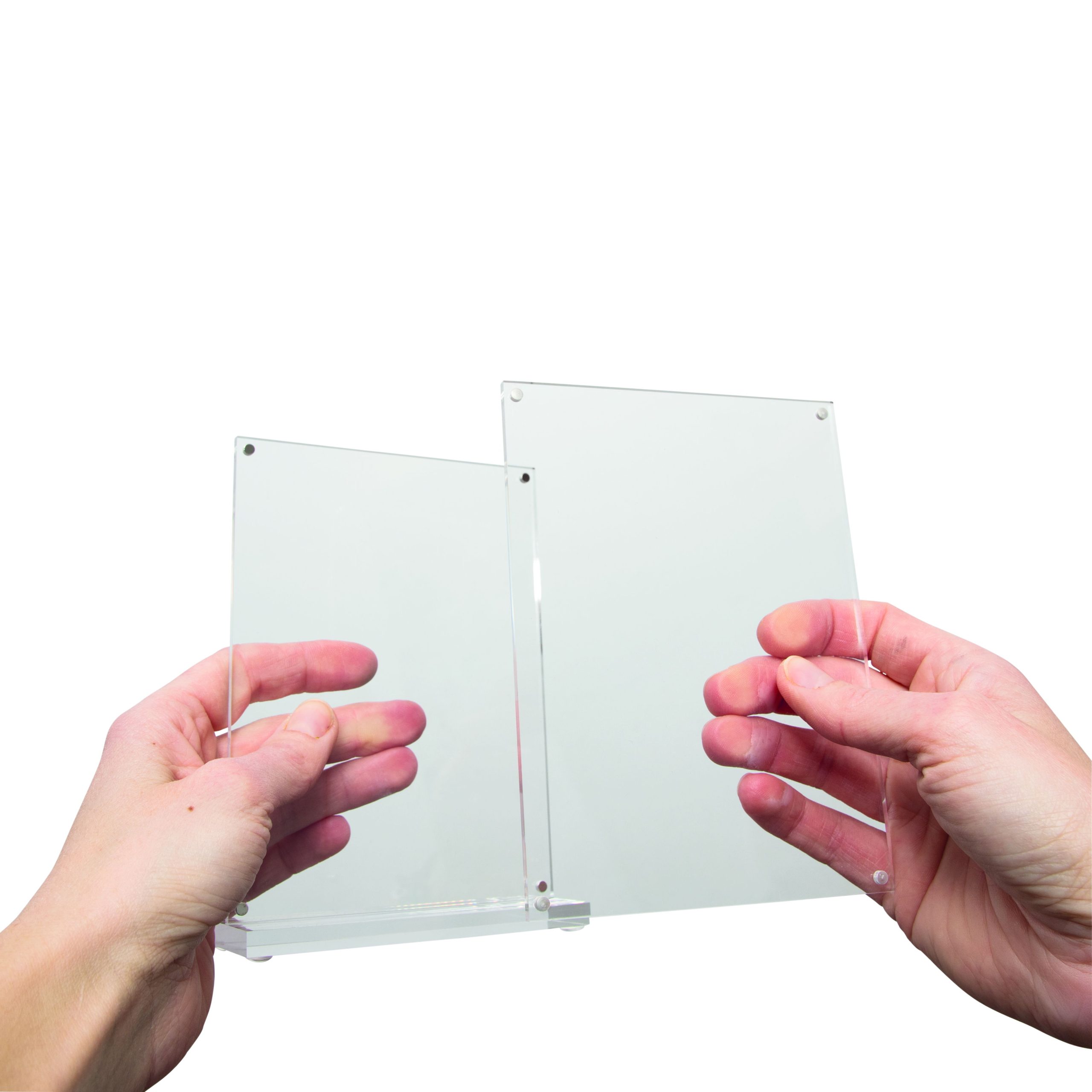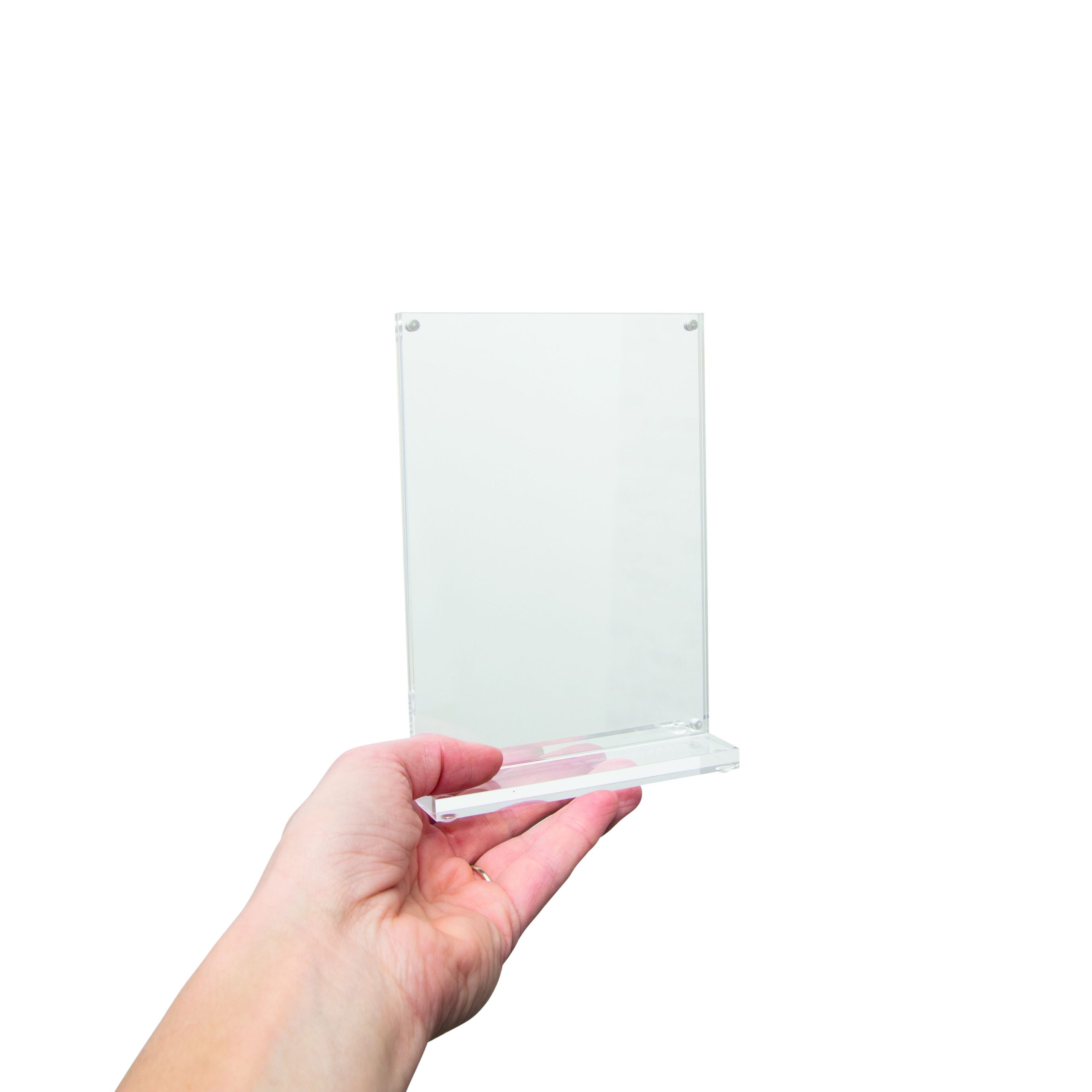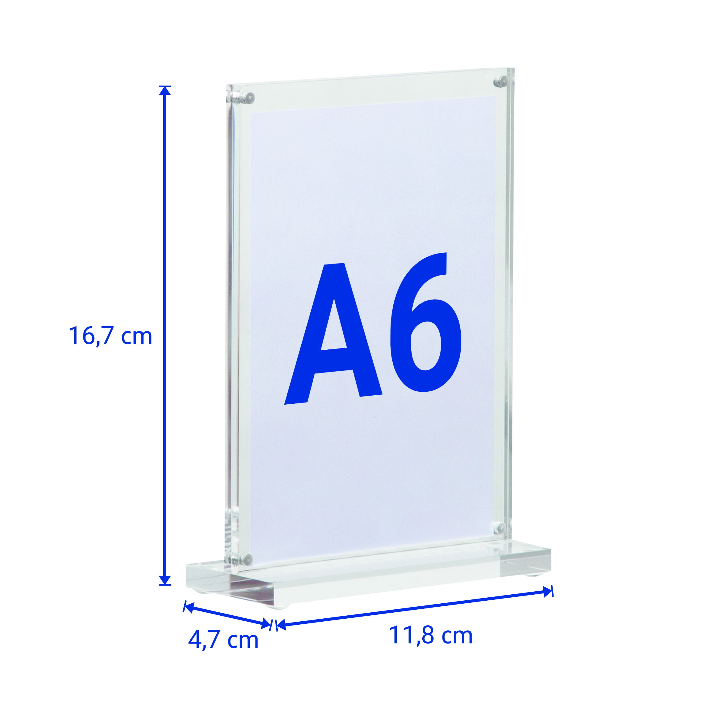 Akryl bordskilt A6 MAULvision Akryl bordskilt i A6-format er den perfekte løsning til mindre budskaber, bordkort, menukort, prisskilte og informationskort. Det kompakte format gør det ideelt til caféborde, receptionsskranker, diske og messestande, hvor pladsen er begrænset, men præsentationen stadig skal være professionel. Bordskiltet er fremstillet i transparent akryl af høj kvalitet og består af to 4 mm akrylplader, som holdes sikkert sammen af fire integrerede magneter – én i hvert hjørne. Den magnetiske lukning gør det nemt og hurtigt at skifte indhold. Fronten løftes af, materialet udskiftes, og fronten placeres tilbage igen. Den solide 8 mm T-formede fod sikrer høj stabilitet. Fire transparente gummidutter under foden beskytter underlaget mod ridser og giver ekstra skridsikkerhed. Akrylmaterialet beskytter indholdet mod støv og snavs og er samtidig let at rengøre, så dine budskaber altid fremstår tydelige og indbydende. Mål: L 11,8 x B 4,7 x H 17 cm