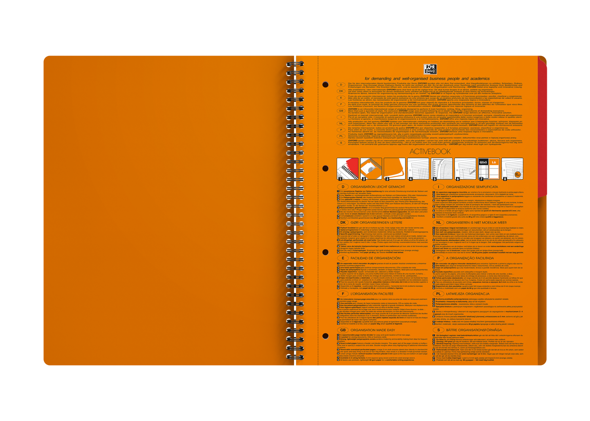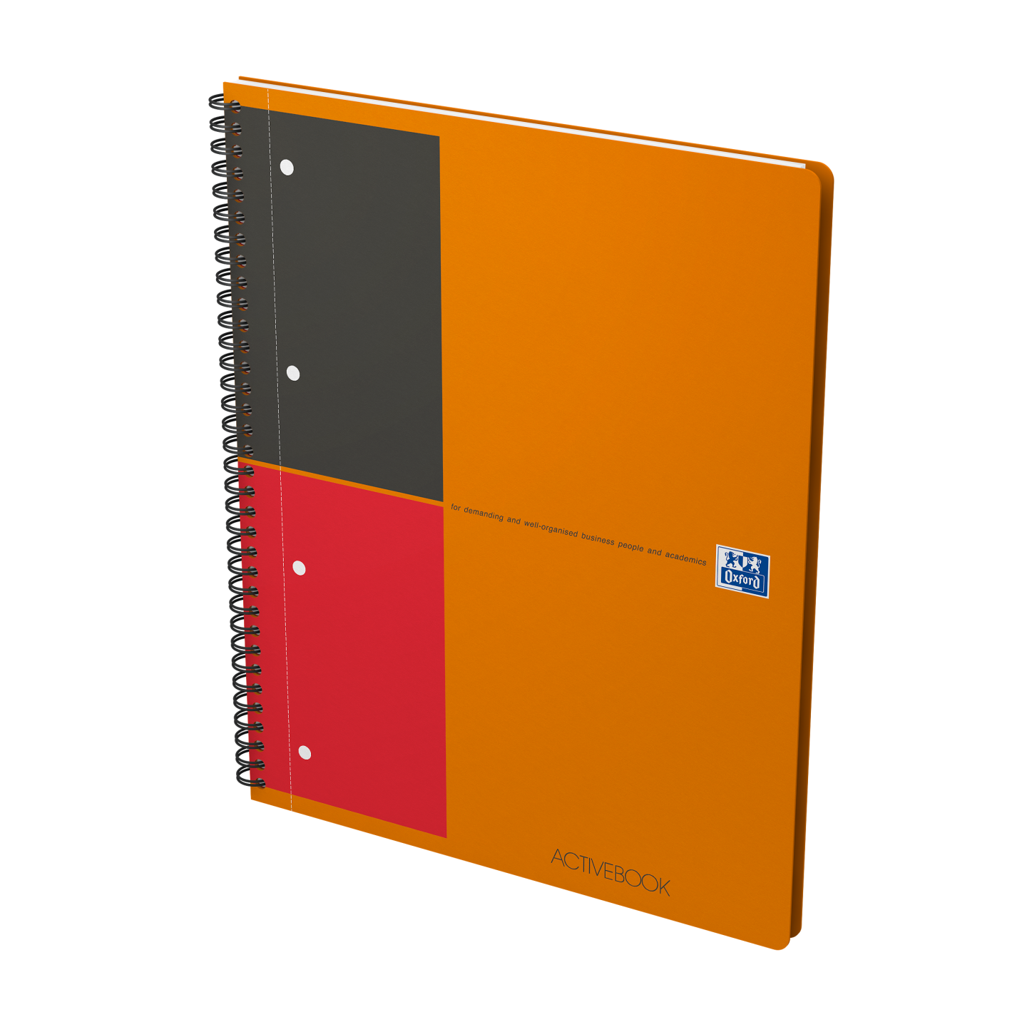 Activebook i A4+, tæt linjeret med margin, perforeret og udstanset med 4 huller, 160 sider. Med det lette, glatte og hvide Optik Paper® i 80 g/m2 kan du skrive på begge sider af arket, uden at blækket bløder igennem. Siderne er udstyret med smart linjering og sidehoved, hvor du kan skrive mødets emne eller en overskrift foruden datoen, samt dobbelt margen, så du kan nummerere eller fremhæve punkter. Robust, sort dobbeltspiral i ryggen sikrer holdbarheden og gør det samtidig muligt at lægge notesbogen fladt mod underlaget eller at åbne den helt op, hvilket sikrer maksimal komfort og fleksibilitet. Det vandtætte omslag af orange polypropylen er rivfast og kan modstå masser af slid og strabadser i lang tid fremover. Arkene er kompatible med den gratis Scribzee®-smartphoneapp, så du nemt kan scanne, gemme og organisere dine noter. OXFORDs eksklusive Optik Paper® har både fået EU’s miljømærke (lav miljøbelastning fra de papirfabrikker, der producerer papiret) og PEFC™-certificering (bæredygtig skovforvaltning). Det flytbare bogmærke/skilleark gør det nemt at finde første blanke side i en fart og at opdele notesbogen i 2 afsnit. Paplommen forrest i notesbogen kan bruges til midlertidig opbevaring af løse notater og dokumenter.