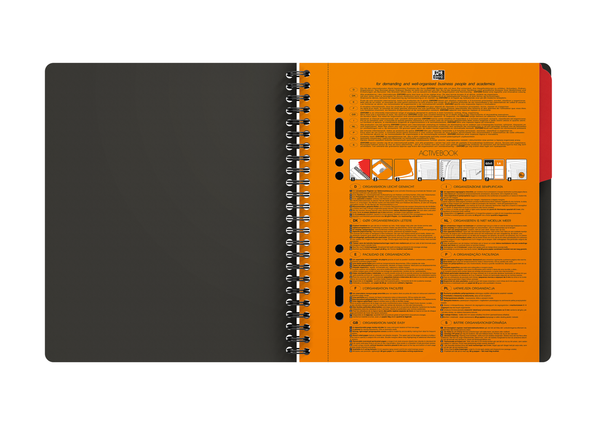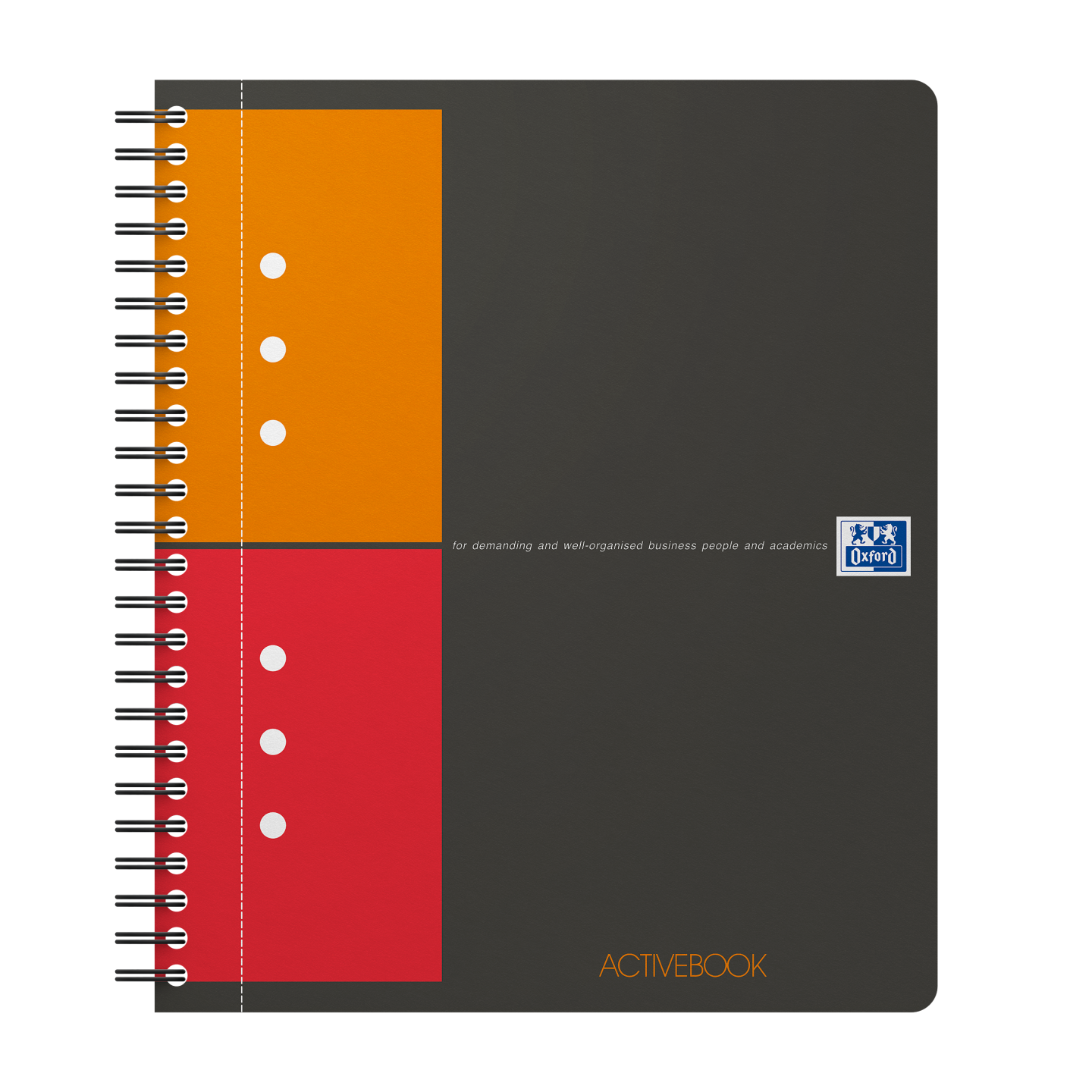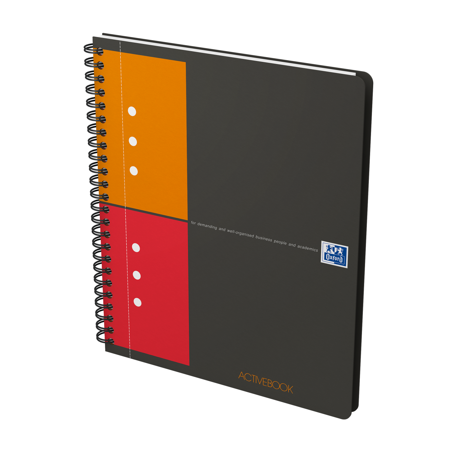 Activebook i A5+, kvadreret 5×5 mm med margen, perforeret og udstanset med 4 huller, 160 sider. Med det lette, glatte og hvide Optik Paper® i 80 g/m2 kan du skrive på begge sider af arket, uden at blækket bløder igennem. Siderne er udstyret med smart linjering og sidehoved, hvor du kan skrive mødets emne eller en overskrift foruden datoen, samt dobbelt margen, så du kan nummerere eller fremhæve punkter. Robust, sort dobbeltspiral i ryggen sikrer holdbarheden og gør det samtidig muligt at lægge notesbogen fladt mod underlaget eller at åbne den helt op, hvilket sikrer maksimal komfort og fleksibilitet. Det vandtætte omslag af grå polypropylen er rivfast og kan modstå masser af slid og strabadser i lang tid fremover. Arkene er kompatible med den gratis Scribzee®-smartphoneapp, så du nemt kan scanne, gemme og organisere dine noter. OXFORDs eksklusive Optik Paper® har både fået EUs miljømærke (lav miljøbelastning fra de papirfabrikker, der producerer papiret) og PEFC-certificering (bæredygtig skovforvaltning). Det flytbare bogmærke/skilleark gør det nemt at finde første blanke side i en fart og at opdele notesbogen i 2 afsnit. Paplommen forrest i notesbogen kan bruges til midlertidig opbevaring af løse notater og dokumenter.