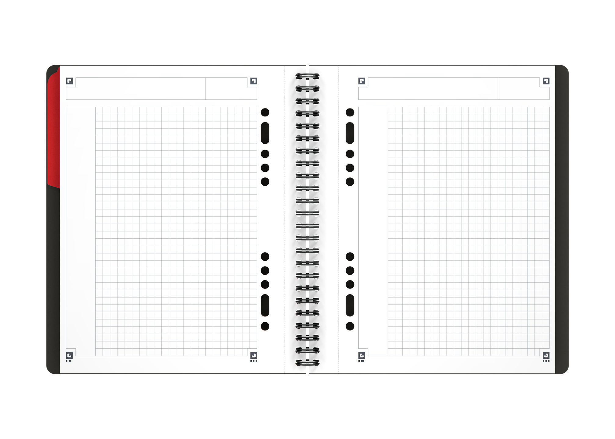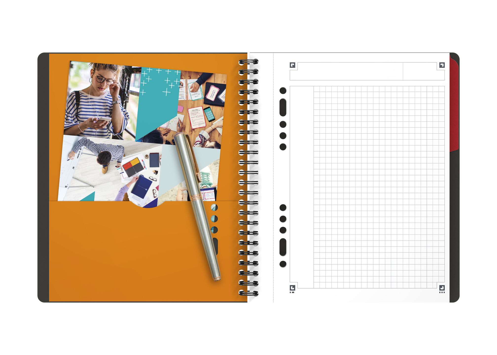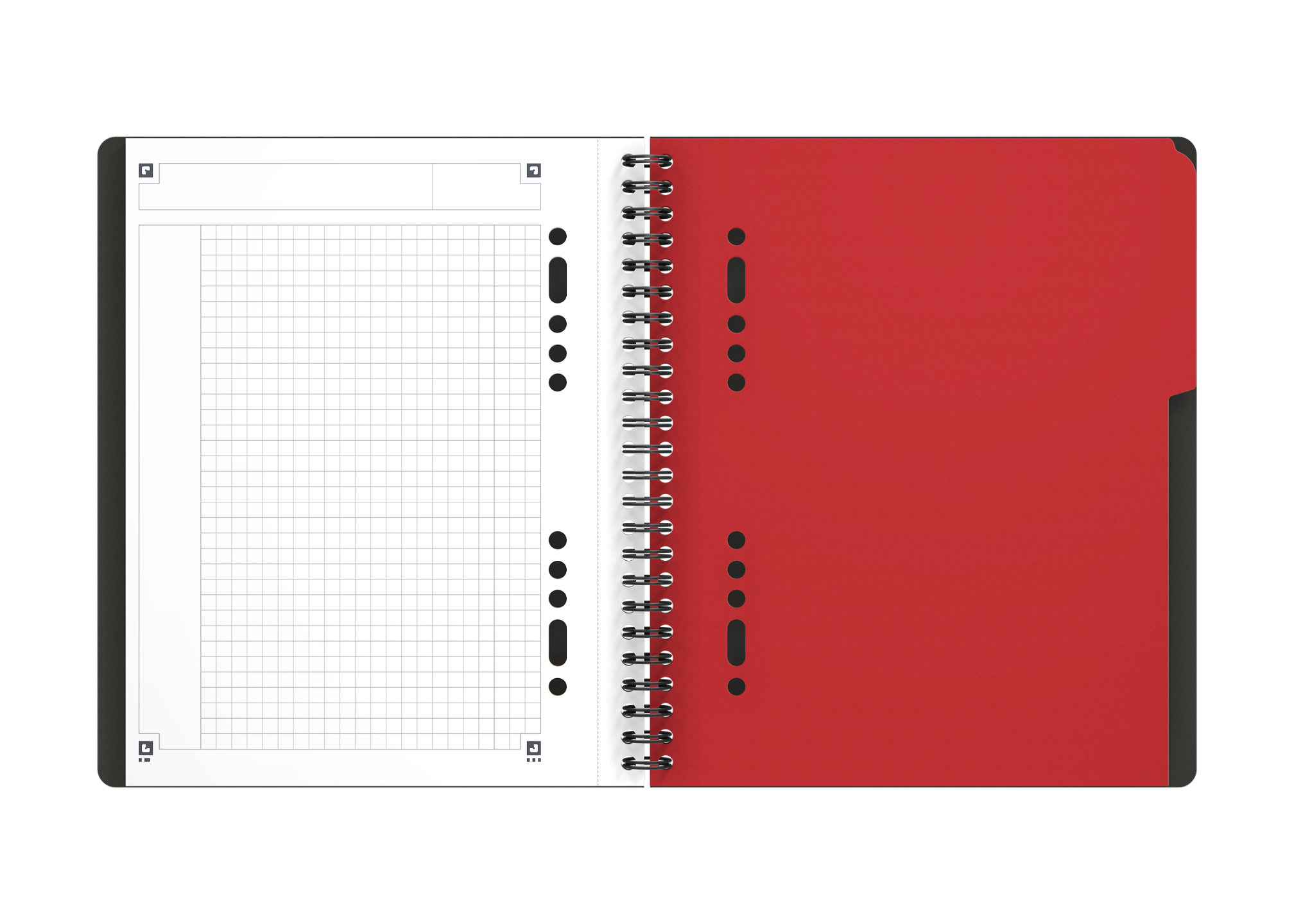 Activebook i A5+, kvadreret 5×5 mm med margen, perforeret og udstanset med 4 huller, 160 sider. Med det lette, glatte og hvide Optik Paper® i 80 g/m2 kan du skrive på begge sider af arket, uden at blækket bløder igennem. Siderne er udstyret med smart linjering og sidehoved, hvor du kan skrive mødets emne eller en overskrift foruden datoen, samt dobbelt margen, så du kan nummerere eller fremhæve punkter. Robust, sort dobbeltspiral i ryggen sikrer holdbarheden og gør det samtidig muligt at lægge notesbogen fladt mod underlaget eller at åbne den helt op, hvilket sikrer maksimal komfort og fleksibilitet. Det vandtætte omslag af grå polypropylen er rivfast og kan modstå masser af slid og strabadser i lang tid fremover. Arkene er kompatible med den gratis Scribzee®-smartphoneapp, så du nemt kan scanne, gemme og organisere dine noter. OXFORDs eksklusive Optik Paper® har både fået EUs miljømærke (lav miljøbelastning fra de papirfabrikker, der producerer papiret) og PEFC-certificering (bæredygtig skovforvaltning). Det flytbare bogmærke/skilleark gør det nemt at finde første blanke side i en fart og at opdele notesbogen i 2 afsnit. Paplommen forrest i notesbogen kan bruges til midlertidig opbevaring af løse notater og dokumenter.