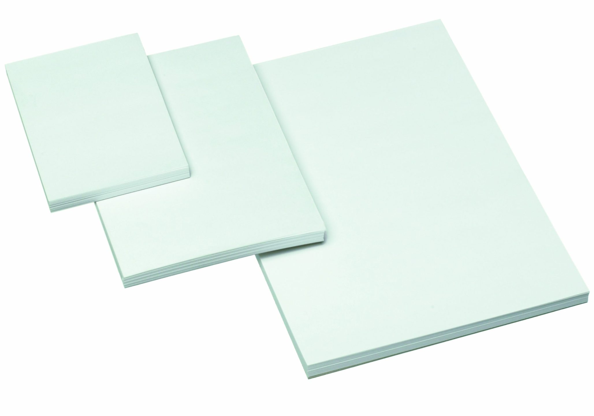 Hvidt, let træholdigt papir i blok med 100 blade. Toplimede og uden omslag. Kvalitet 60 gr.