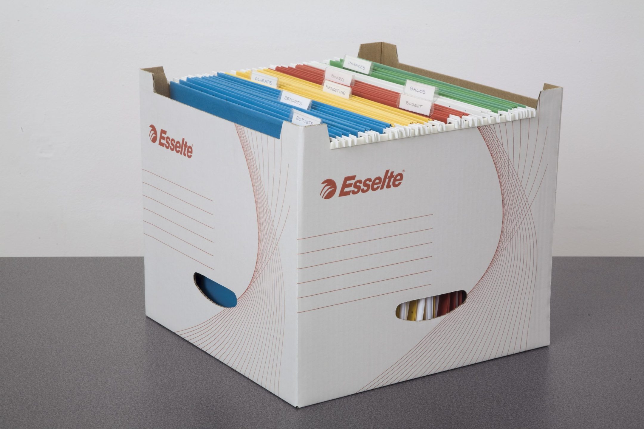 med huller som bærehåndtag i to sider, og låg. Ved at opbevare dine hængemapper på denne måde, er mapperne og