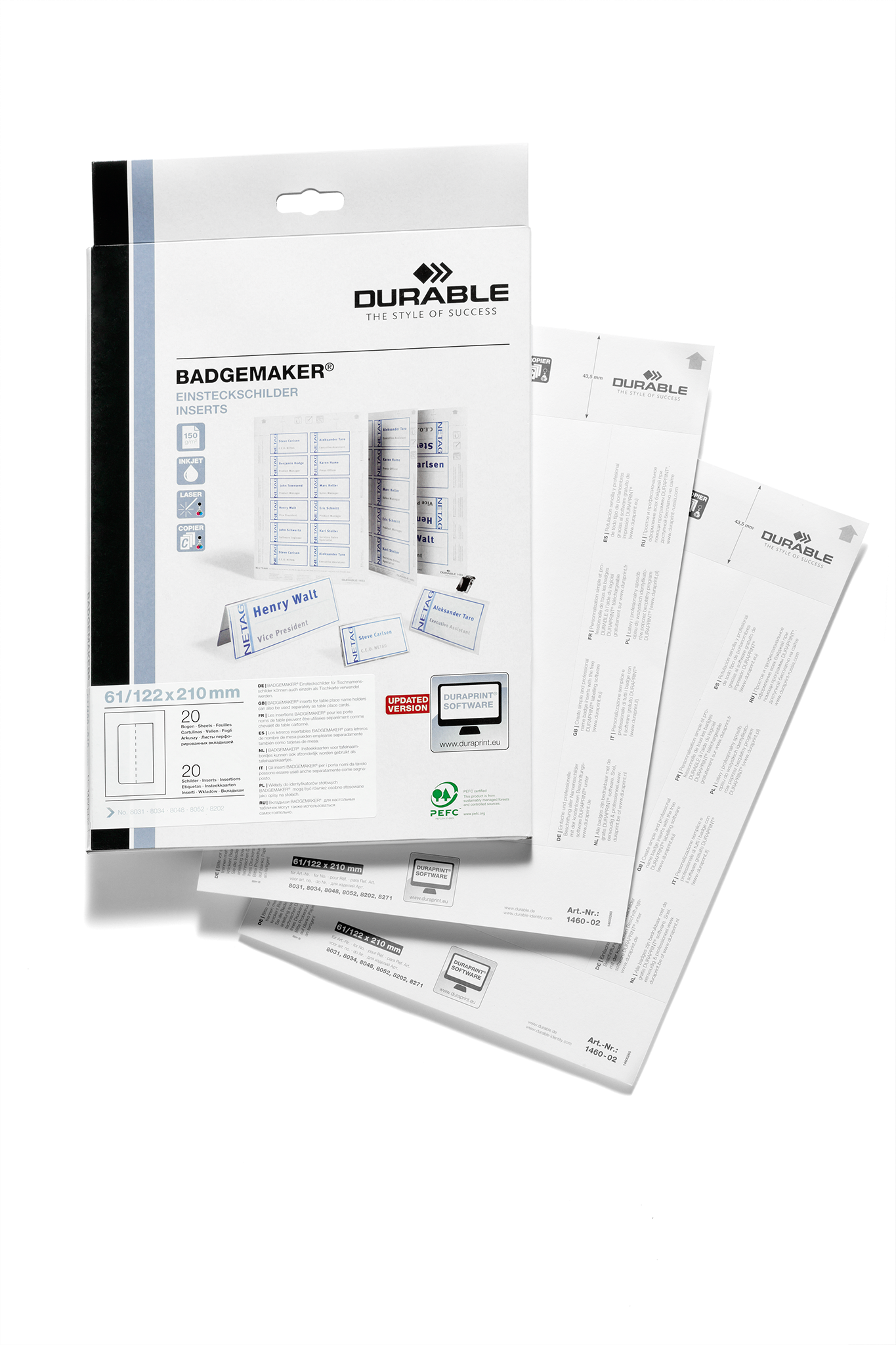 Indstiksark badgemaker®61x210mmMikroperforerede indstiksark til bordnavneskilte i format 61x210mm. 20 ark/20 stk. etiketter