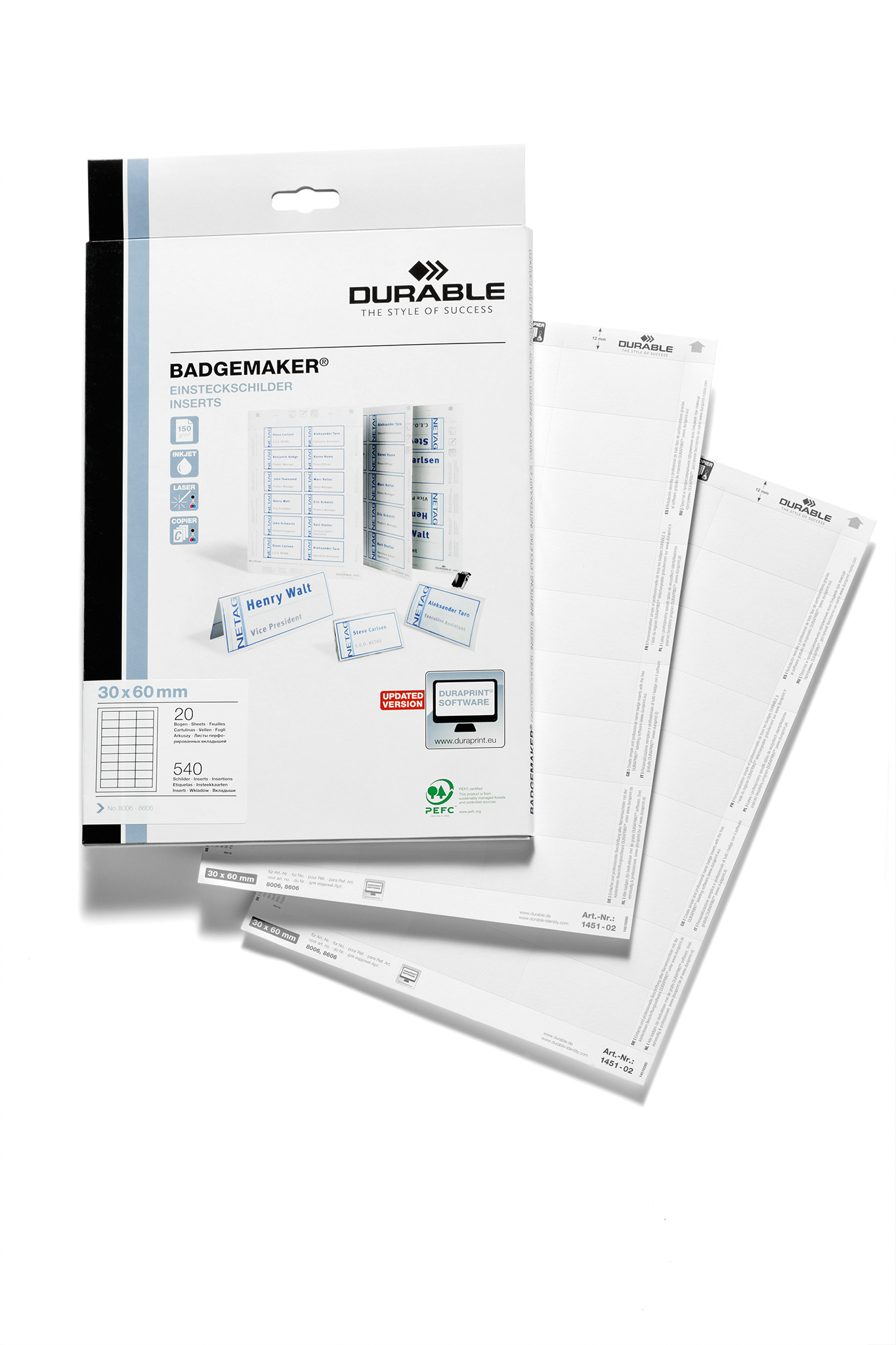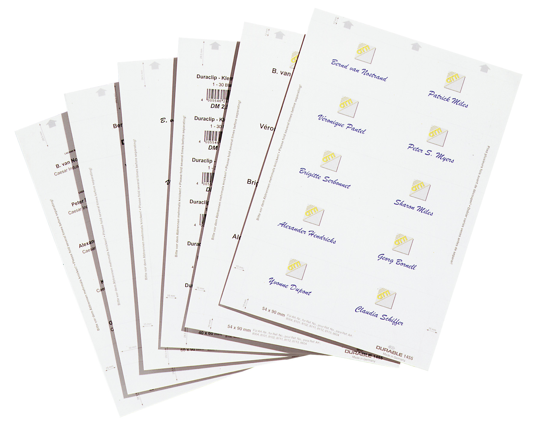 hvide indstik til navneskilte 30×60 på 150 g A4 ark. Velegnet til udskrivning i laser, inkjet eller kopi. Lette og skille ad. Pakke med 20 ark giver 540 stk. navneetiketter. Design selv med gratis skabelon på www.duraprint.dk