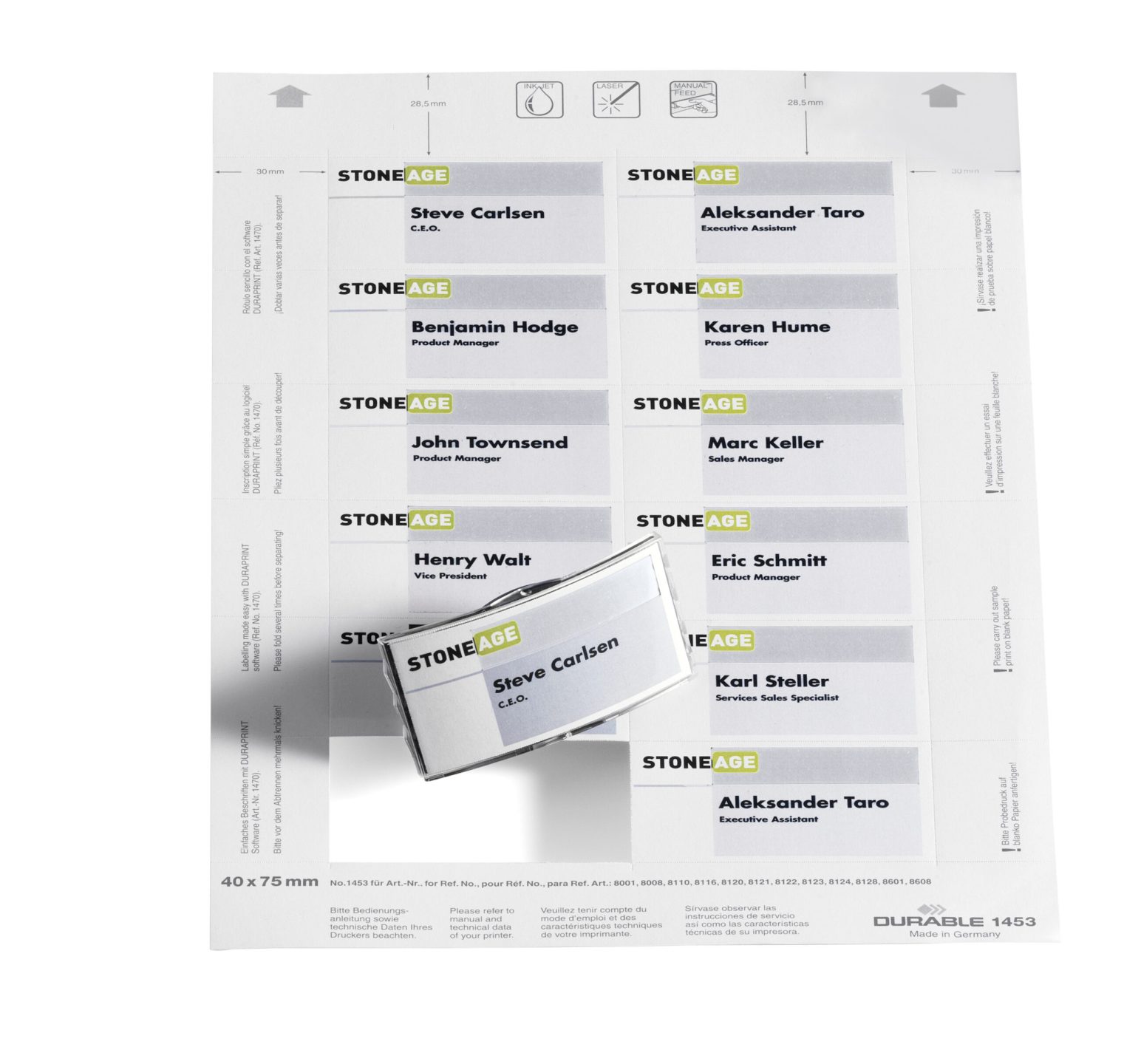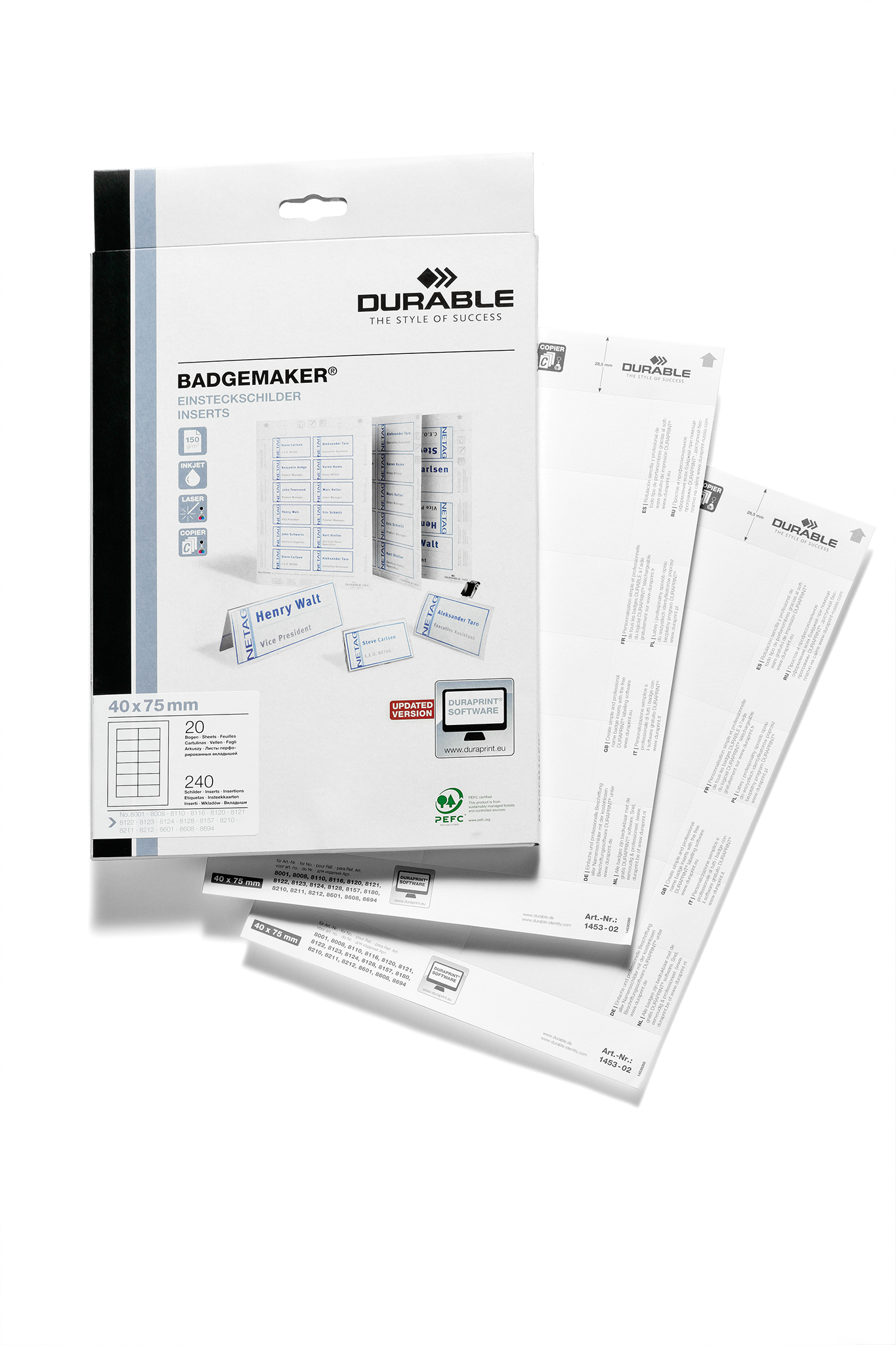 Indstiksetiketter på A4-ark (150 grams papir) til prof. Udskrivning i laser eller inkjet printer. Let at skille etiketterne ad, grundet microperforingerne. Indstiksetiketten 40x75mm (HxB) passer til DURABLE,s navneskilte DURABLE, art nr 8001, 8008, 8021, 8110, 8116, 8120, 8124, 8128, 8157, 8210, 8211, 8212, 8601, 8608 og 8694. Pakken består af 20 indstiksark der giver 240 stk etiketter. Anvend DURAPRINT online, som hjælp til at udskrive og design af dit personlige indstiksark, www.duraprint.dk