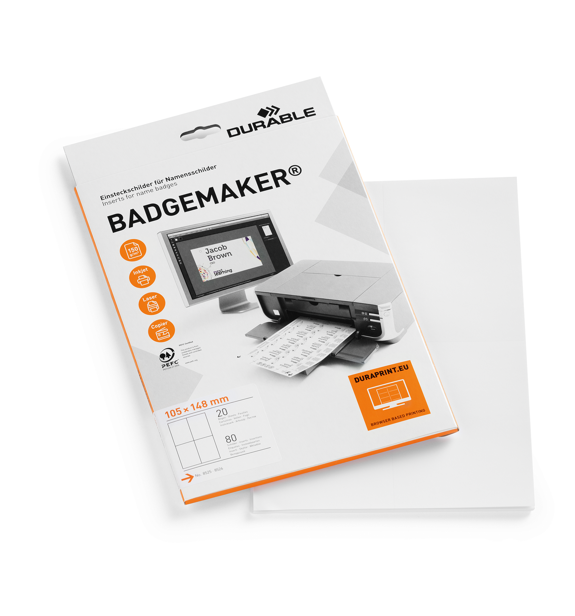 hvide indstik til navneskilte A6 på 150 g A4 ark. Velegnet til udskrivning i laser, inkjet eller kopi. Lette og skille ad. Pakke med 20 ark giver 80 stk. navneetiketter. Design selv med gratis skabelon på www.duraprint.dk