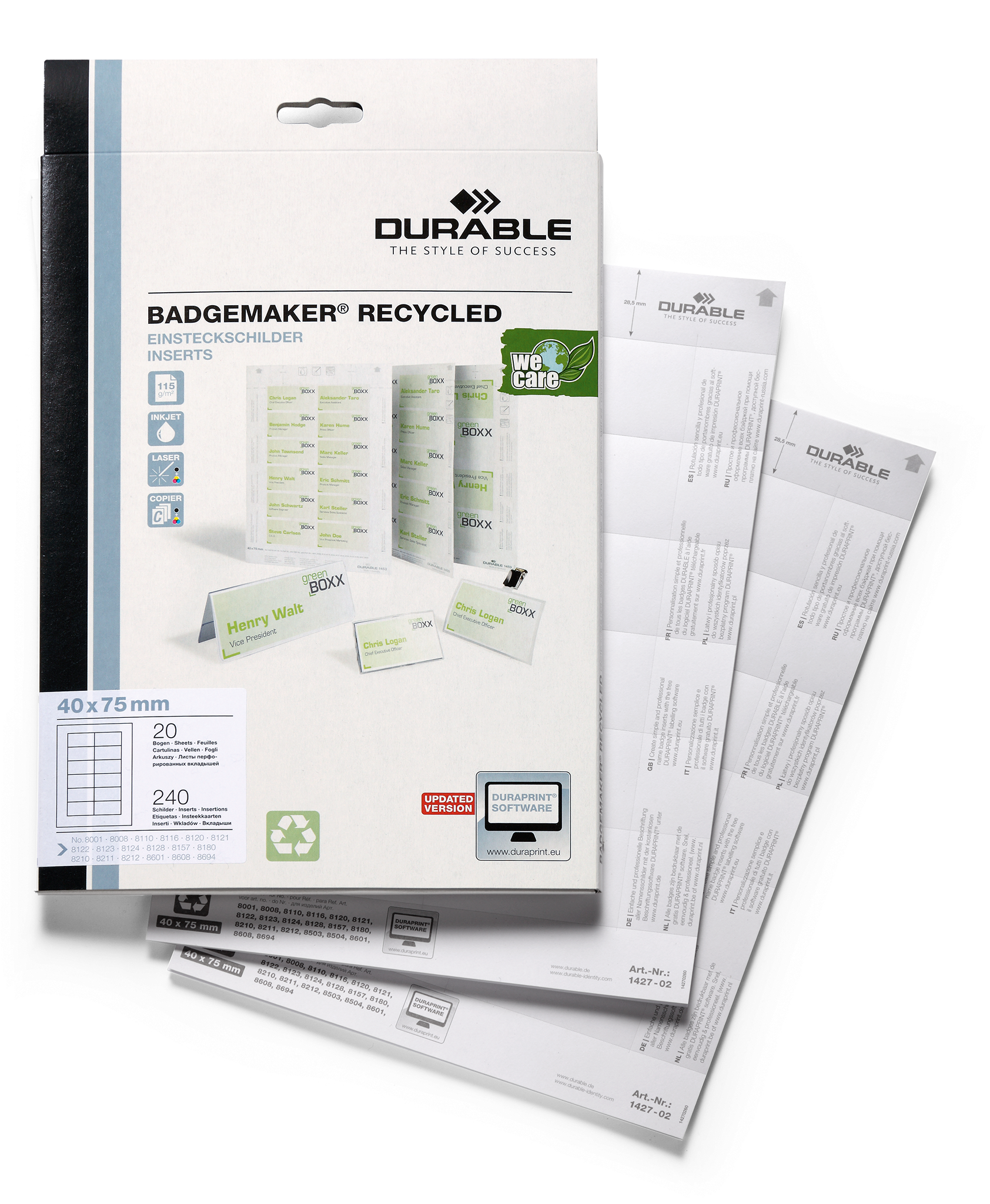hvide indstik til navneskilte 40×75 på A4 ark af genbrugspapir. Velegnet til udskrivning i laser, inkjet eller kopi. Lette og skille ad. Pakke med 20 ark giver 240 stk navneetiketter. Design selv med gratis skabelon på www.duraprint.dk