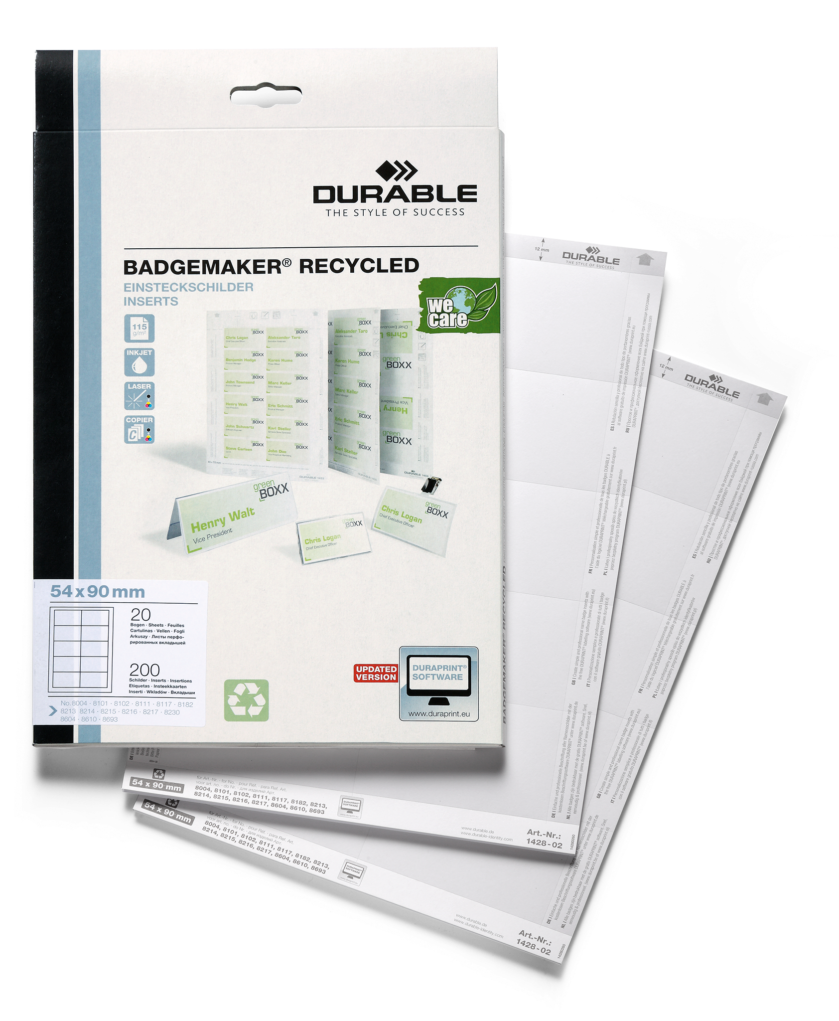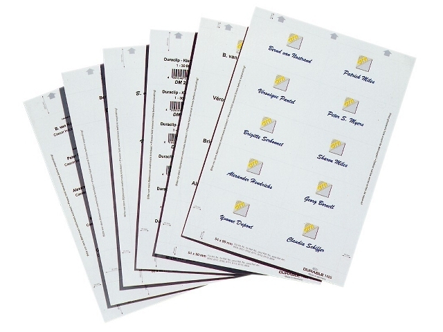hvide indstik til navneskilte 54×90 på A4 ark af genbrugspapir. Velegnet til udskrivning i laser, inkjet eller kopi. Lette og skille ad. Pakke med 20 ark giver 200 stk navneetiketter. Design selv med gratis skabelon på www.duraprint.dk