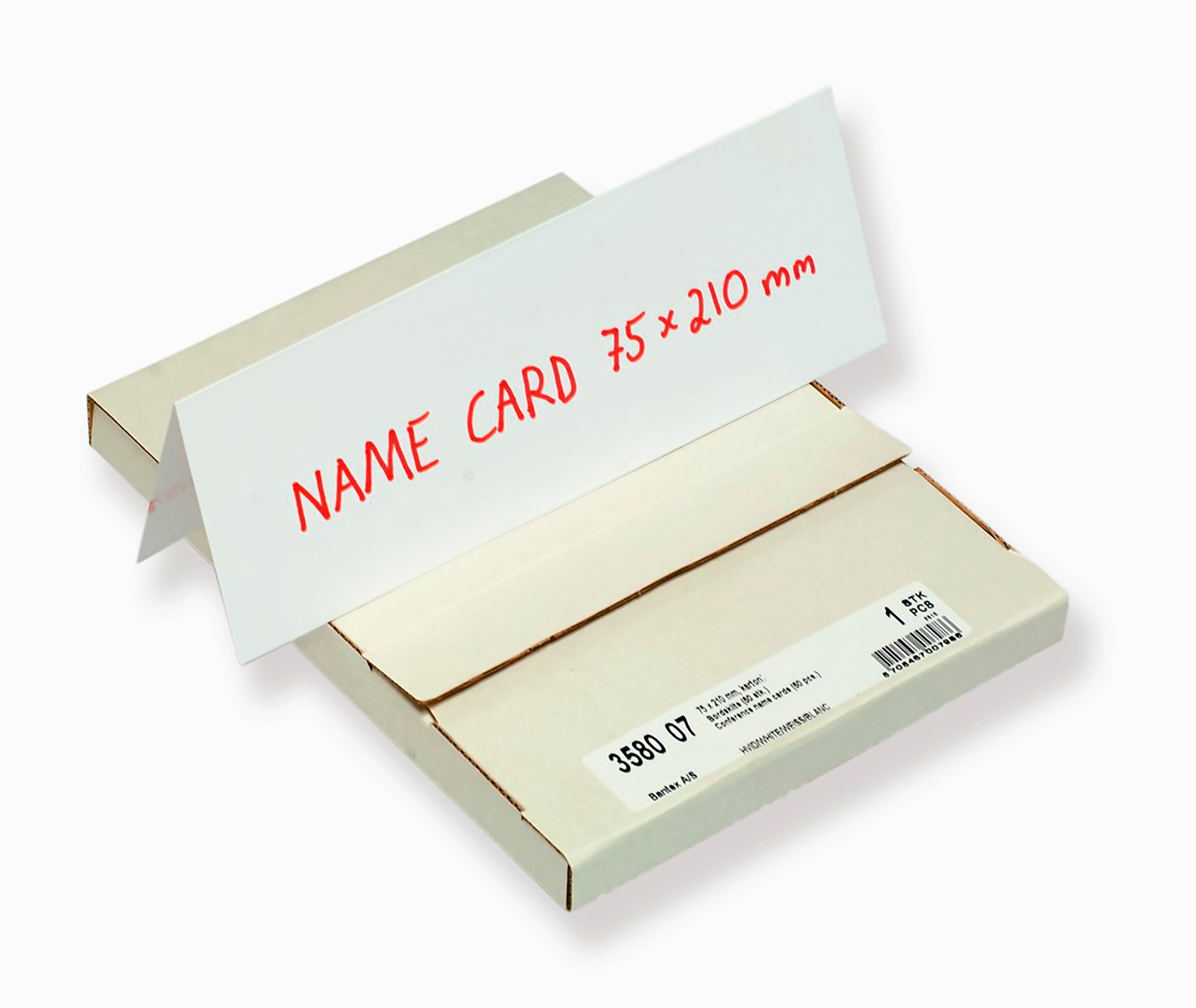 Bordnavneskilte af hvidt karton (A5-falset langs midten).