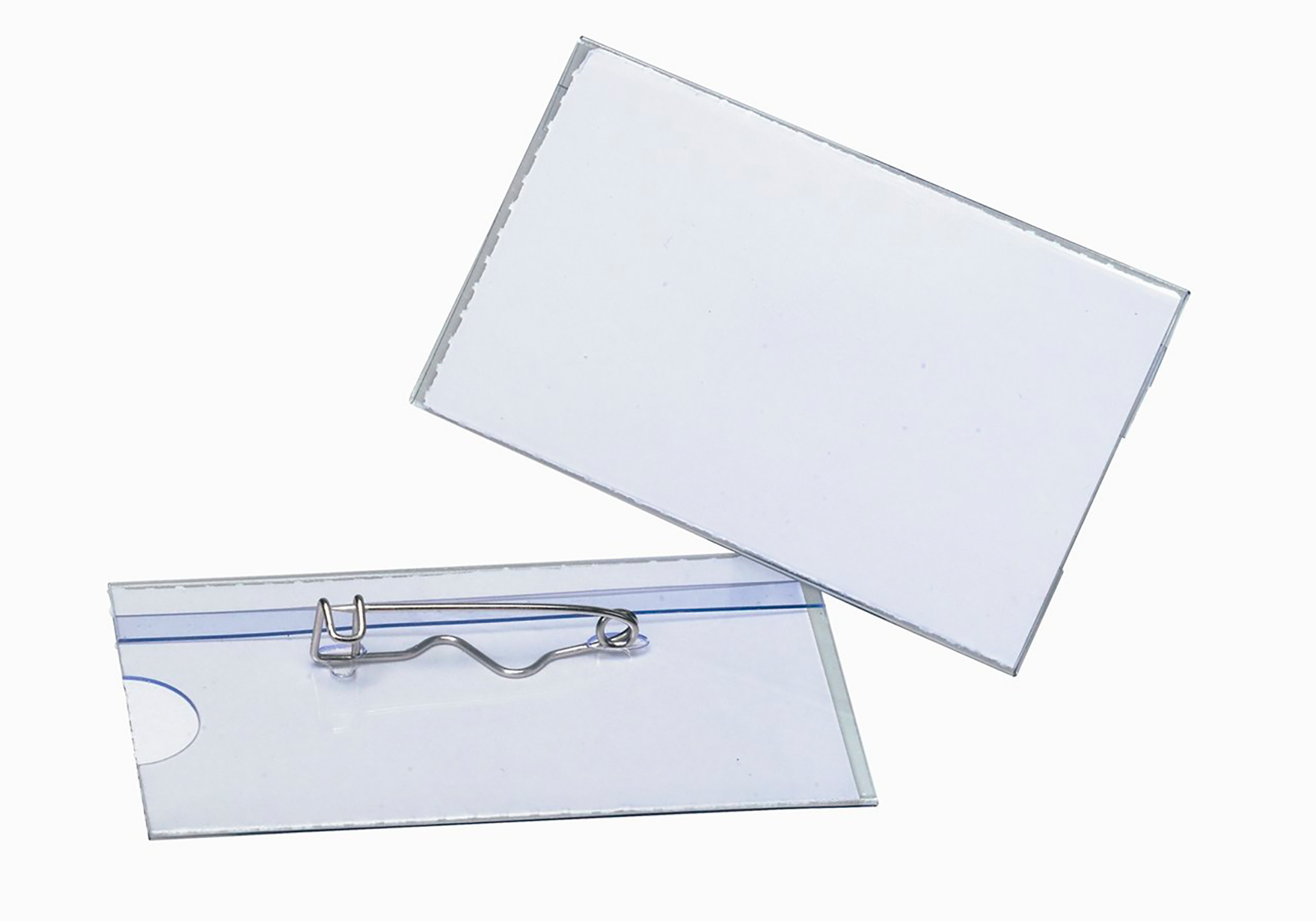 Kongresmærke i klar plast med sikkerhedsnål. Med etiketark lige til at printe.