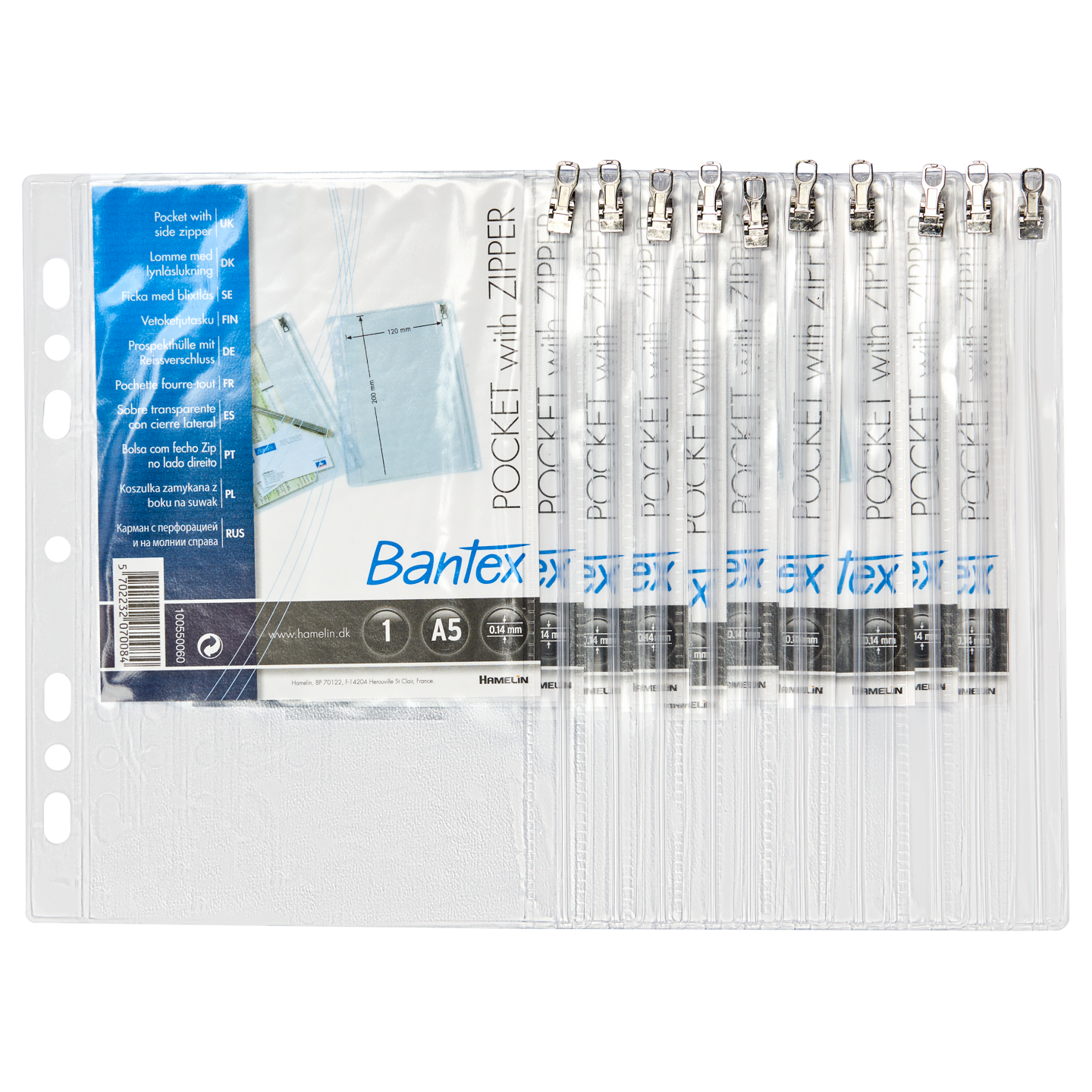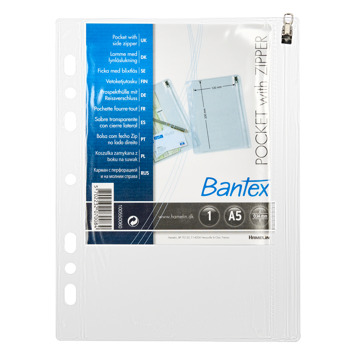 Lynlåslomme med 4 huller til isætning i ringbind og lynlås, påsvejset i højre side. Lommens ydre mål svarer til A5-format. Idéel til opbevaring af løsdele på såvel kontoret som i hjemmet. Indvendig mål: 12 x 20 cm.
