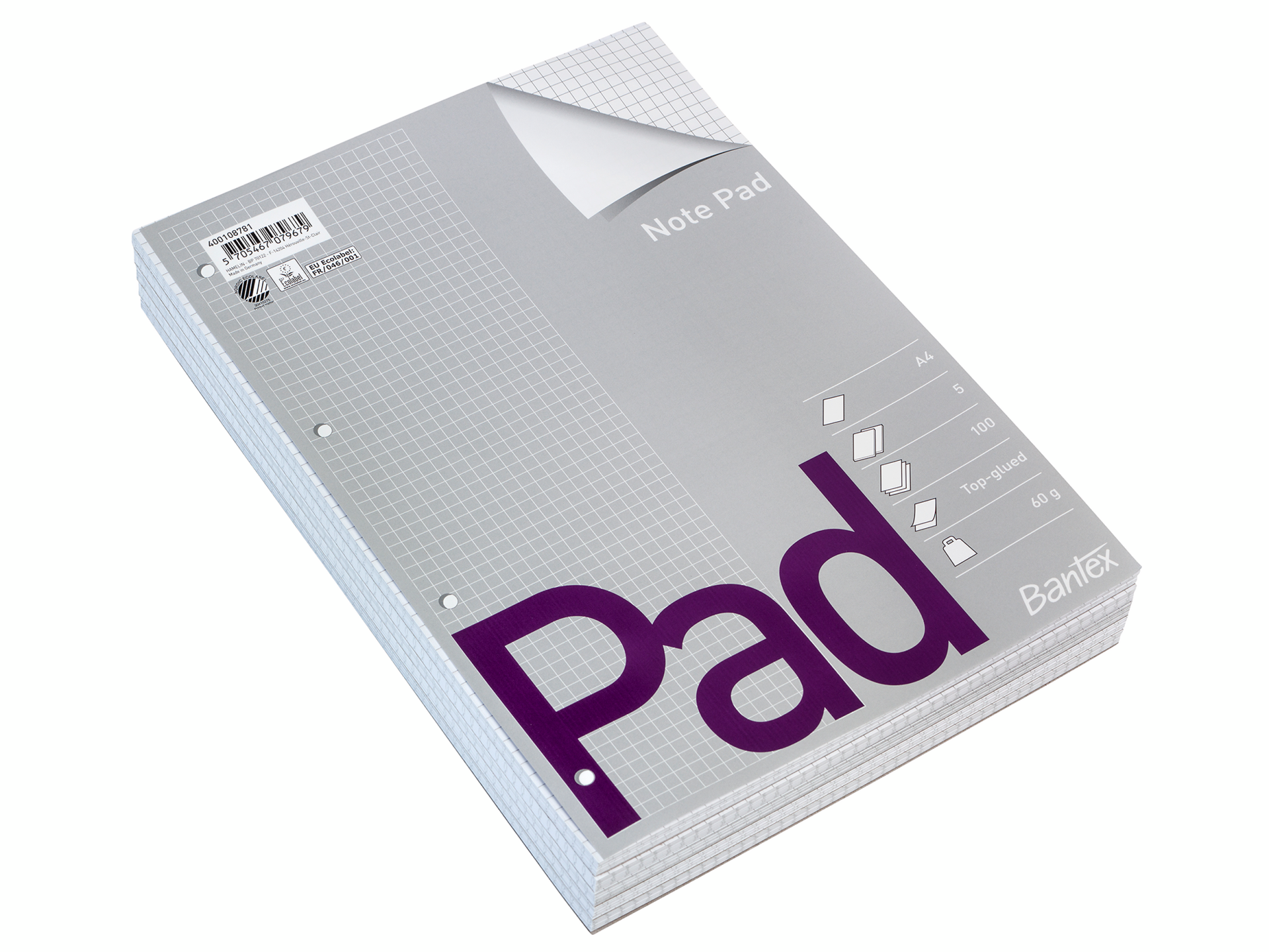 Bantex standardblok, A4, kvadreret, hullet, toplimet