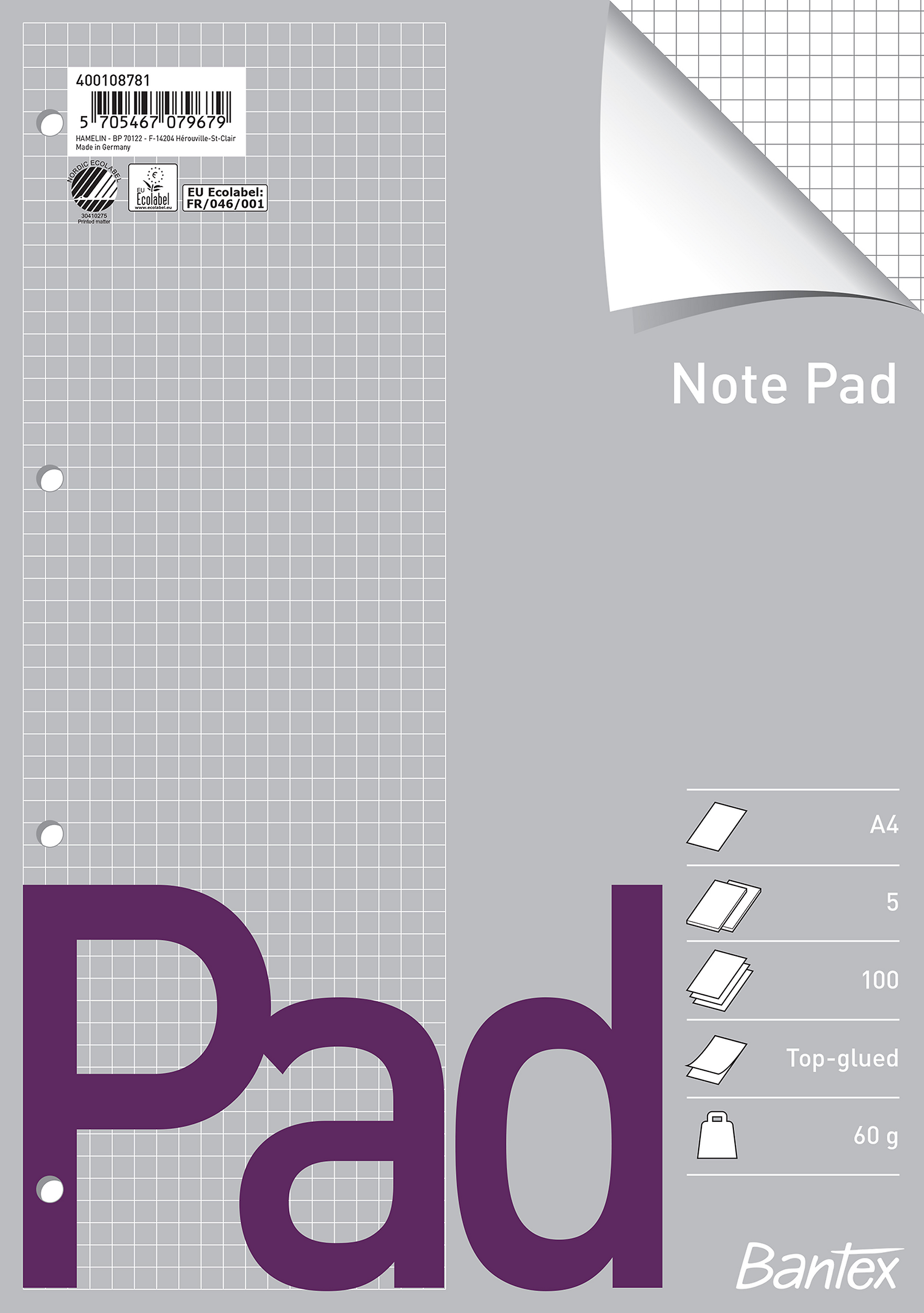 Hvid 60g papir, kvadreret 5x5mmm, hullning (EU). Certificeret med den nordiske svan og EU-ecolabel, der garanterer den reducerede miljøpåvirkning af papirprodukter i hele deres livscyklus, fra råmaterialer til levetid. 100. 4. Nej. Svanemærket. 5 x 5 mm. Toplimet.
