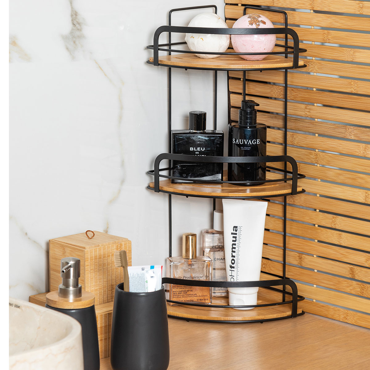 Hjørnehylde til badeværelse i bambus og sort aluminium Elegant hjørnehylde til badeværelset i sortlakeret aluminium og naturfarvet bambus. De tre hylder udnytter pladsen i hjørnet optimalt og giver rigelig opbevaringsplads til alt fra sæbe og shampoo til cremer og parfumer. De halvrunde hylder i bambus skaber en varm kontrast til den slanke sorte metalramme, og giver et moderne, men indbydende udtryk. Hylden kan nemt anvendes andre steder i hjemmet, f.eks. som krydderihylde til køkkenet eller som parfumehylde til soveværelset. Den åbne konstruktion giver nem adgang til dine produkter. Hylden kan placeres frit på bordet eller monteres på væggen med skruer eller selvklæbende kroge (medfølger ikke). 49 x 19,5 x 19,5 cm