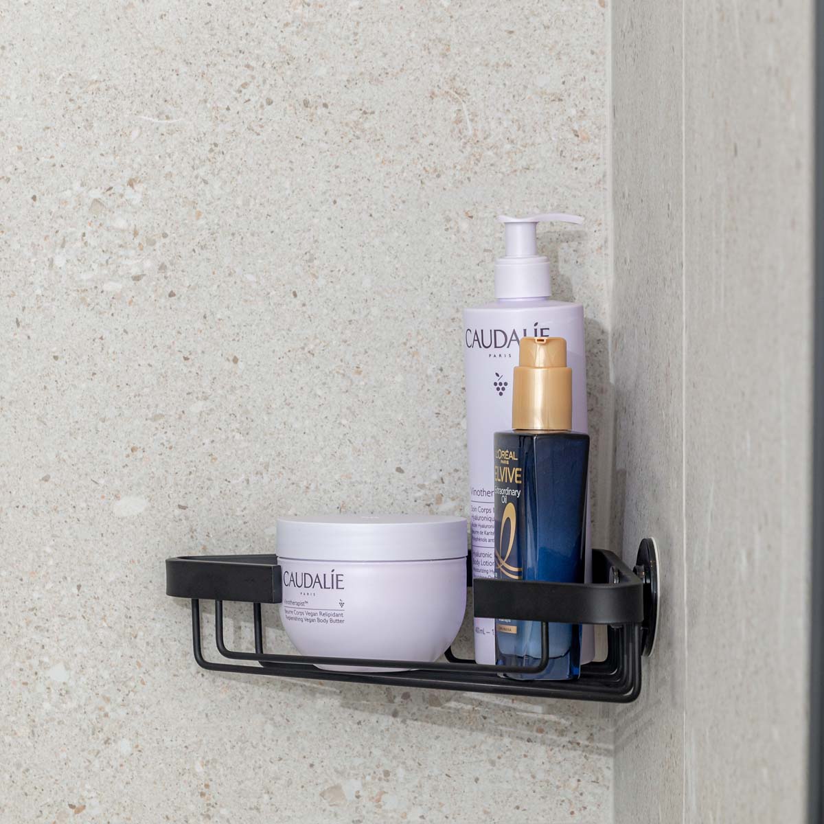 Hjørnehylde til bad sort aluminiumDenne hjørnehylde i sortlakeret aluminium er den ideelle løsning til dig, der ønsker diskret og funktionel opbevaring i brusenichen. Med sit trekantede design udnytter den hjørnerne i badeværelset optimalt, så du får ekstra opbevaringsplads uden at fylde for meget visuelt. Den åbne konstruktion sikrer hurtig afdrypning og en hygiejnisk opbevaring af dine favoritprodukter. Det matte, sorte aluminium giver et moderne og stilrent udtryk.Hjørnehylden kan monteres med eksempelvis selvklæbende kroge, hvis du vil undgå at bore i fliserne. Monteringsudstyr medfølger ikke, så du har fuld frihed til at vælge den løsning, der passer bedst til dine behov.6,4 x 25,2 x 16,7 cm