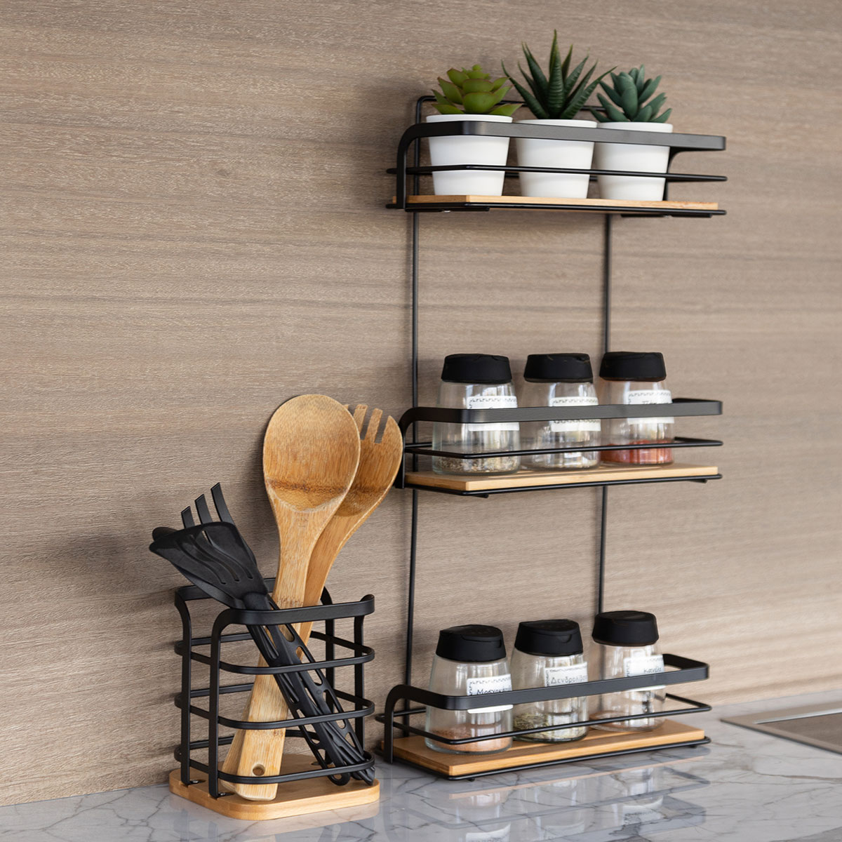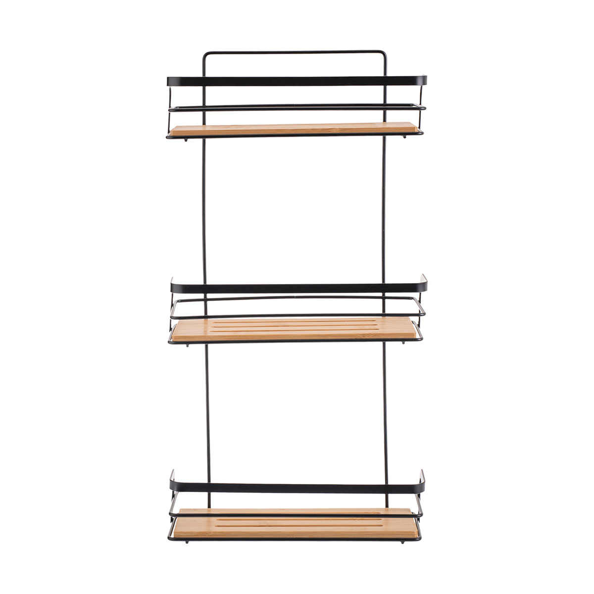 Badeværelseshylde i bambus og sort aluminium Denne stilrene badeværelseshylde kombinerer naturlig bambus med sortlakeret aluminium i et elegant og funktionelt design. Med tre åbne hylder får du masser af opbevaringsplads til alt fra cremer og sæber til parfumer. Det åbne design giver ikke bare luft og lethed, men gør også rengøring nem og praktisk. Hylden kan nemt anvendes andre steder i hjemmet, f.eks. som krydderihylde til køkkenet eller som parfumehylde til soveværelset. Hylden kan enten stilles direkte på bordet eller hænges op på væggen. Den kan monteres med skruer eller stærke selvklæbende kroge, alt efter hvad der passer bedst til dit rum. Monteringsudstyr medfølger ikke, så du har frihed til at vælge din foretrukne løsning. Mål: 49 x 25,5 x 10,5 cm