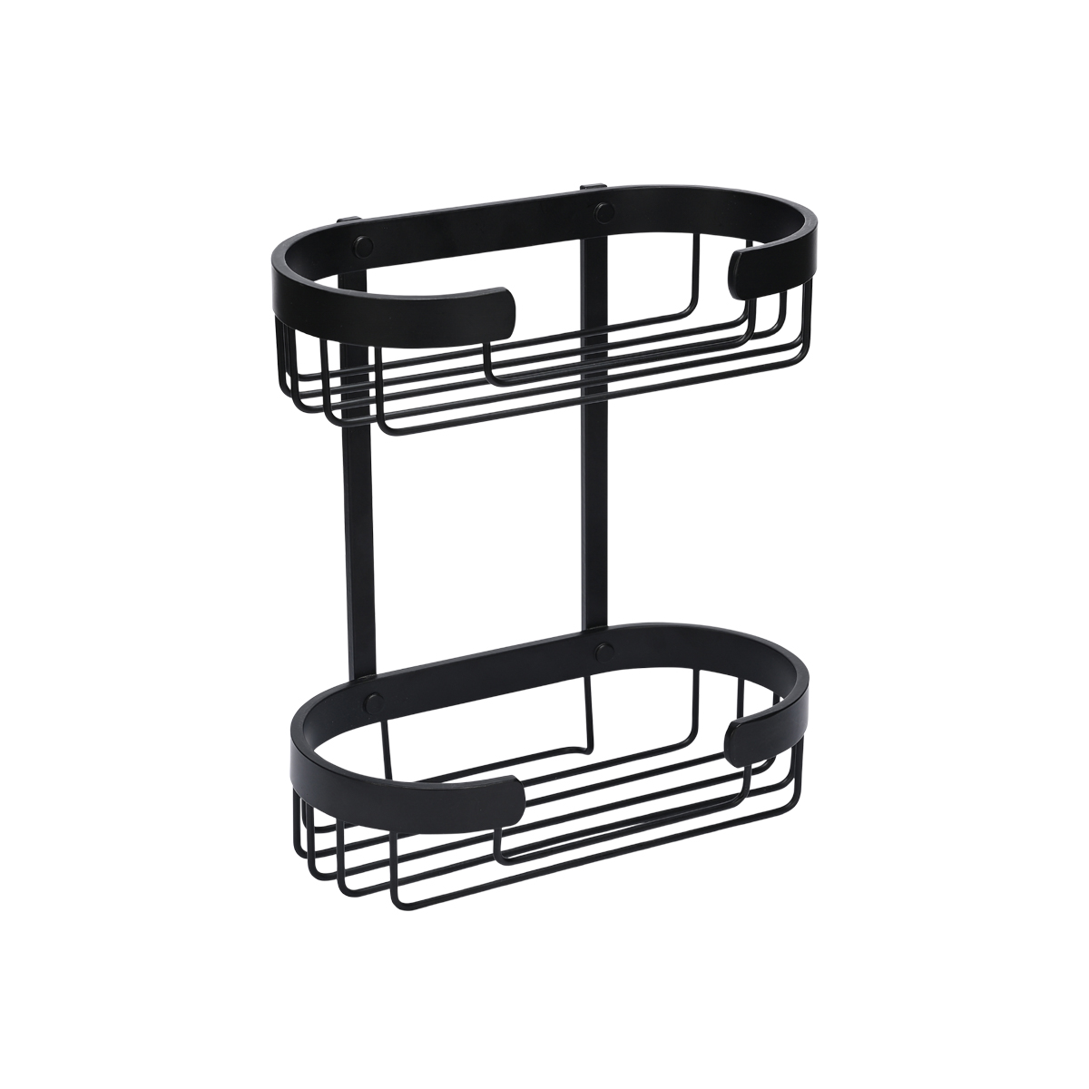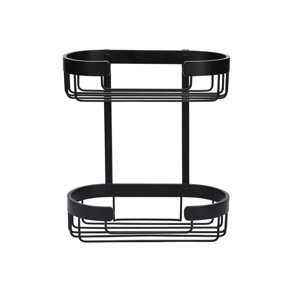 Dobbelt brusehylde sort aluminium Giv dine badeprodukter en fast plads med denne dobbelte brusehylde i sortlakeret aluminium. Den todelte konstruktion giver ekstra opbevaringsplads i højden og gør det nemt at adskille f.eks. shampoo og sæbe fra andre badeprodukter – alt sammen samlet ét sted, uden rod. Det åbne design bidrager til hurtig afdrypning og et rent udtryk i brusenichen. Materialet er pulverlakeret aluminium, som er velegnet til brug i fugtige omgivelser og samtidig giver et stilrent, mat finish. Hylden kan monteres uden at bore f.eks. med selvklæbende kroge (medfølger ikke). 28,4 x 25,2 x 13,2 cm