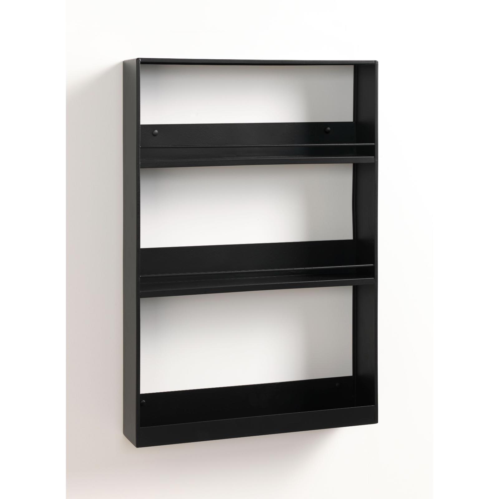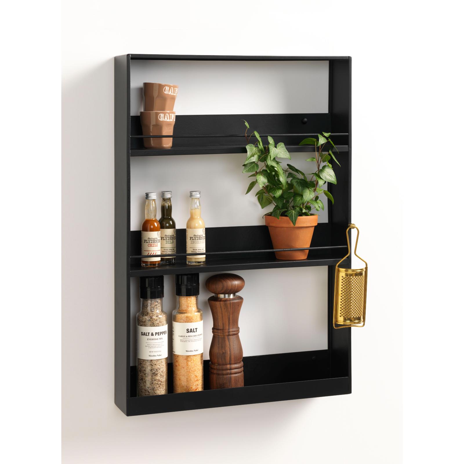 Sort metal væghylde Denne sorte væghylde i metal er en praktisk og stilren løsning til opbevaring. Med tre hylder giver den god plads til kopper, glas, parfumer eller krydderier – alt efter hvor du vælger at hænge den op. Væghylden passer perfekt i køkkenet, stuen, entréen eller på kontoret, hvor den både fungerer som opbevaring og som et dekorativt element. Den sorte, pulverlakerede overflade giver et roligt og moderne udtryk, der passer ind i de fleste hjem. Hylden er fremstillet i metal, hvilket gør den både stabil, holdbar og magnetisk. Den monteres nemt direkte på væggen gennem de 6 diskrete skruehuller (skruer medfølger ikke). Mål: 40 x 60 x 10 cm Afstand mellem hylderne: 15,5cm 19,5cm 22cm