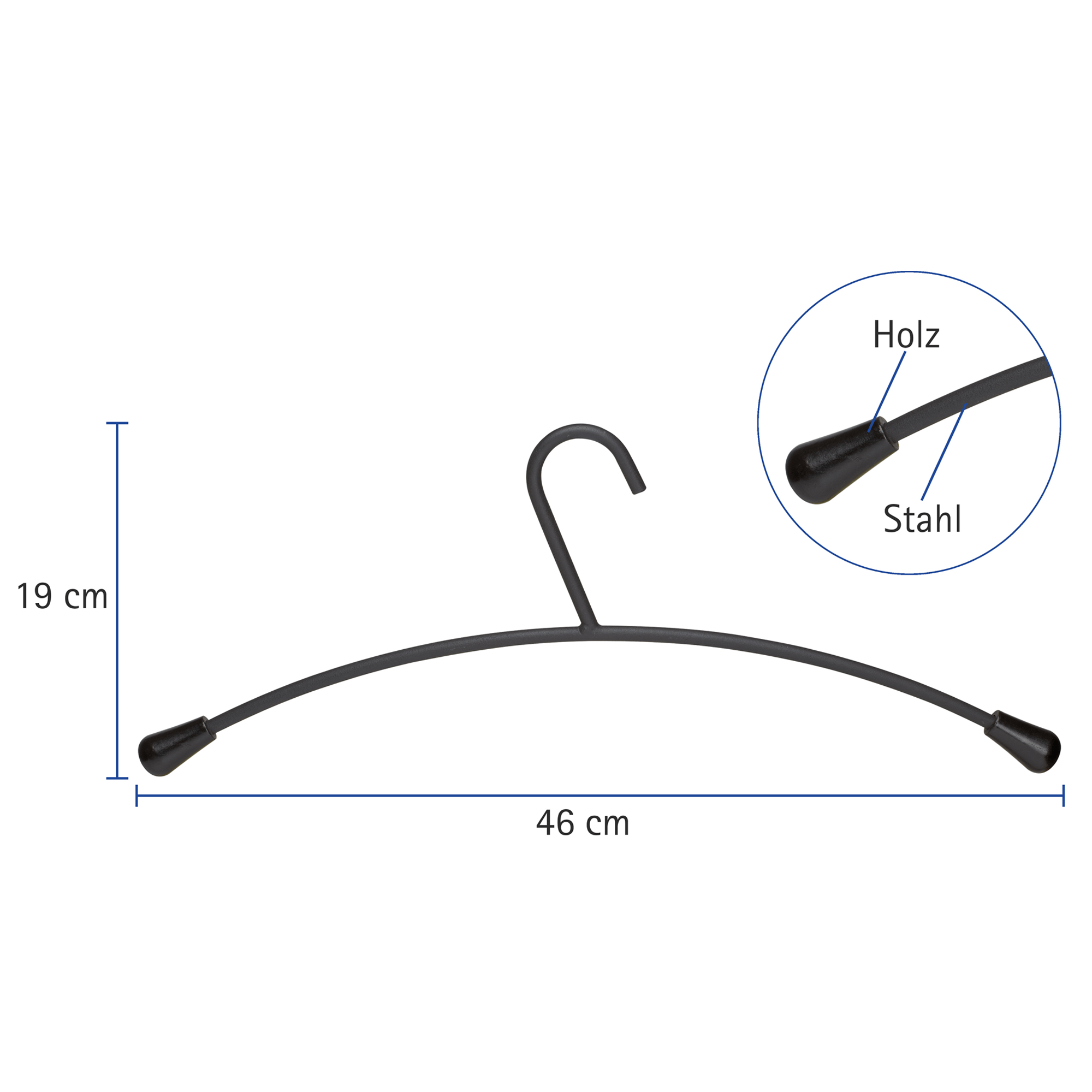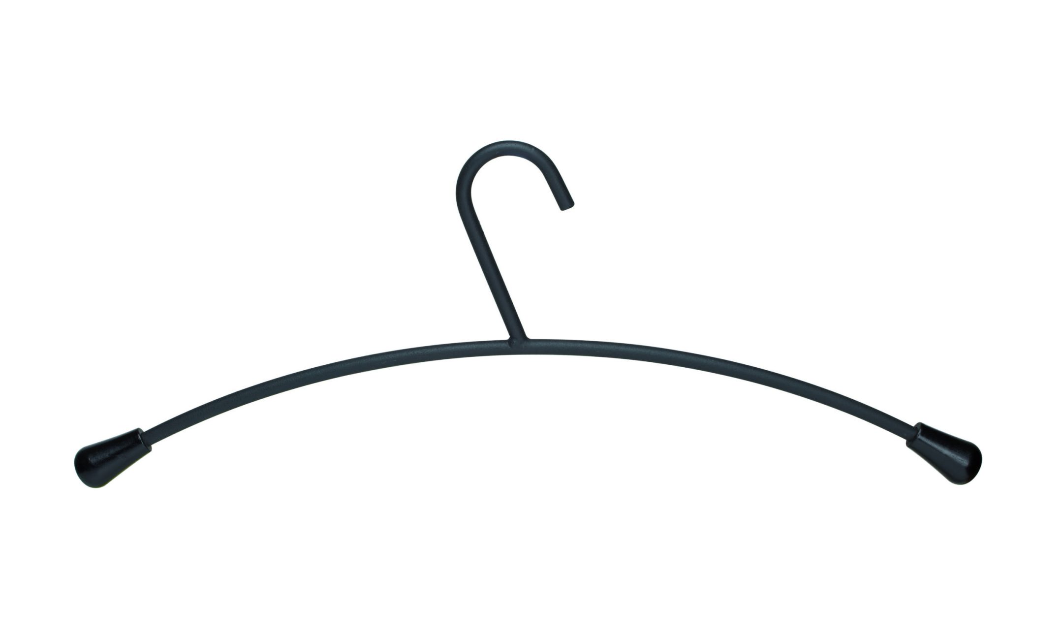 Højkvalitets bøjler, pulverlakeret i mat sort stål Størrelse 46 x 19 cm. Krog Ø 5,5 cm 5 stk. Beskyttelsesender i sort lakeret træ. Enkelt design med høj stabilitet. Bøjlerne er særligt velegnet til at hænge overtøj på tøjstativer og stumtjenere i receptions- og kontorområder. Stabil: Går ikke i stykker, hvis den tabes ved et uheld. Kan bruges til tørt og vådt tøj. Elastisk der også gør dem velegnet til tunge jakker.