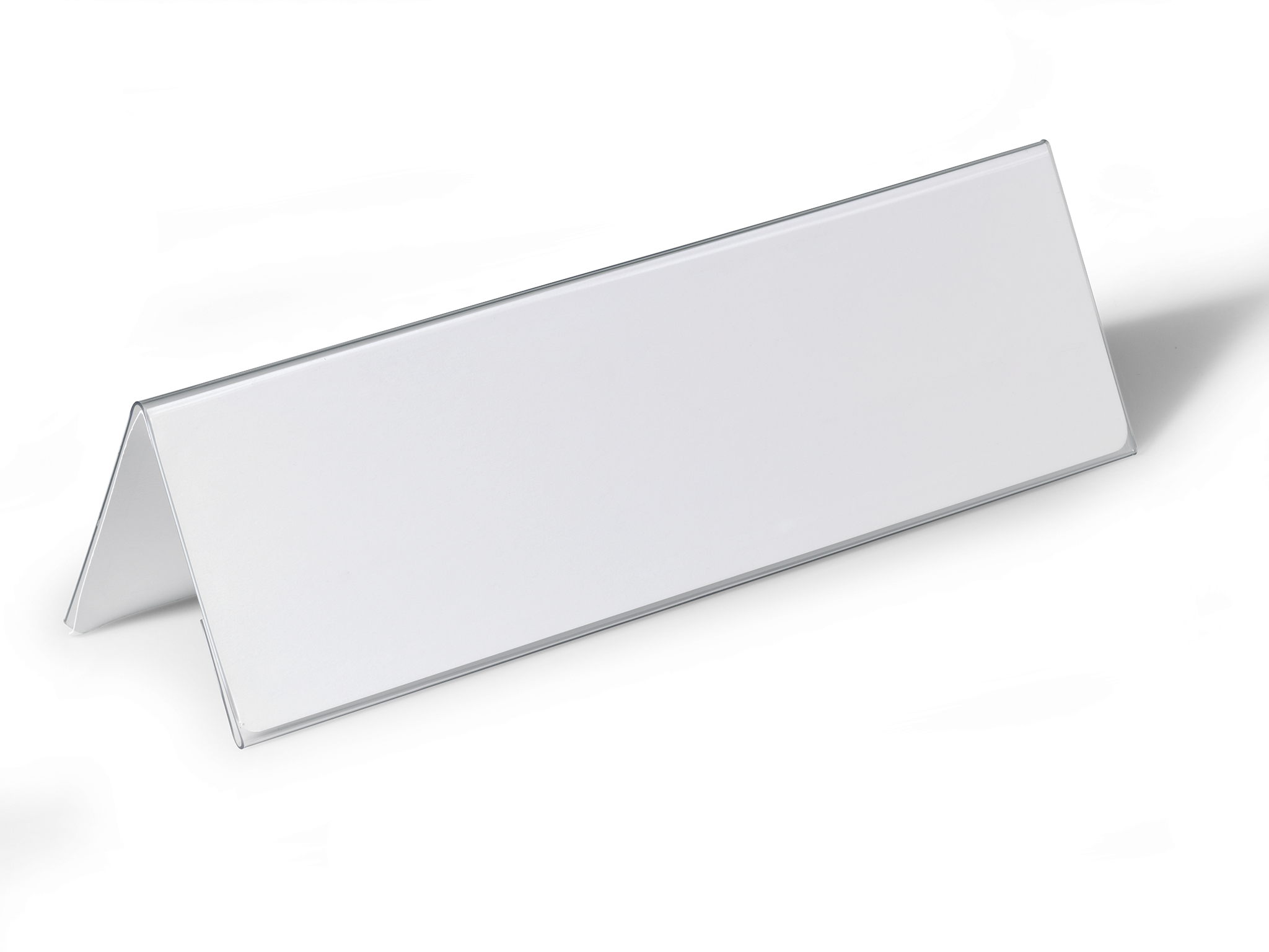 Holder til bordnavnekort til konferencer, mødet, prisskilte m v. Aflæses fra to retninger. Indstik medfølger. Mål indstik: 105/210x297mm (HxB). Design selv en personlig designet bordnavneskilte med gratis skabelon på www.duraprint.eu.