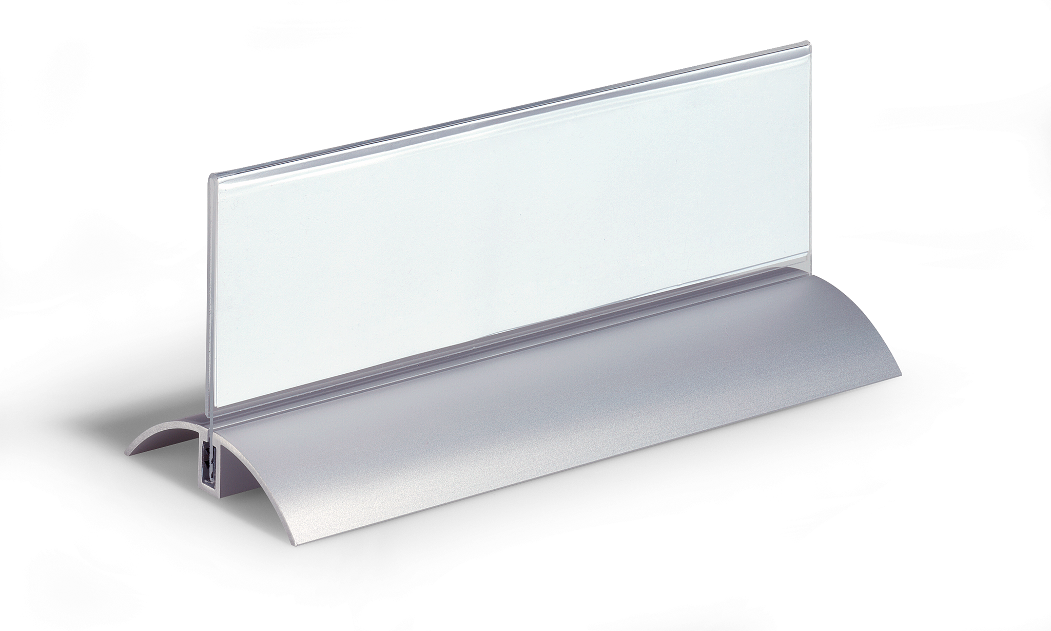 stilren bordskilte til konferencer, mødet, prisskilte, receptioner m v. Skilte i klar akryl, læseligt fra begge sider. Fod af aluminium. Et unikt bremsesystem i foden gør at selve skiltet altid holdes på plads. Indstik medfølger. Mål indstik: 61/122x210mm (HxB). Indstiksetiket på A4 ark til udskrivning i printer kan bestilles separat (Durable art nr. 146002). Design selv en personlig designet bordnavneskilte med gratis skabelon på www.duraprint.dk