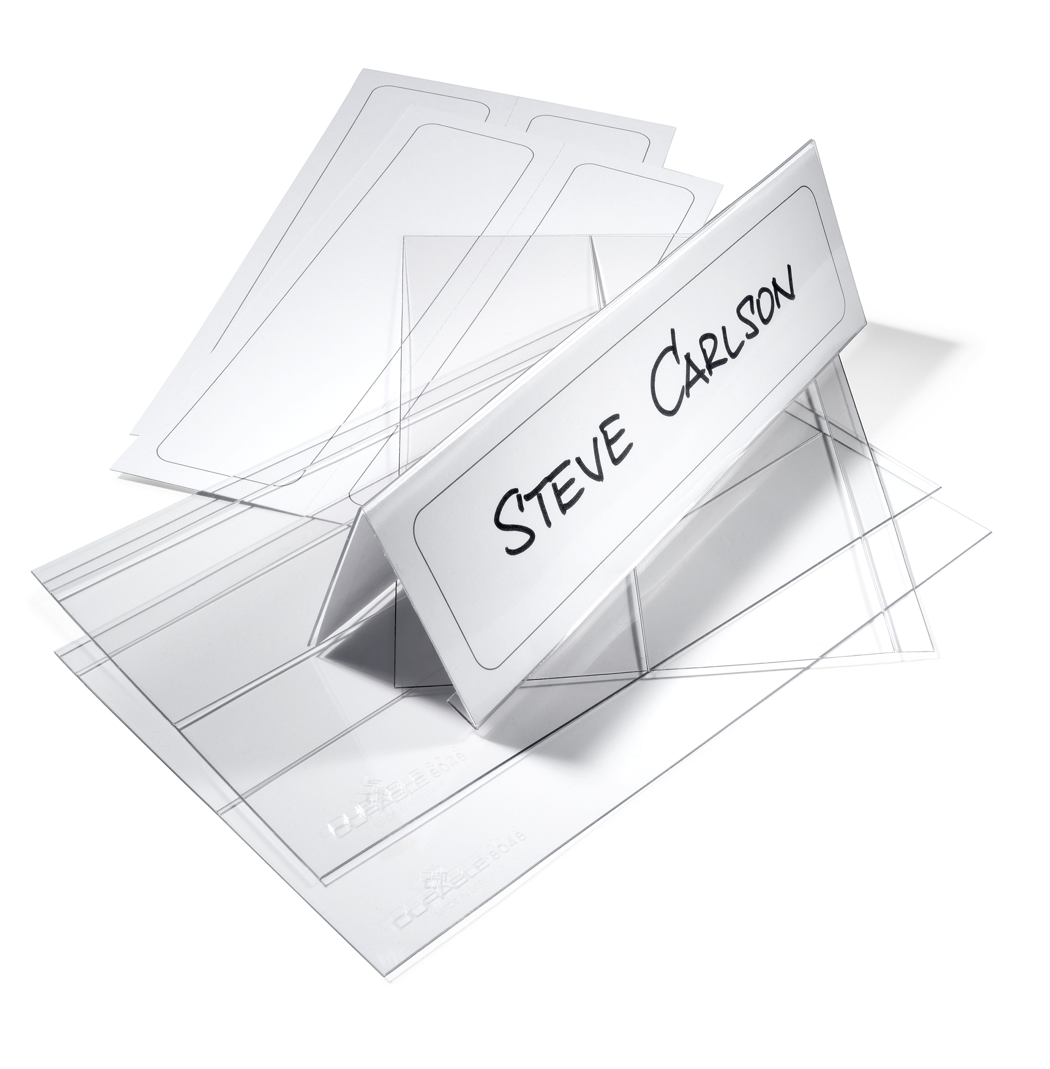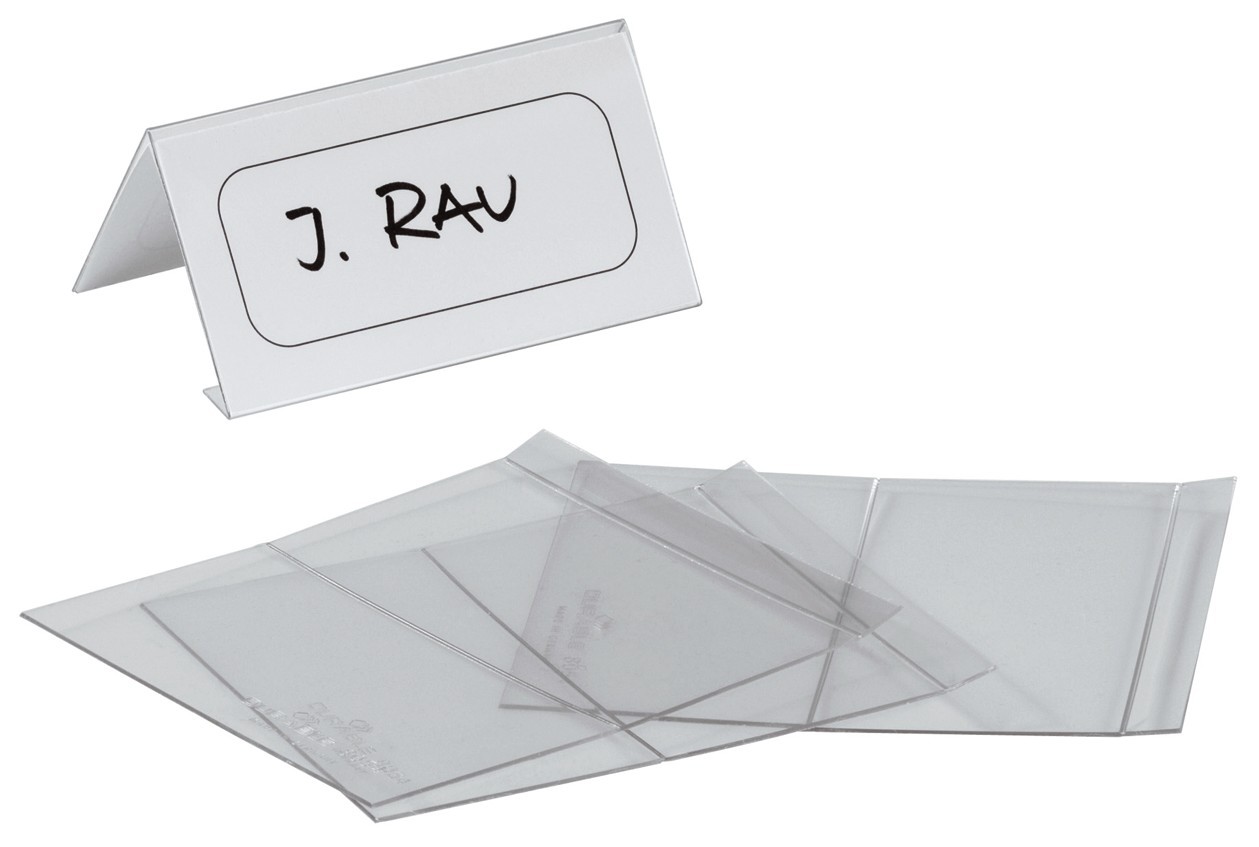 Holder af PET til bordnavnekort til konferencer, mødet, prisskilte m v. Bordskiltet er udfoldet og perforeret. Foldes og bukkes som et omvendt V. Aflæses fra to retninger. Indstik medfølger. Mål indstik: 61/122x210mm (HxB). Indstiksetiket på A4 ark til udskrivning i printer kan bestilles separat (Durable art nr 146002). Design selv en personlig designet bordnavneskilte med gratis skabelon på www.duraprint.dk