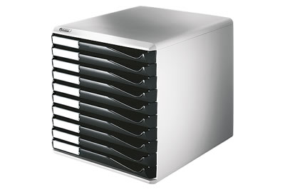 Leitz skuffekabinet med 10 skuffer til format A4. Letglidende skuffer med udtræksstop. H29,1xB29,2xD35,2 cm.