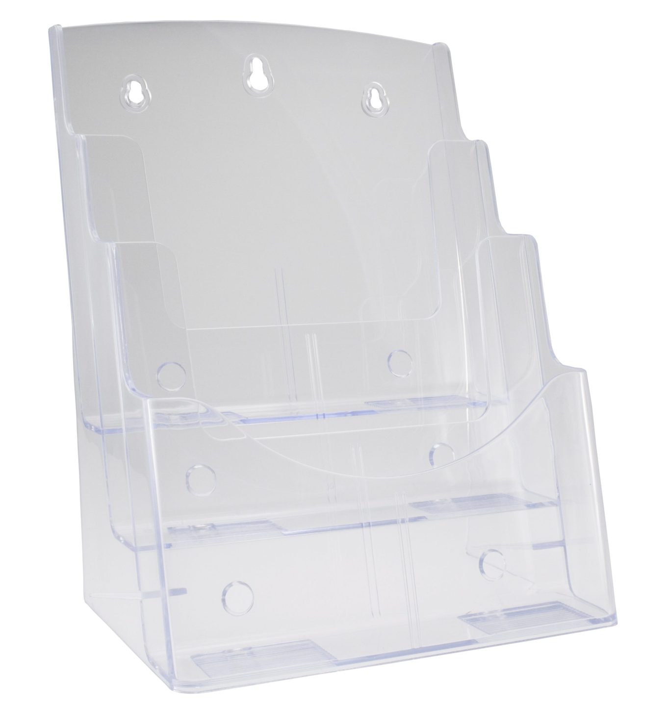 A4 brochureholder til placering på bord eller ophæng på væg. Holderen har 3 rum og egner sig særligt godt til præsentationer