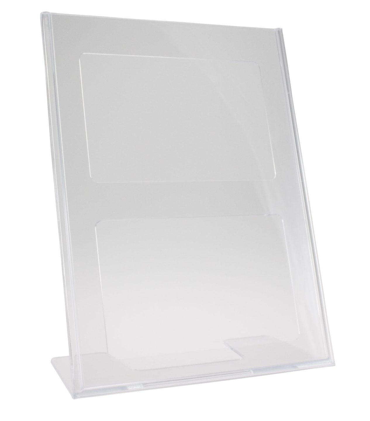 Brochureholder med L-fod der bøjer let bagud, hvilket gør det nemt at læse holderens indhold.
