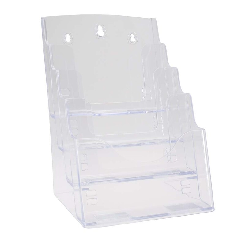A5 Brochureholder med fire rum. Fremstillet af støbt plexiglas for optimal holdbarhed. Hul til montering på væg. Ideel i butikker, på kontor, i receptioner mm. Præsenter dine brochure, flyers eller kampagneark på en flot og overskuelig måde. Vi har både borddisplays, som er gode til receptioner, kontorer og butiksdiske samt vægmonterede brochuredisplays, som er gode til større oplag.