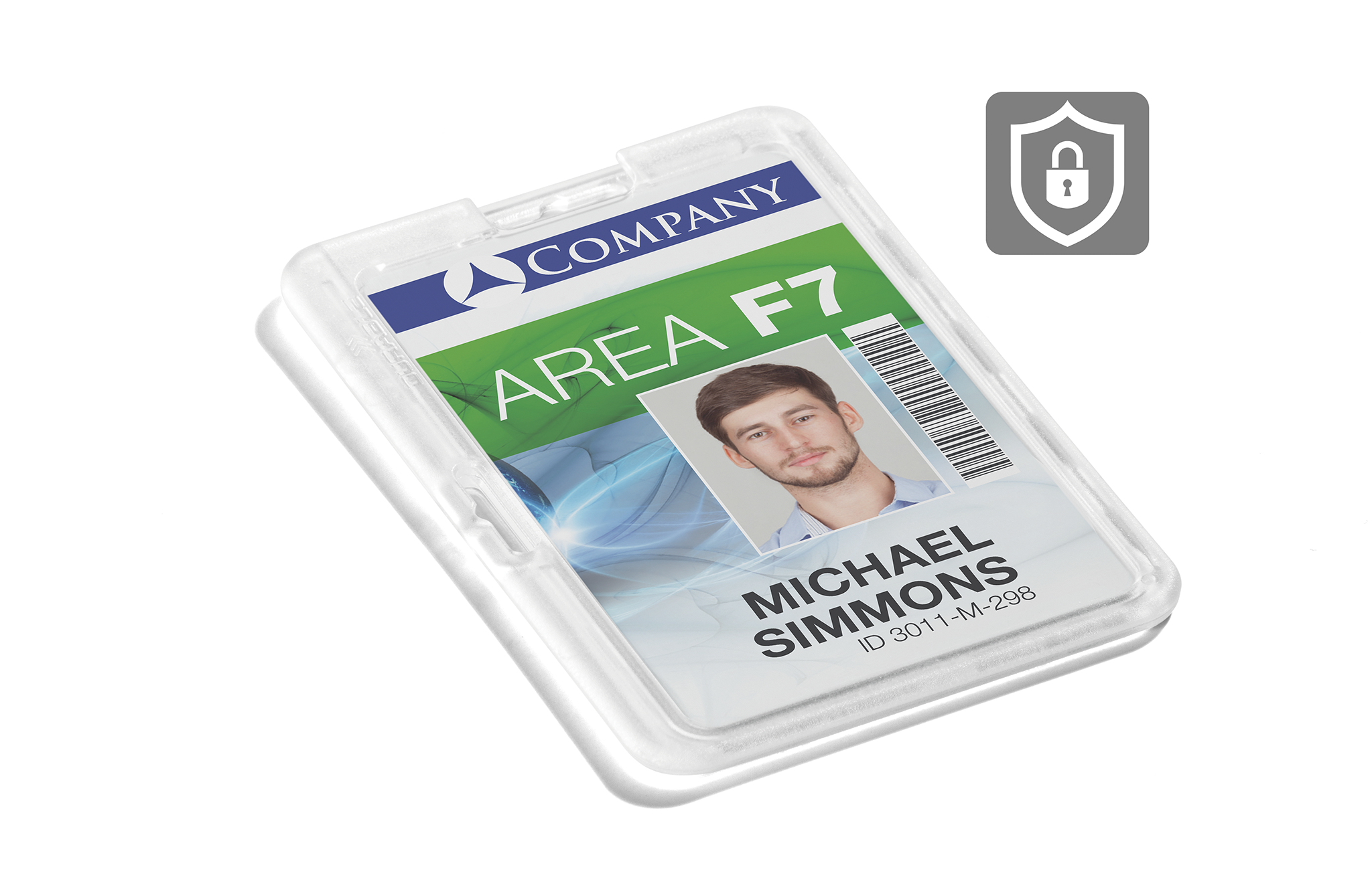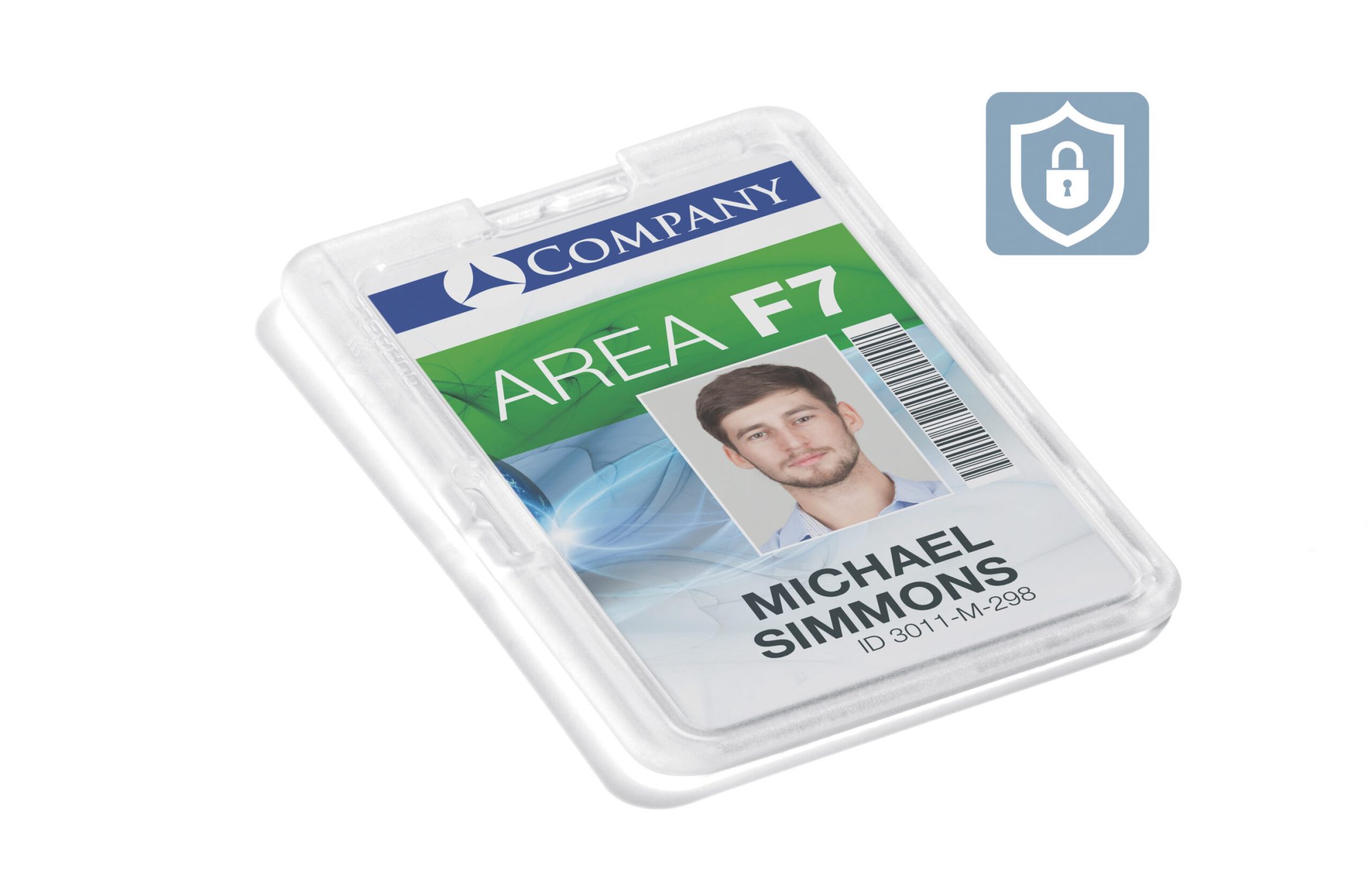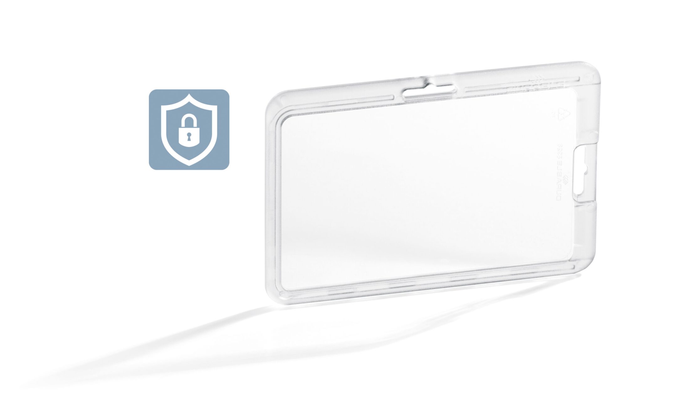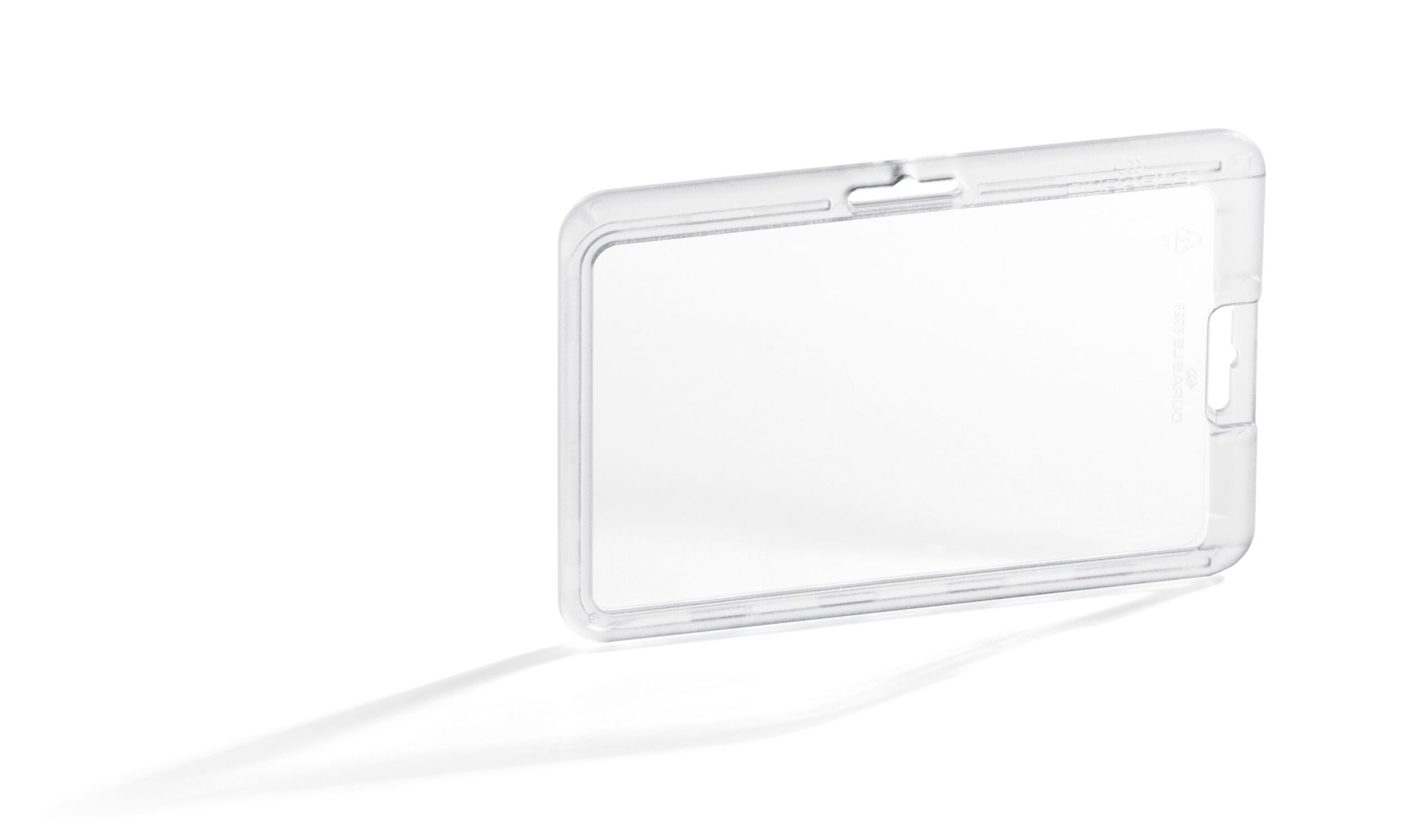 Identitets- og adgangskort skal beskyttes, men stadig være klar til brug. DURABLEs store udvalg af forskellige tilbehør og optimerede kortholdere tilbyder den rigtige løsning for alle. • Kortholder til 1 kort • Meget praktisk på grund af det tynde design • Låsemekanisme til at holde kortet permanent i holderen • Designet til arbejdsområder med høje sikkerhedskrav, da kortet ikke kan fjernes fra holderen • Ikke egnet til kort med chips eller kort med magnetstriber da disse ikke kan aflæses igennem kortholderen. • Fremstillet af stødsikker polycarbonat • Kan bruges enten med kæde, halssnor eller yoyo • Kan bruges i liggende eller stående format • Indvendige dimensioner: 54 x 87 mm (H x B)
