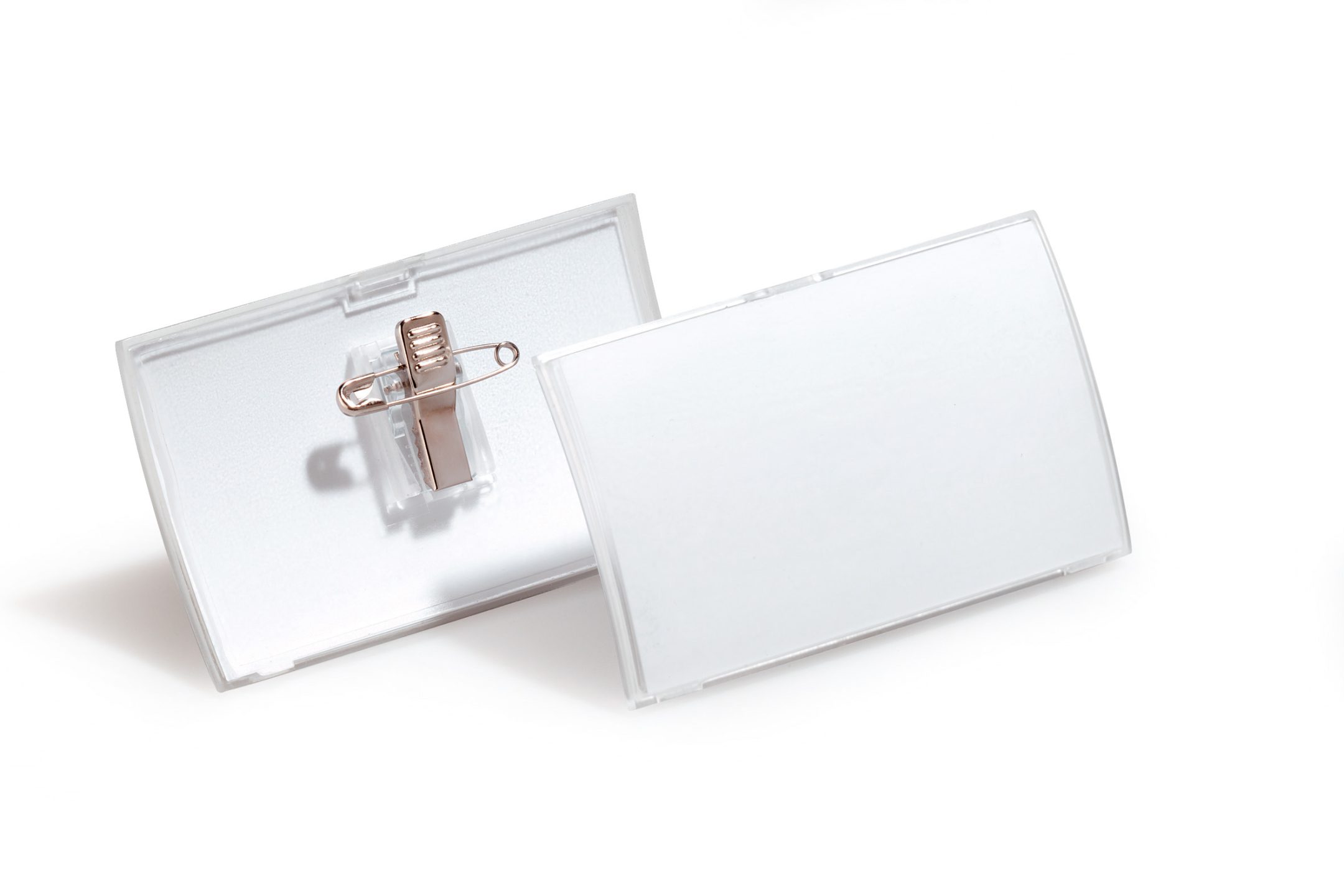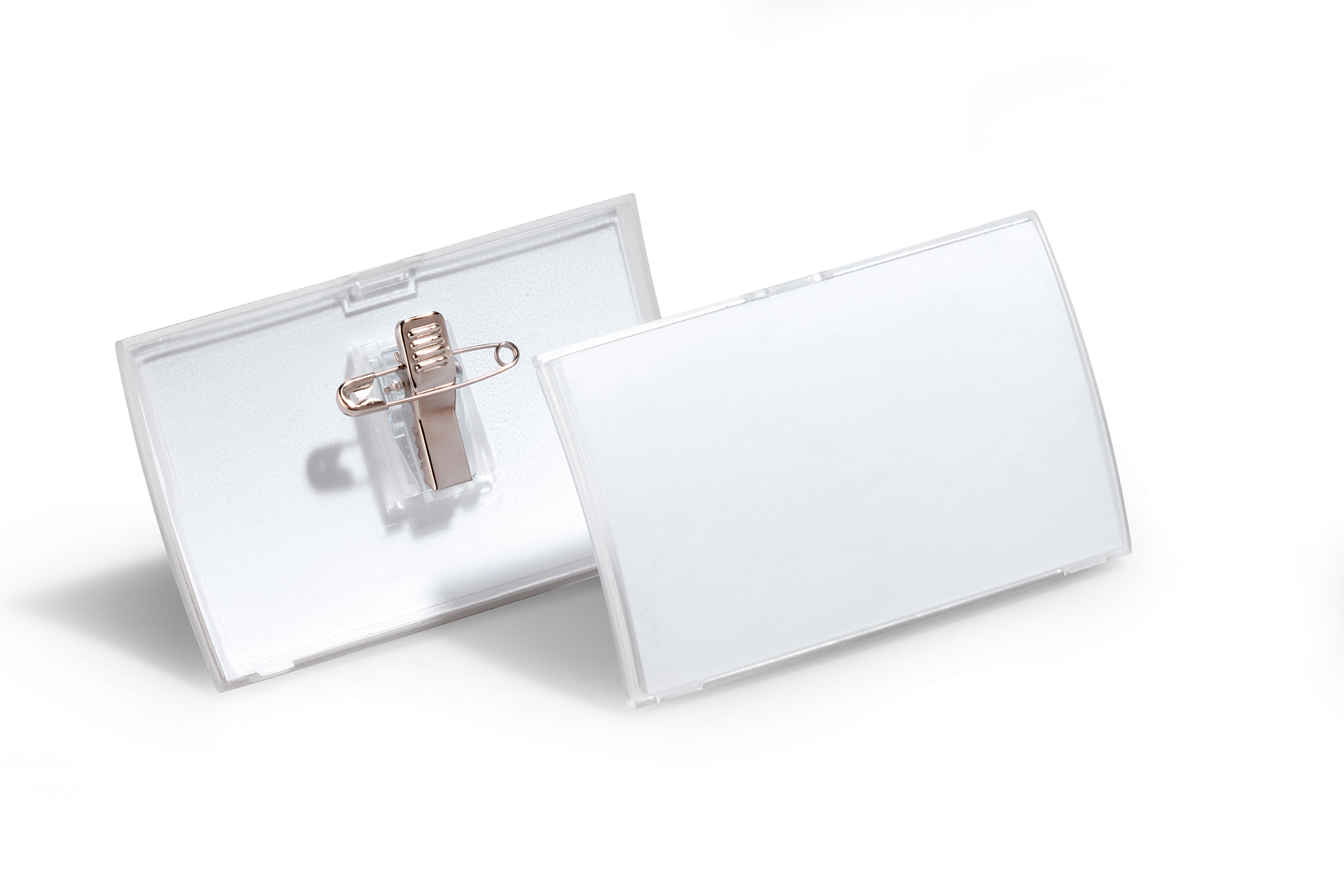 Navneskilt CLICK FOLD i pp-plast med nål/klemme. Kombineret nål/klemme giver valgmulighed for at fastsætte på tøjet. Let buet form, for optimal læsbarhed. For og bagsiden er samlet med et hængsel der gør det enkelt at åbne og lukke. Hurtig udskiftning af indstiksetiketten. Neutrale hvide indstiksetiketter medfølger. Mål indstik: 54x90mm (HxB) Indstiksetiketter på A4 ark til udskrivning i printer kan bestilles separat (Durable art nr 145502). Design selv et personligt kongresmærke ved at anvende det gratis skabelonværktøj på www.duraprint.dk