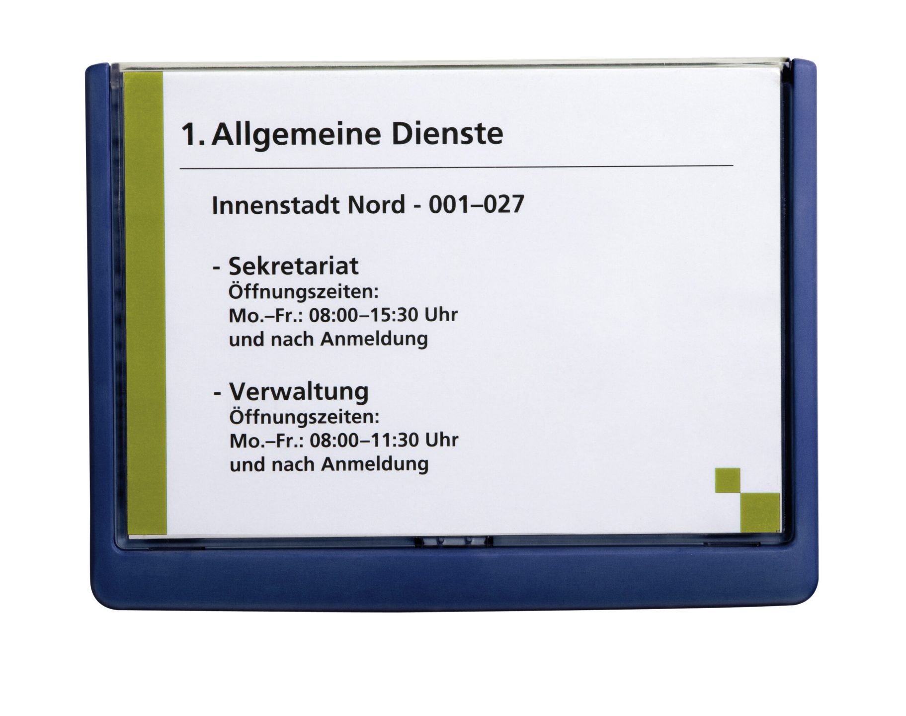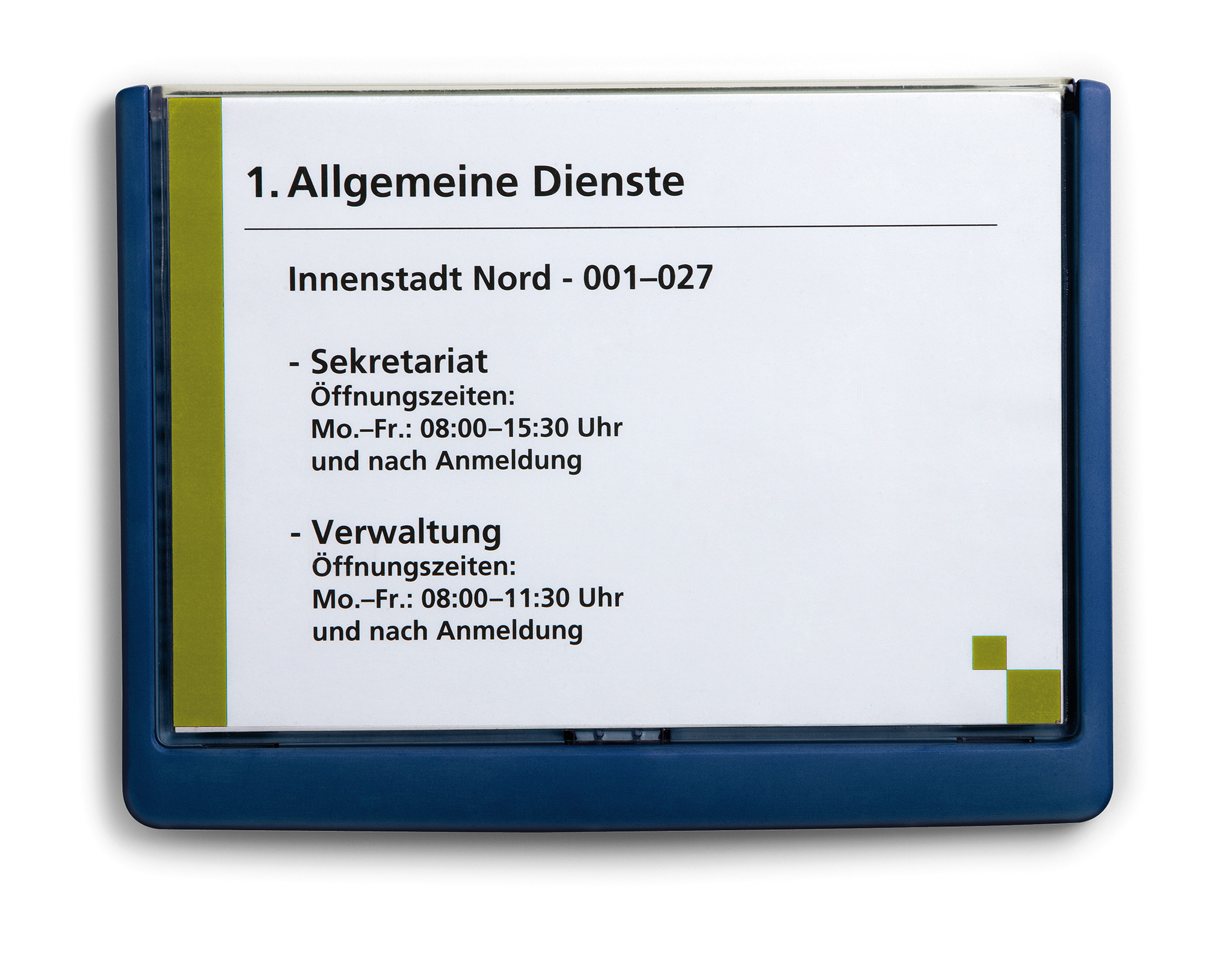 Sortiment af CLICK SIGN-dørskilte af plast i 5 formater Farveinddelinger af områder og etager ved hjælp af 4 forskellige farver Nem udskiftning af kartonindstik ved at skubbe det gennemsigtige frontpanel helt ud Egnet til anvendelse i stor skala, f.eks. på skoler, sygehuse, gastronomi osv. Med monteringssæt, boreskabelon og vejledning til fastgøring med skruer eller klæbning Passende printbare kartonindstik kan bestilles separat Til indstik A5 (210 x 148 mm)