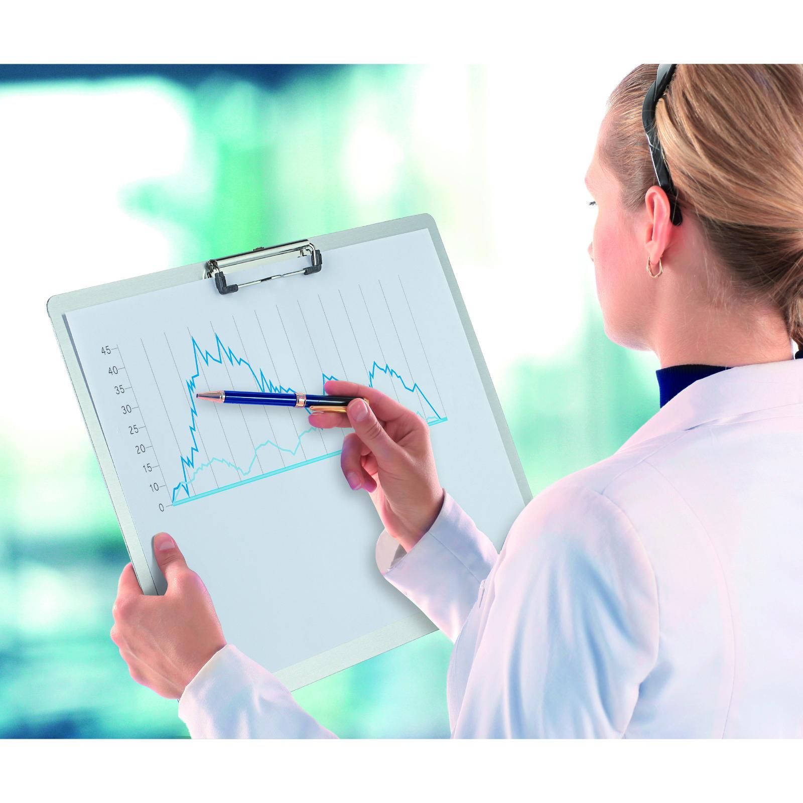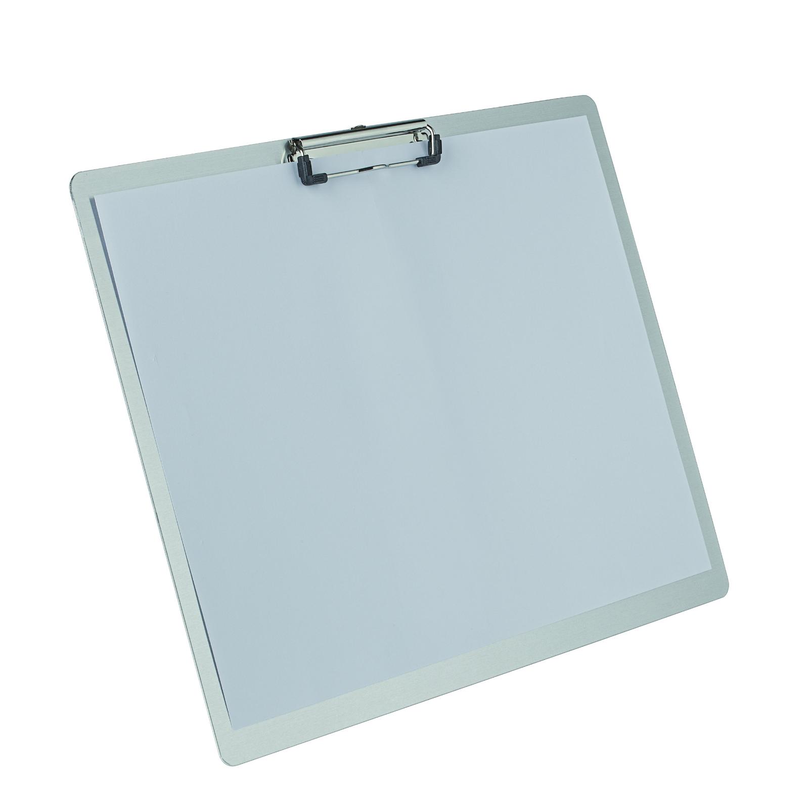 Aluminium clipboard A3 landskab fra MAUL Dette clipboard i A3-format er fremstillet i aluminium og giver en solid og stabil skriveflade, når du arbejder uden fast skrivebord. Det er ideelt til brug på kontor, lager, i produktion, undervisning eller ved møder. Klemmen er placeret på den lange side, så dokumenterne holdes i landskabsformat. Den kraftige metalklemme har en åbning på ca. 0,8 cm og kan fastholde flere ark ad gangen. Øverst er clipboardet udstyret med en praktisk, udtrækkelig ophængskrog, så det nemt kan hænges op, når det ikke er i brug. Den glatte aluminiumsoverflade er slidstærk og nem at rengøre. Den har en tykkelse på 0,1 cm. Mål: 33 x 45 x 1,4 cm