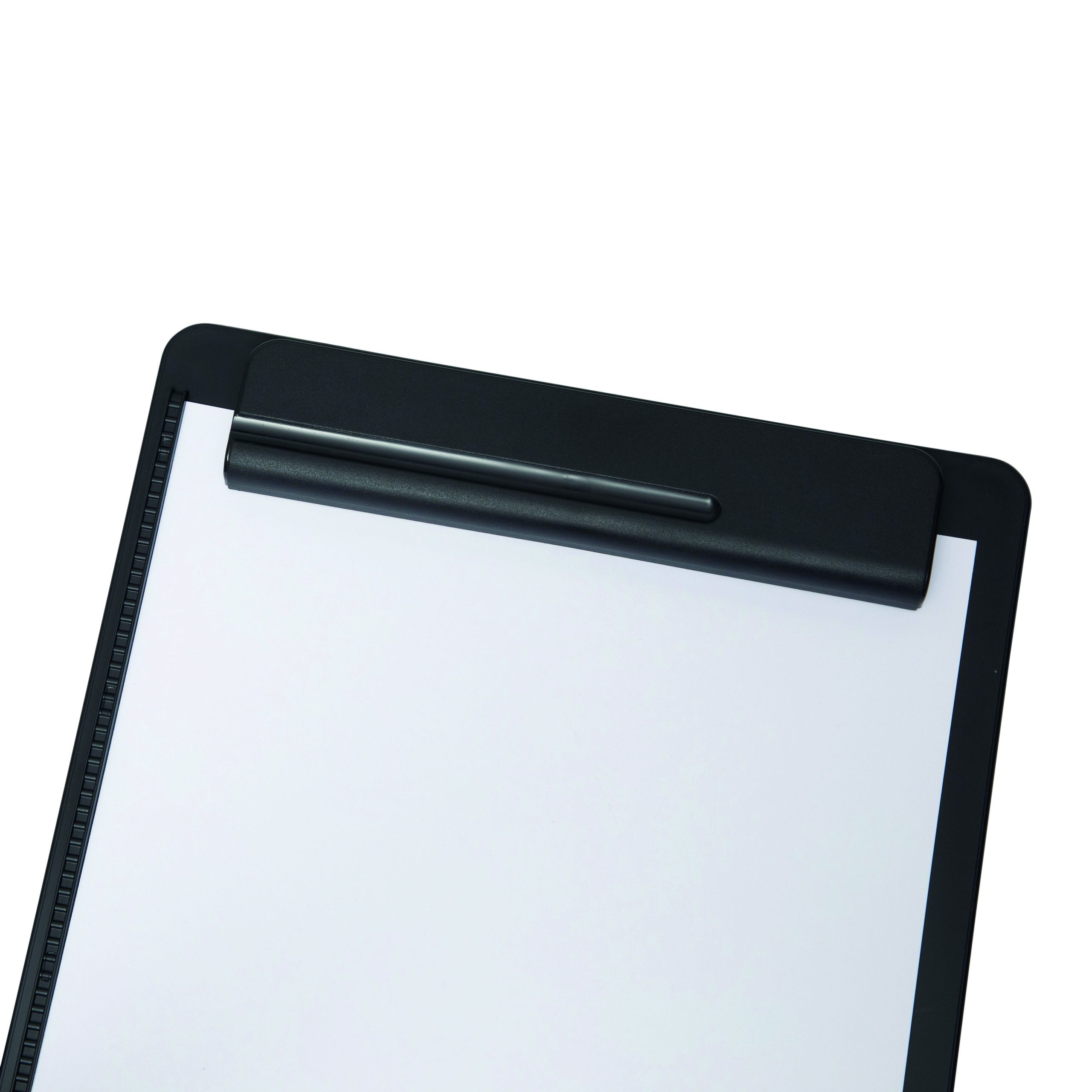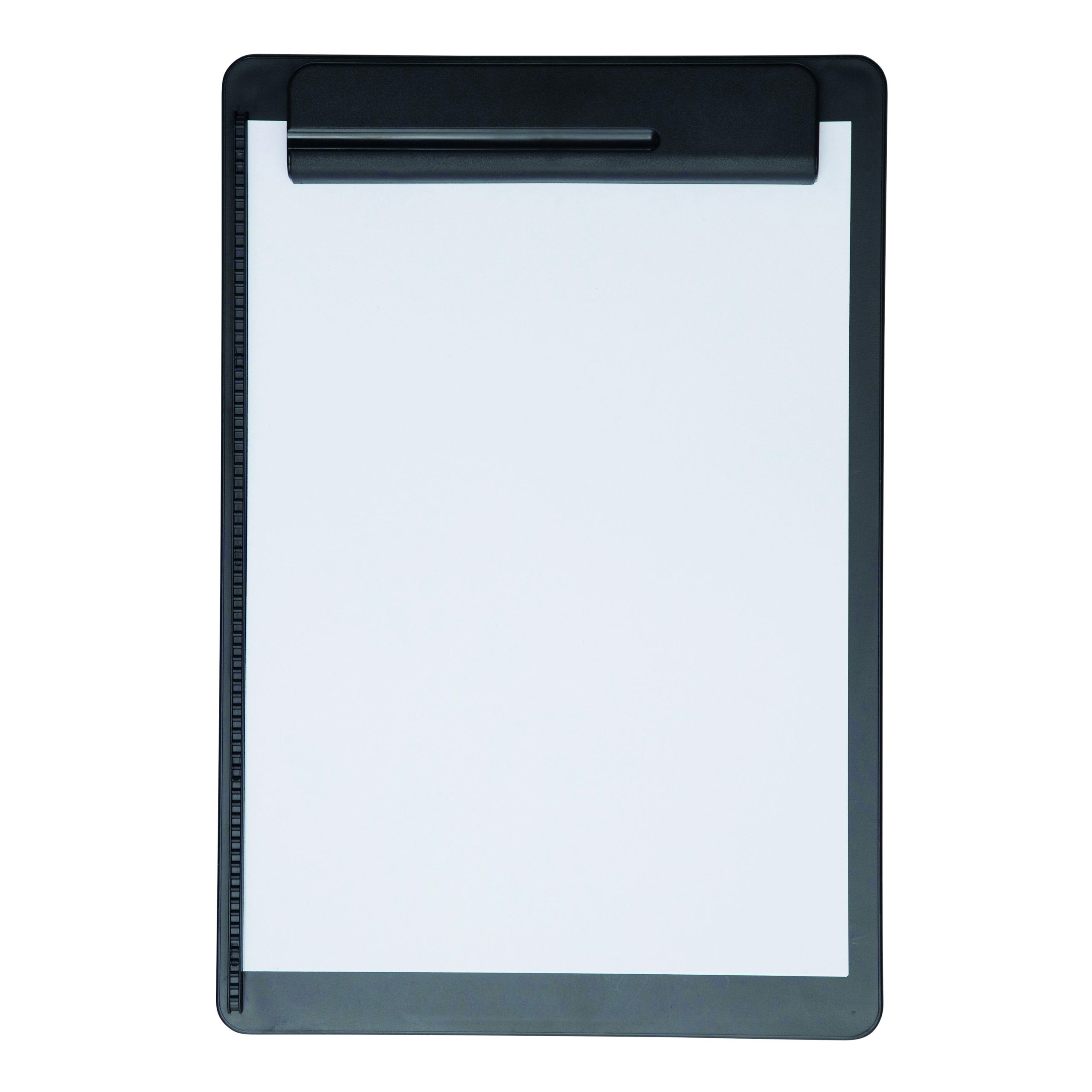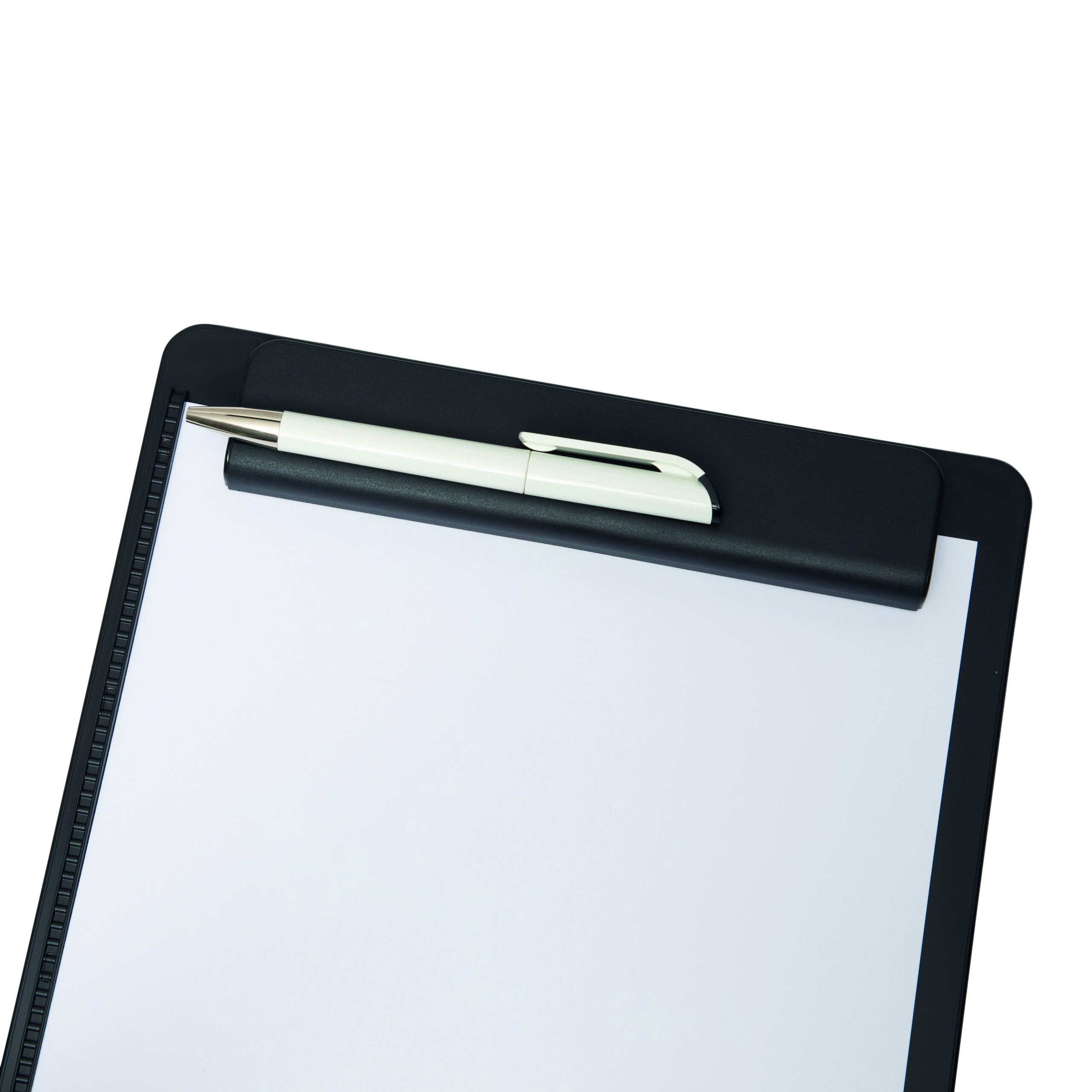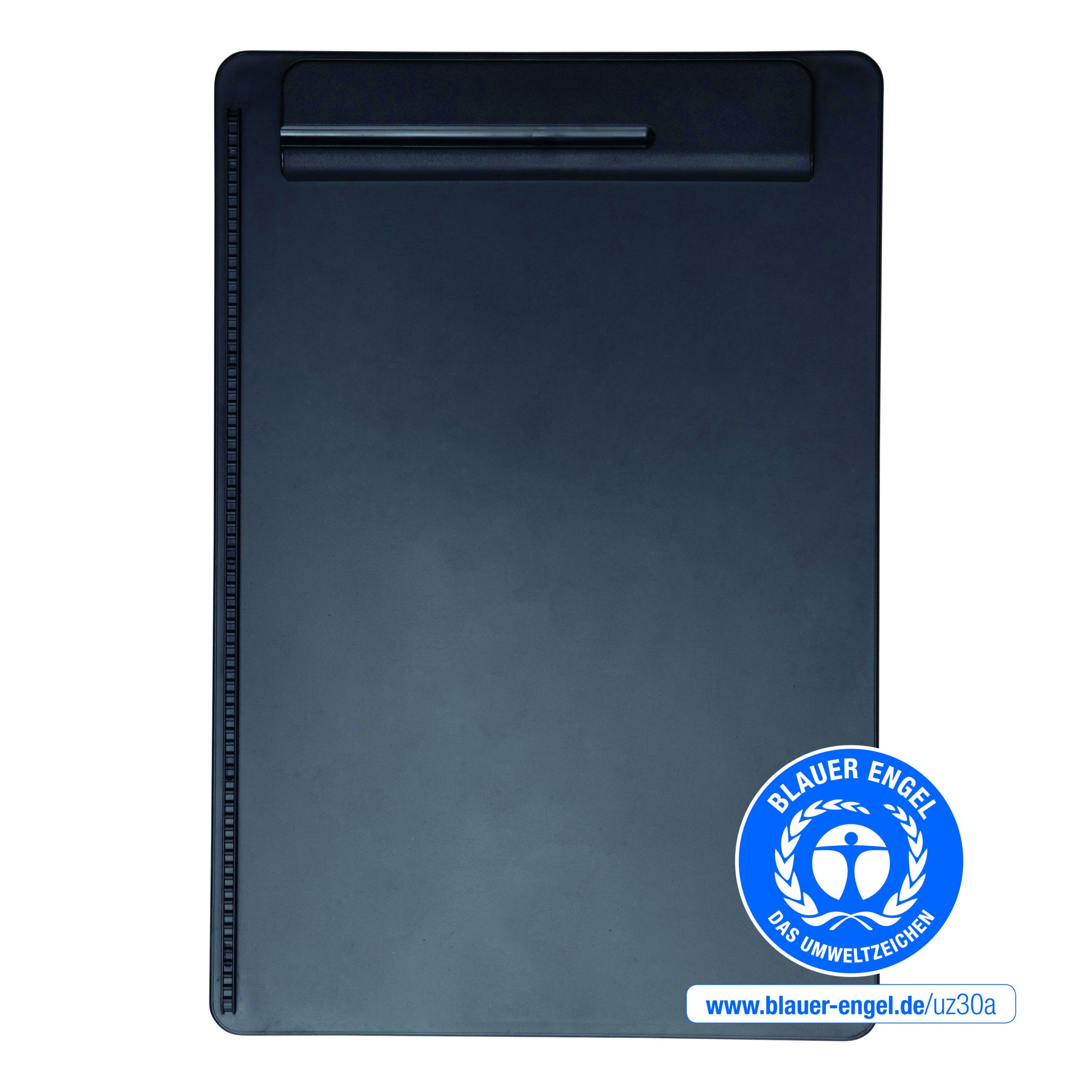 Clipboard A4 MAULgo Sort Dette sorte clipboard i A4-format giver en stabil skriveflade, når du er på farten eller ikke har et skrivebord til rådighed. Det er ideelt til f.eks. møder, undervisning og lagerarbejde. Den brede plastklemme er udstyret med en kraftig metalfjeder og har en åbning på ca. 8 mm, så den kan fastholde flere ark papir ad gangen. En integreret penneholder i selve klemmen sikrer, at kuglepennen altid er lige ved hånden. På venstre side har clipboardet et papiranslag, som sørger for, at arkene ligger lige og ikke glider skævt. Pladen er fremstillet i plast med en tykkelse på 3 mm. Board og klemme er holdt i samme sorte farve og giver et ensartet og professionelt udtryk. Produktet er produceret i Tyskland og leveres med 3 års garanti. Clipboardet er certificeret med det officielle miljømærke Blauer Engel, som stiller dokumenterede krav til blandt andet materialevalg, produktion og miljøpåvirkning. Mål: L 34,3 x B 23,3 x H 1,6 cm