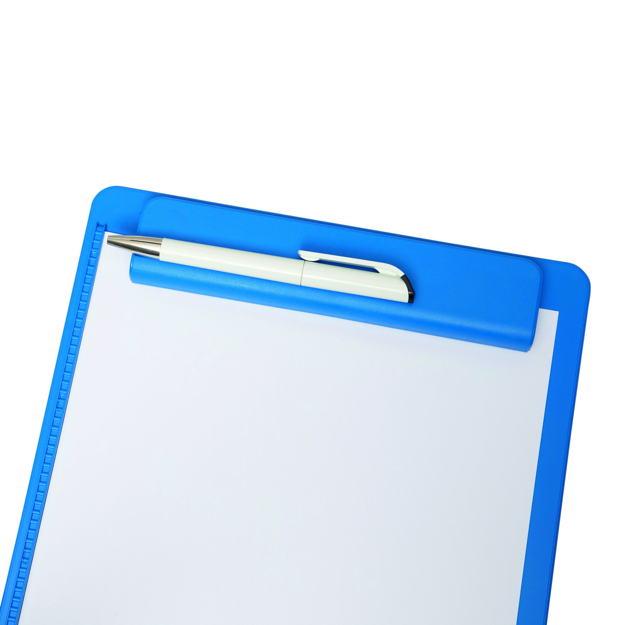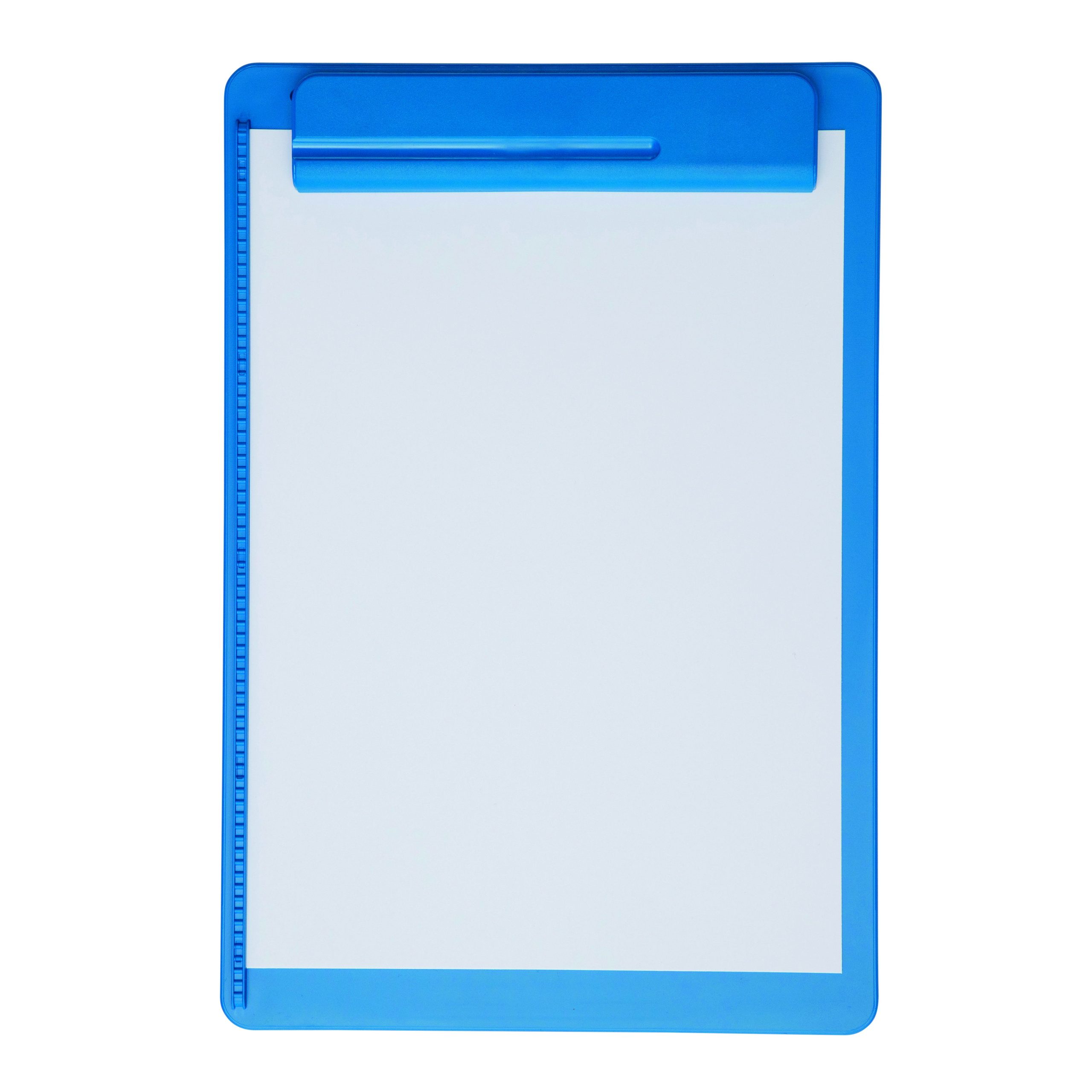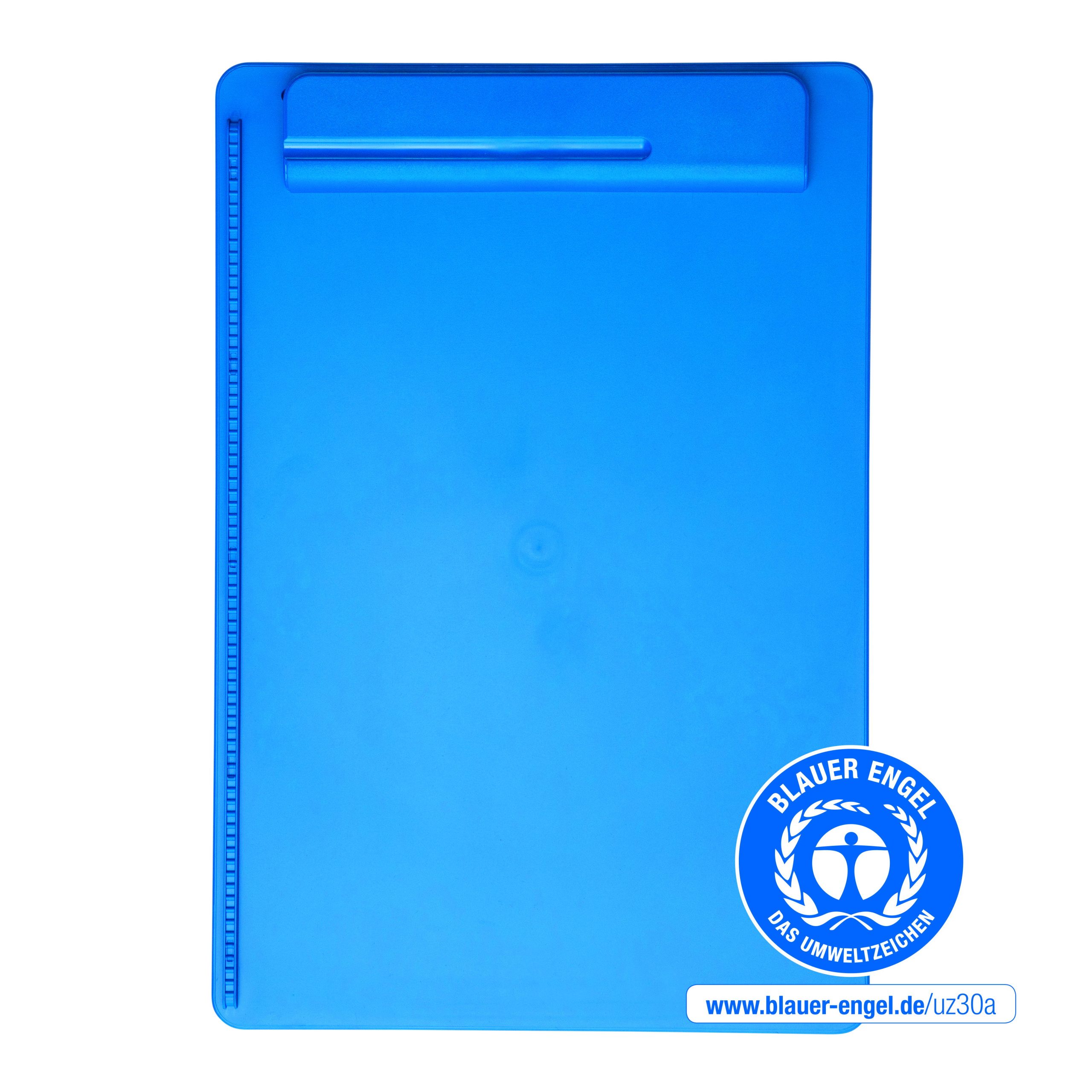 Clipboard A4 MAULgo Blå Dette blå clipboard i A4-format giver en stabil skriveflade, når du er på farten eller ikke har et skrivebord til rådighed. Det er ideelt til f.eks. møder, undervisning og lagerarbejde. Den brede plastklemme er udstyret med en kraftig metalfjeder og har en åbning på ca. 8 mm, så den kan fastholde flere ark papir ad gangen. En integreret penneholder i selve klemmen sikrer, at kuglepennen altid er lige ved hånden. På venstre side har clipboardet et papiranslag, som sørger for, at arkene ligger lige og ikke glider skævt. Pladen er fremstillet i plast med en tykkelse på 3 mm. Board og klemme er holdt i samme blå farve og giver et ensartet og professionelt udtryk. Produktet er produceret i Tyskland og leveres med 3 års garanti. Clipboardet er certificeret med det officielle miljømærke Blauer Engel, som stiller dokumenterede krav til blandt andet materialevalg, produktion og miljøpåvirkning. Mål: L 34,3 x B 23,3 x H 1,6 cm