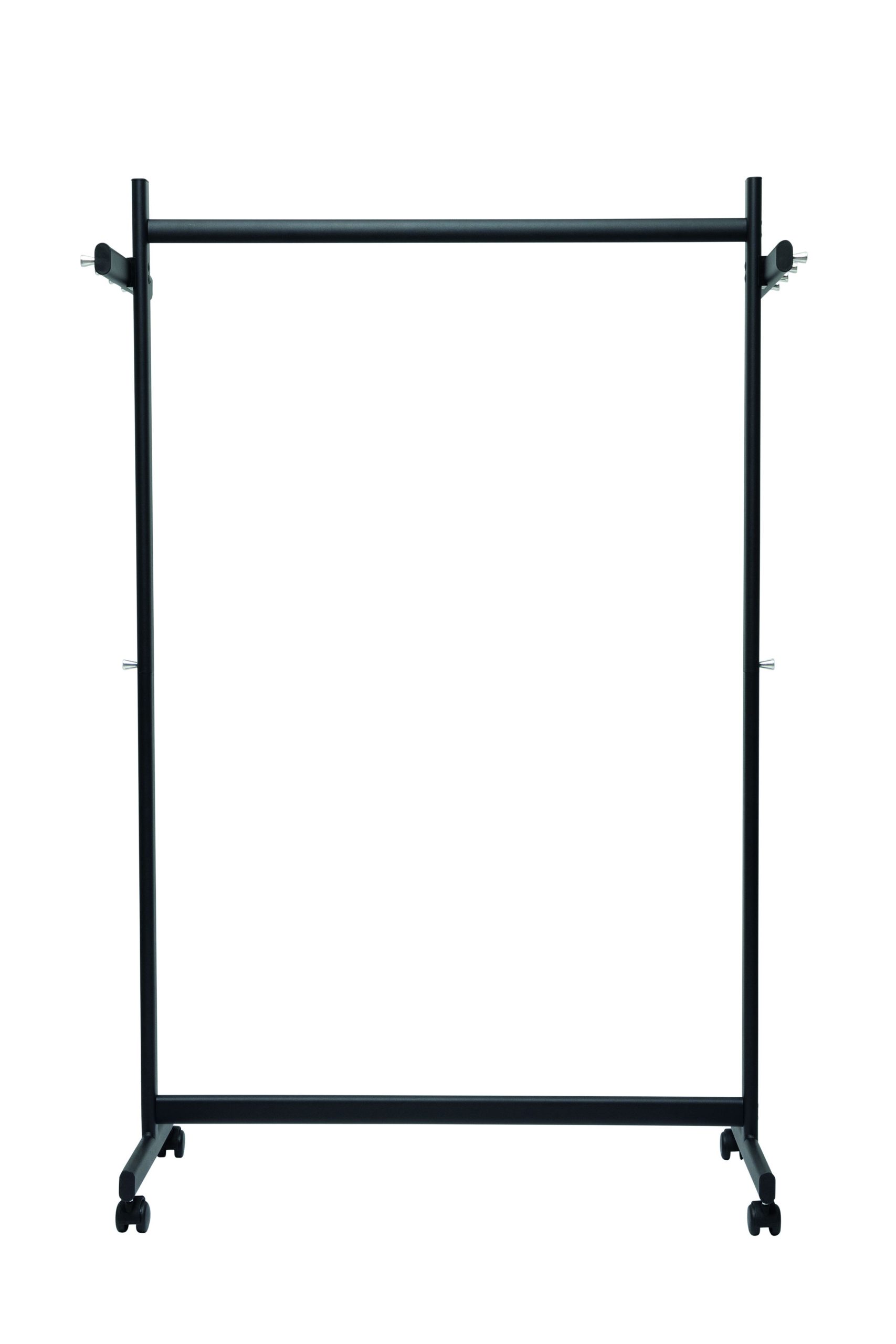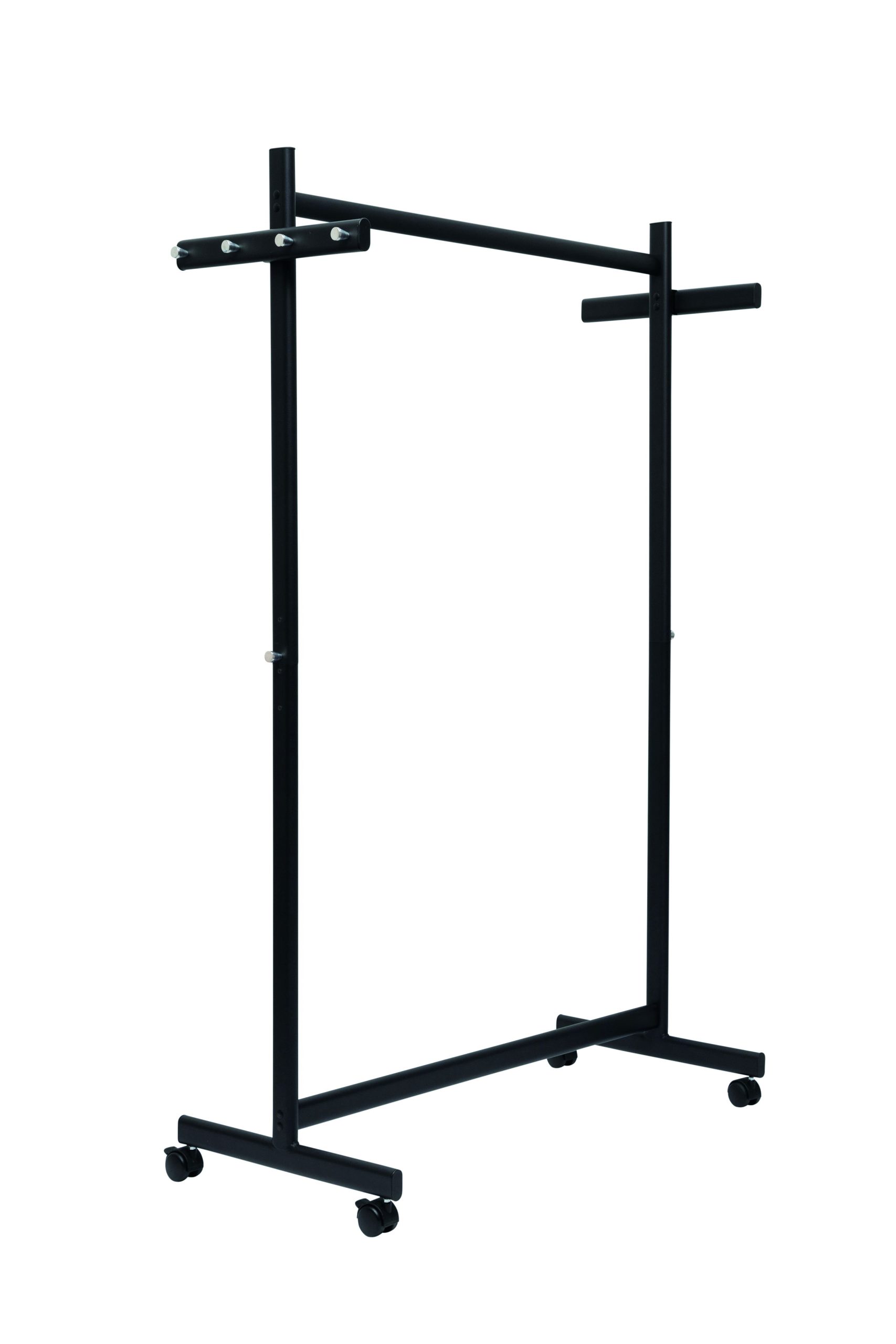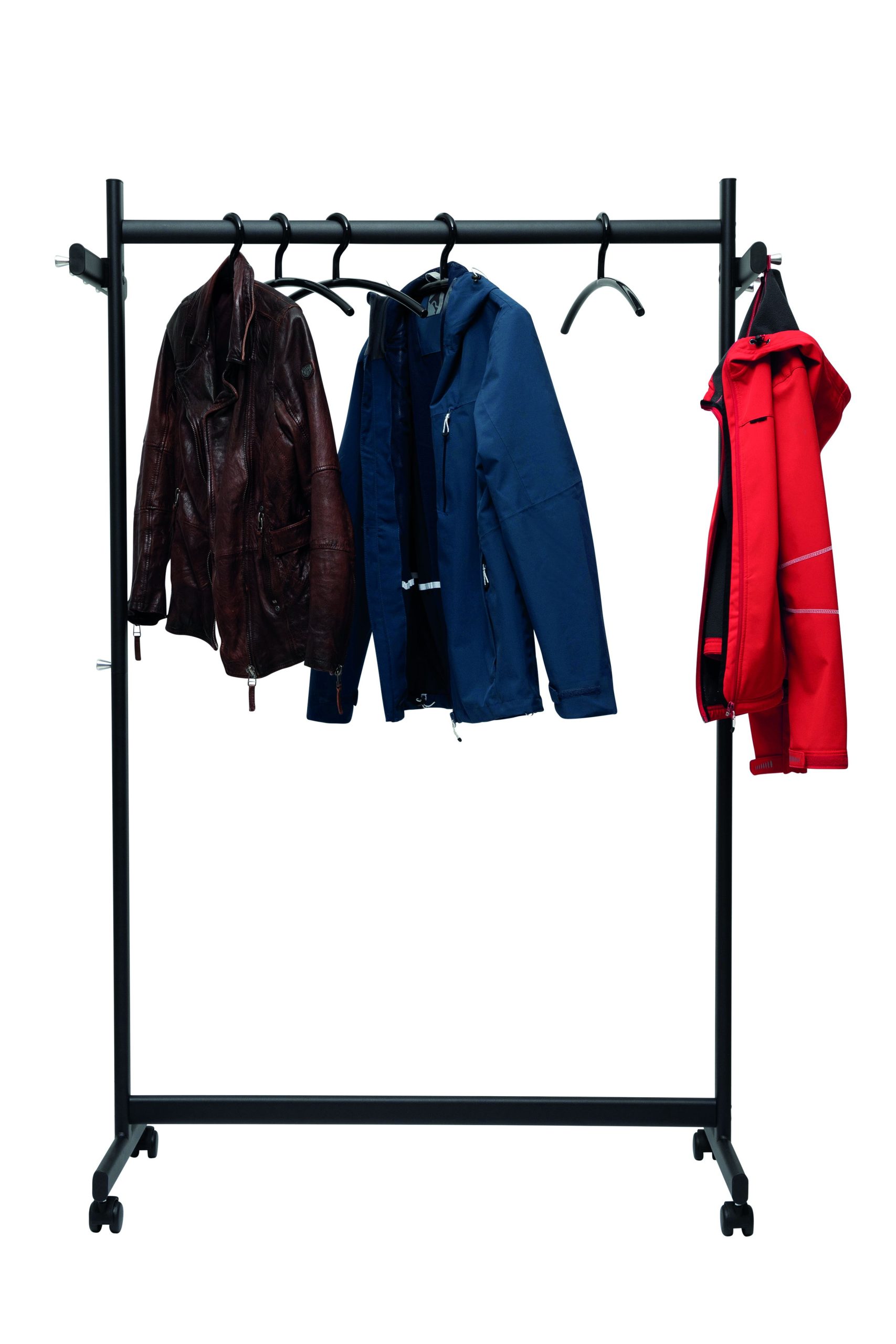 Garderobestativ på hjul, MAULsamba, sort Garderobestativet MAULsamba i sort er en stabil og fleksibel løsning til kontor, reception, mødelokale eller showroom. Garderobestativet er fremstillet i robust, pulverlakeret stål med massiv tværstang, som sikrer høj stabilitet. Den øverste bøjlestang er 115,5 cm bred og har en bæreevne på op til 40 kg svarende til ca. 16 jakker. Derudover er stativet udstyret med 8 ekstra sidekroge med en bæreevne på op til 10 kg pr. krog samt kroge til tasker. Garderobestativet er monteret med 4 dobbelte drejehjul (Ø 50 mm), hvilket gør det nemt at flytte stativet efter behov. To af hjulene kan låses, så garderobestativet står sikkert. Produktmål: Mål: 116 x 50,8 x 172,5 cm Hjul: 4 dobbelte drejehjul Ø 50 mm (2 med bremse) Vægt: 10.32 kg