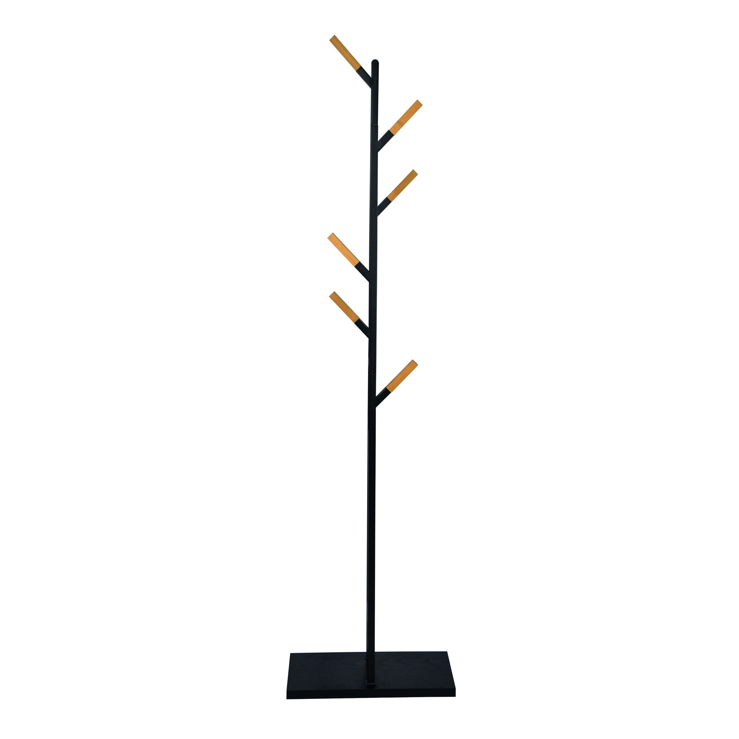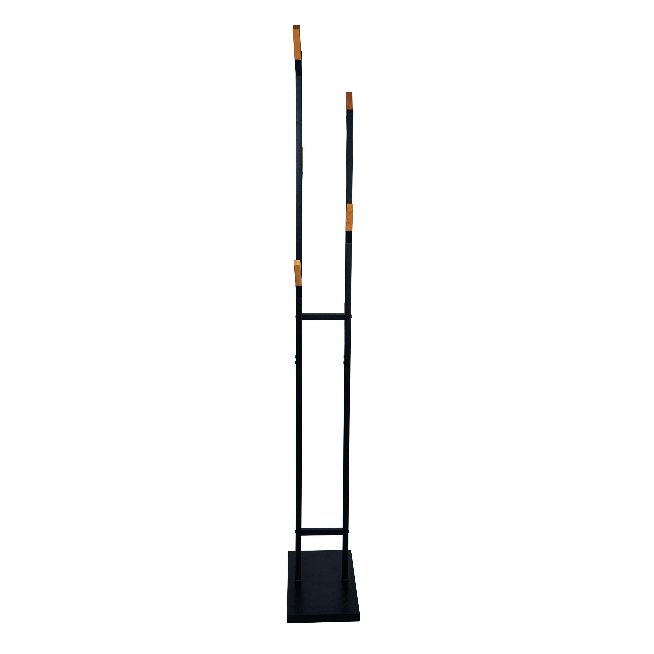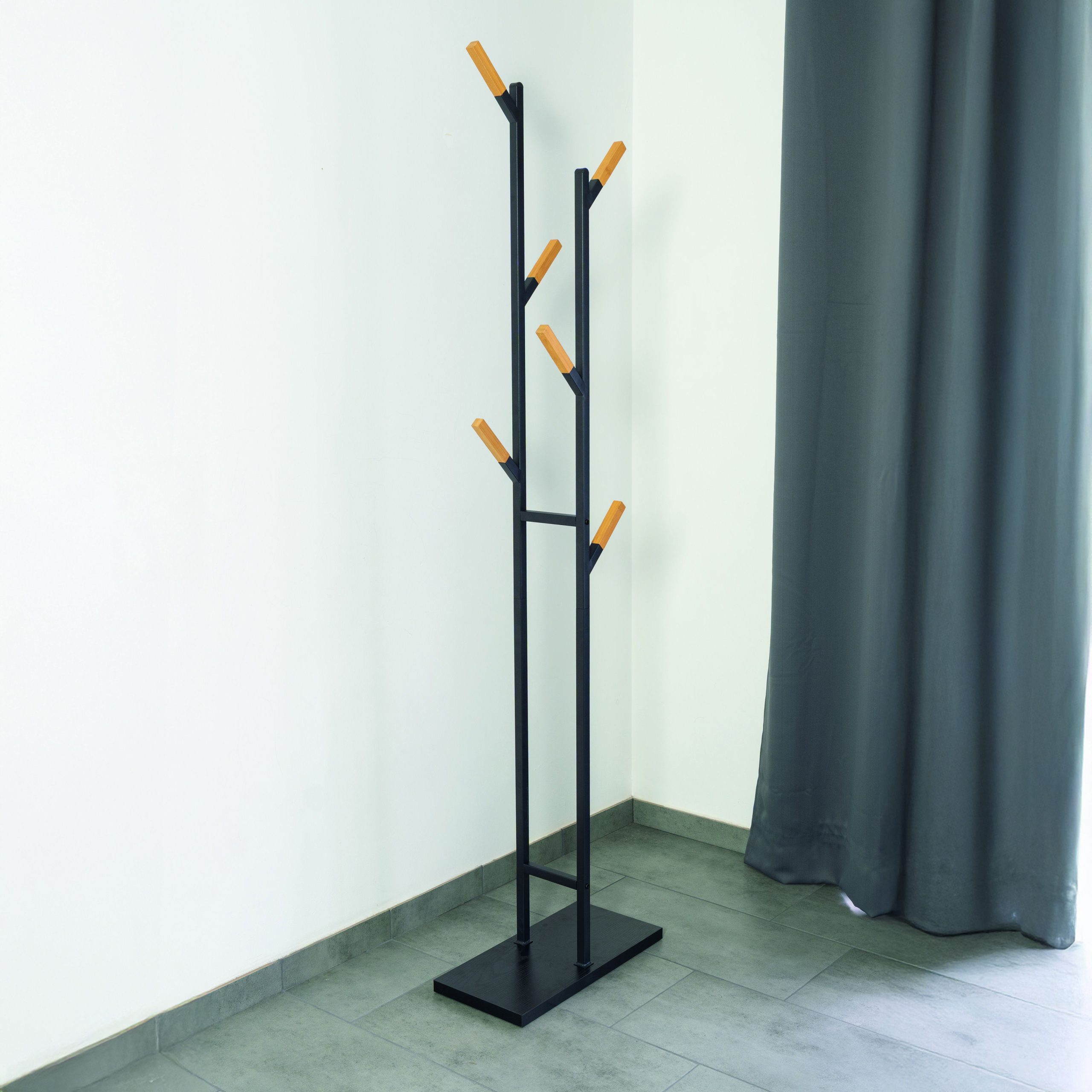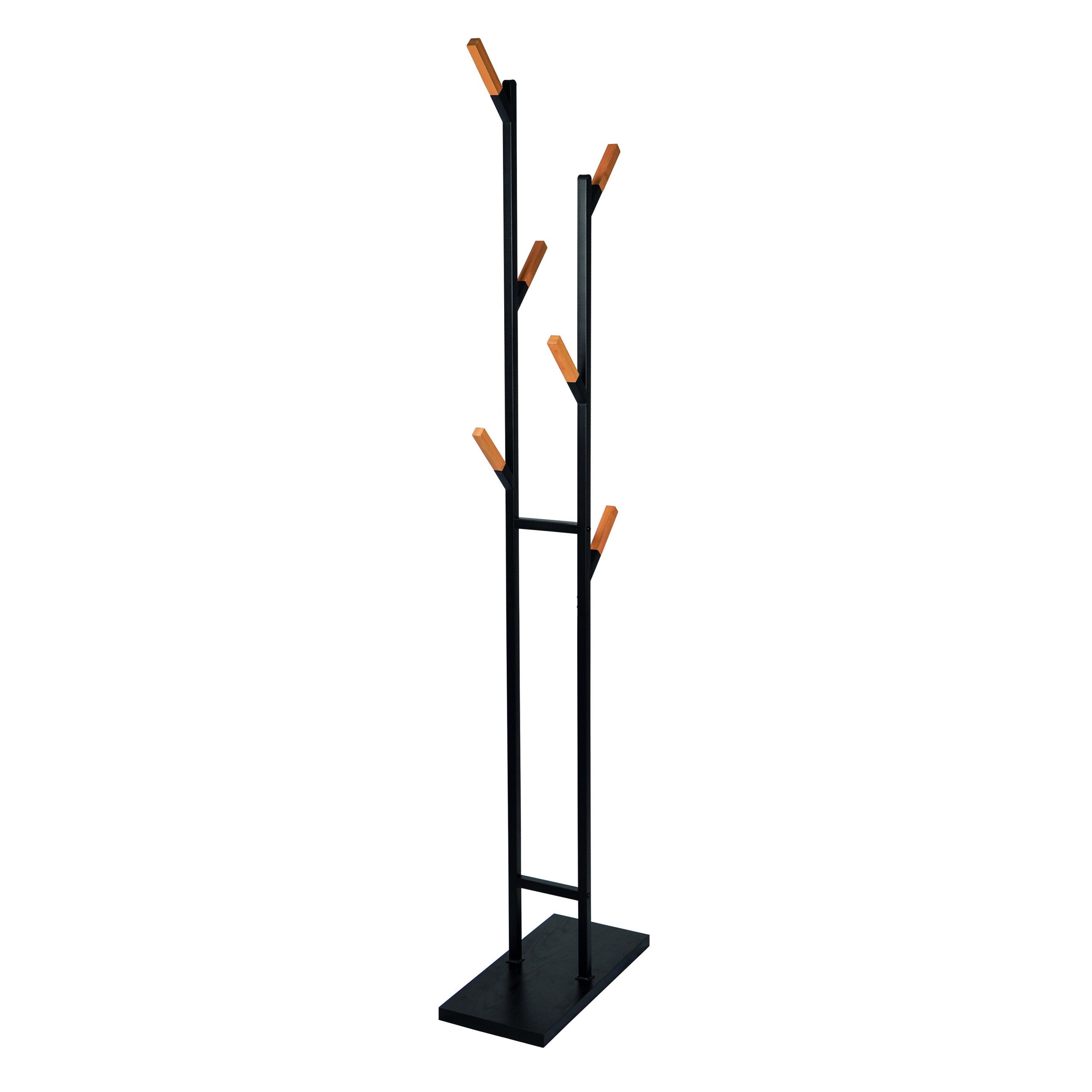 Stumtjener, MAULrima, sort/bambus MAULrima er en elegant stumtjener i et moderne og minimalistisk design, hvor mat sort stål kombineres med detaljer i naturlig bambus. Det stilrene udtryk gør den ideel til entréen, kontoret eller hjemmet, hvor der ønskes en funktionel og pladsbesparende løsning til overtøj, tasker og andet tilbehør. Stumtjeneren er udstyret med seks knager i bambus, som er forskudt placeret for at fordele belastningen jævnt og give nem adgang fra flere sider. Kombinationen af metal og bambus skaber en flot kontrast og tilfører varme til indretningen. De solide stålsøjler i 20 x 20 mm sikrer en robust konstruktion med høj stabilitet. Den brede bundplade i melaminbelagt MDF giver et sikkert fundament, mens integrerede anti-slip puder beskytter gulvet mod ridser og sikrer, at stumtjeneren står stabilt. De tværgående stænger mellem søjlerne bidrager yderligere til konstruktionens styrke. Mål: L 48 x B 23 x H 183 cm Vægt: 3,793 kg