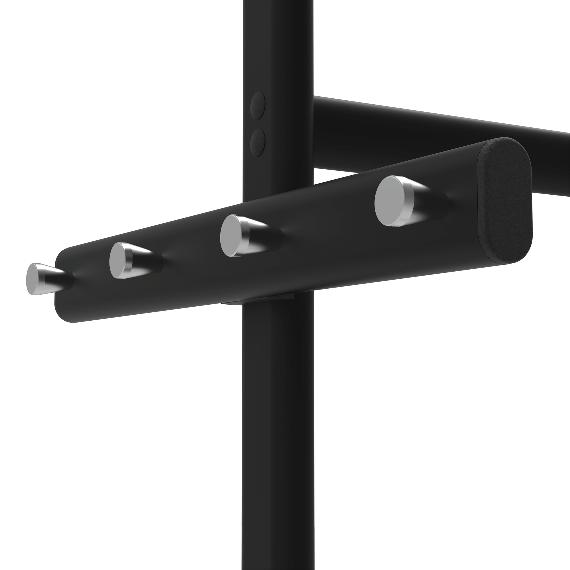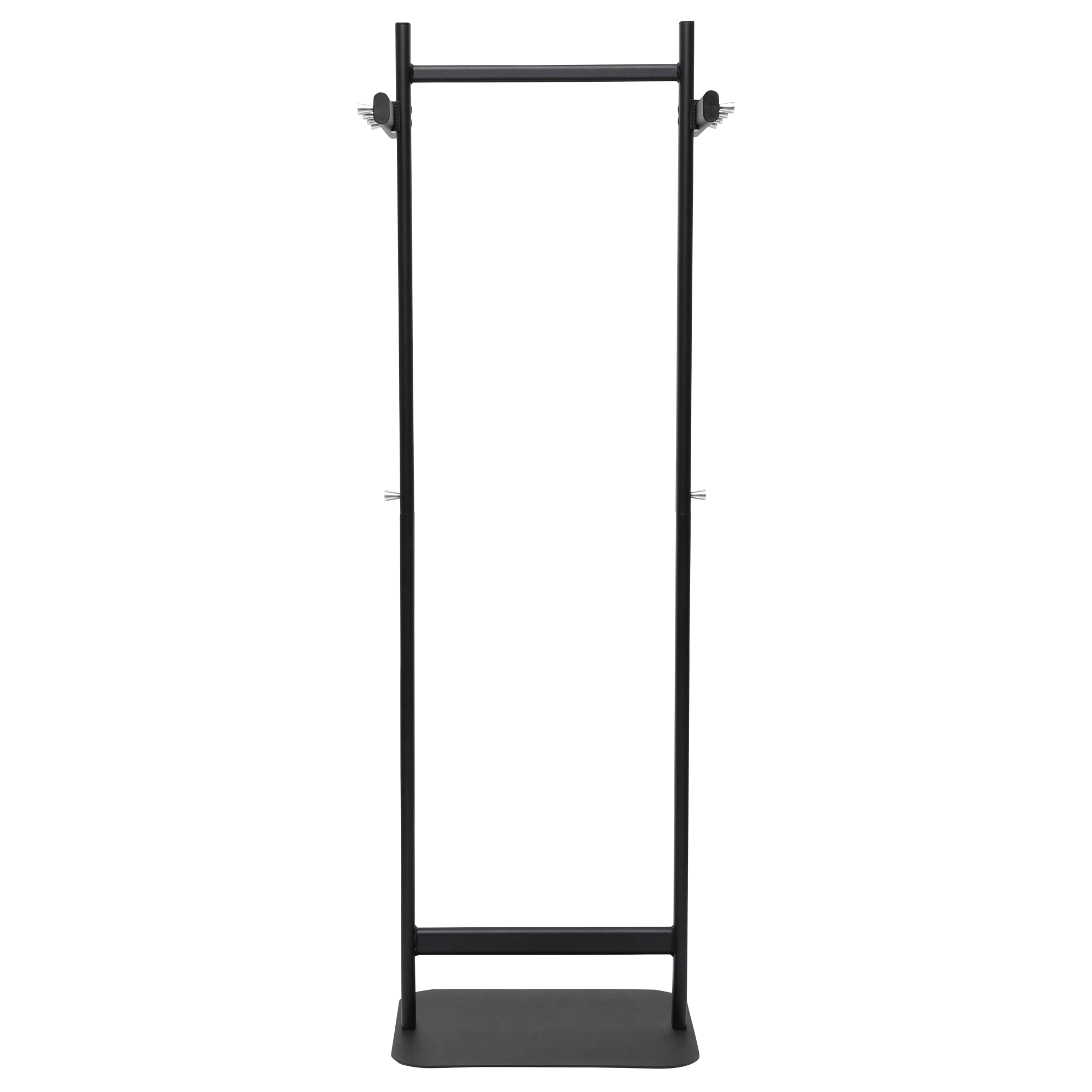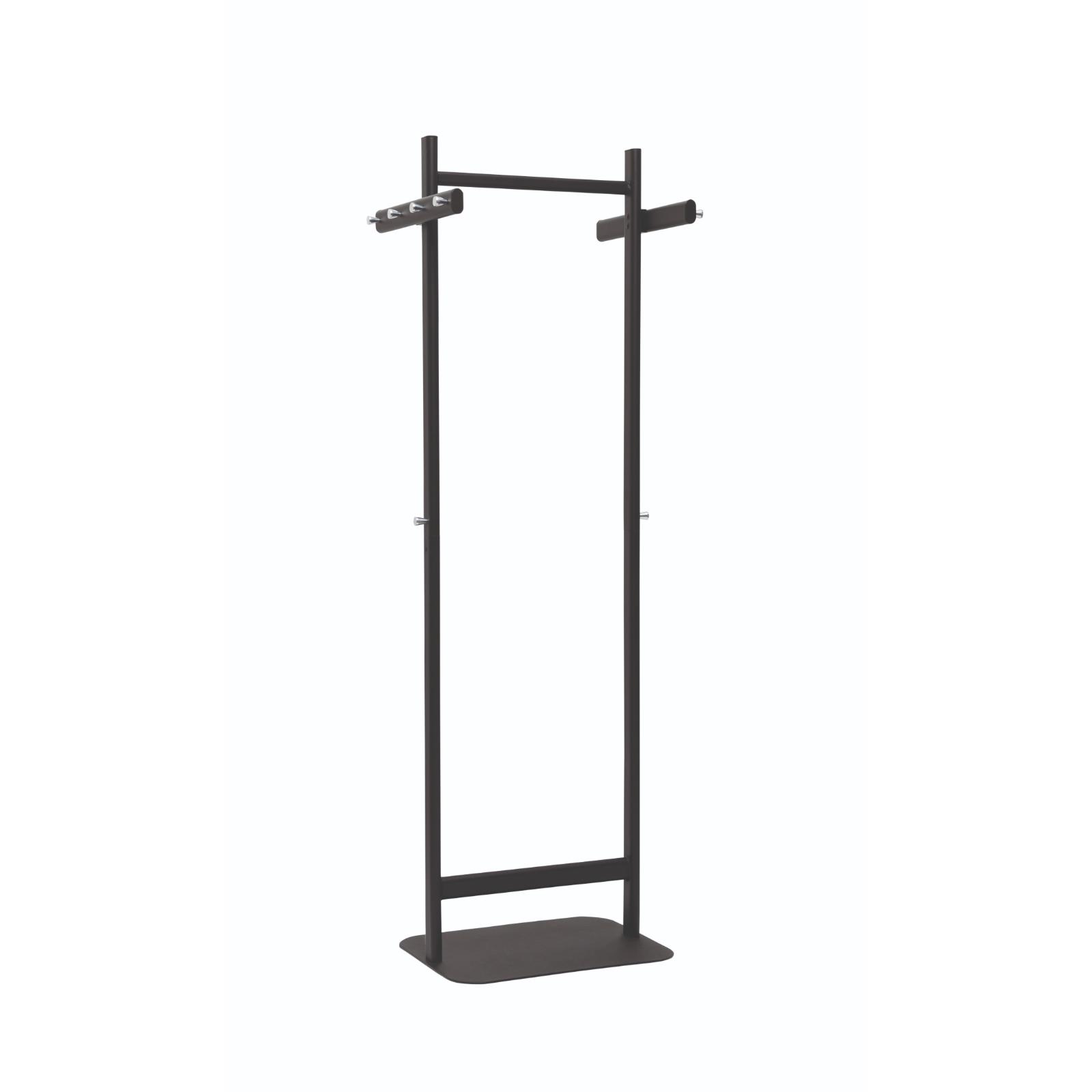 Højkvalitets garderobestativ i elegant design Kompakt model med masser af opbevaringsplads. Bøjlestang og 8 knager til ophængning af frakker o.lign. samt 2 ekstra, lavere kroge på stativet til børnejakker eller tasker. Fremstillet af robust, pulverlakeret mat, sort metal. Meget stabil konstruktion med en stor bundplade af kraftigt stål. Ideel til kontorer, receptionslokaler, praksisser og i hjemmet. Belastning: bøjlestang 40 kg eller 12 jakker + 8 kroge 10 kg hver + kroge til håndtasker. Fastskruede knager i forkromet metal Ø 2 cm, konisk formet for optimalt hold af tøjet. Stor, flad stålbundplade 52 x 40 cm, 5 mm tyk, for perfekt stabilitet og reduceret risiko for at vælte. Fod med filtgulvbeskyttere. Farve sort RAL 9004. Nem at samle. Måler 60 x 173 x 43 cm. Fremstillet i Tyskland af Maul, med over 100 års erfaring i metalproduktion. 2 års garanti.