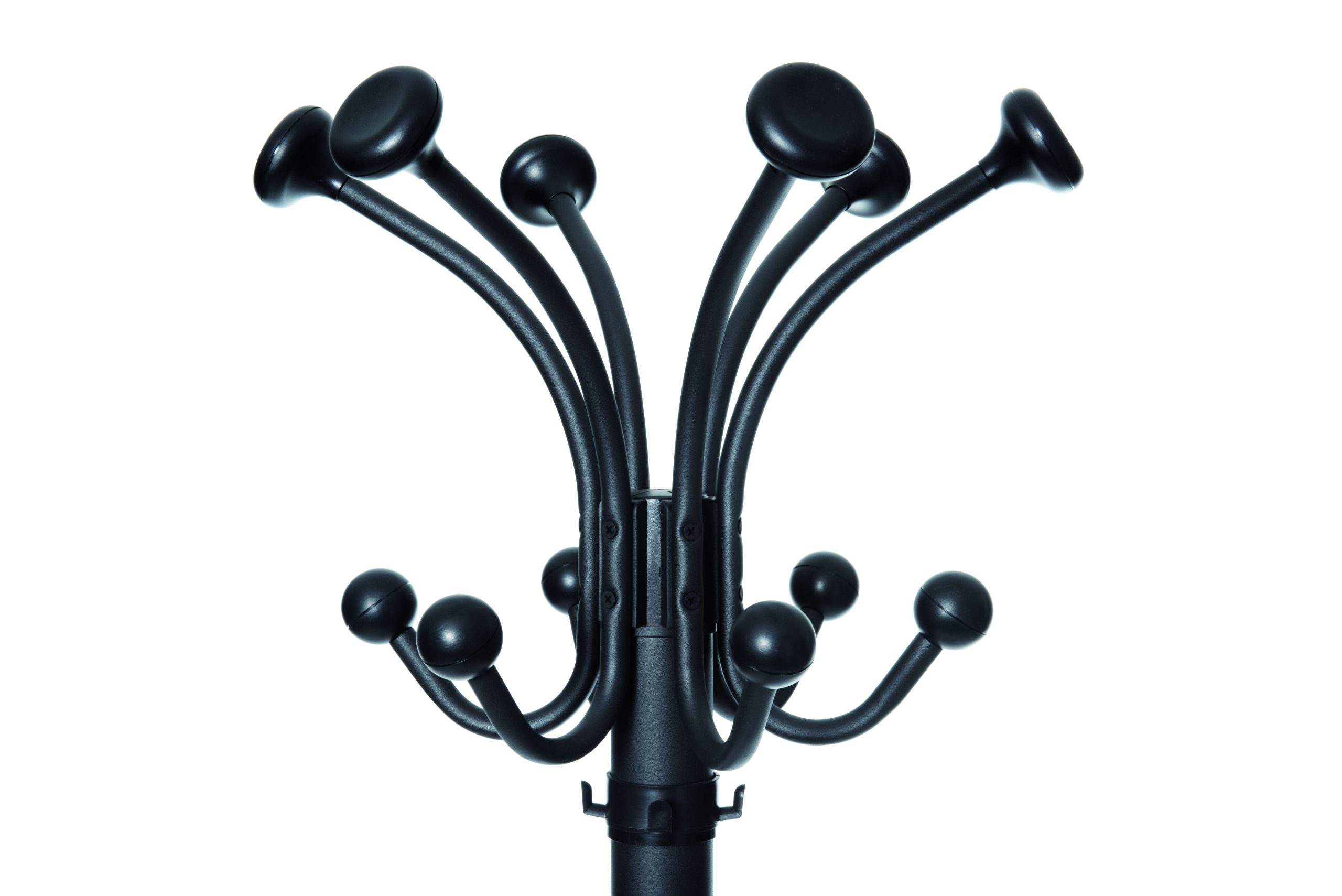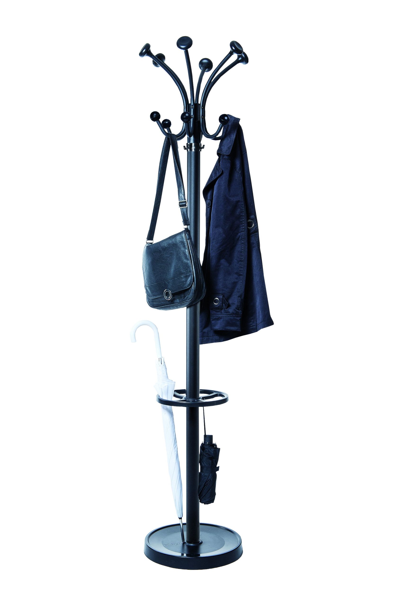 Stumtjener med paraplyholder, MAULnubis, sort MAULnubis er en eksklusiv og ekstra robust stumtjener i mat sort pulverlakeret stål, designet til brug i entréer, kontorer og fællesområder. Stumtjeneren er udstyret med hele 20 knager i alt. Øverst sidder 12 knager med afrundede hoveder i plast, der beskytter tøjet mod slid. Derudover har modellen 4 knager på søjlen samt 4 knager ved paraplyholderen. Den drejbare krone med en diameter på 41 cm giver nem adgang fra alle sider. Den integrerede paraplyholder med en diameter på 27 cm har plads til op til 8 paraplyer samt 4 taskeparaplyer. Den tunge betonfod på 6 kg med plastafdækning sikrer god stabilitet, mens filtpuder beskytter gulvet mod ridser. Mål: L 40 x B 40 x H 177,5 cm Fod: Ø 36,5 cm Vægt: 9,98 kg