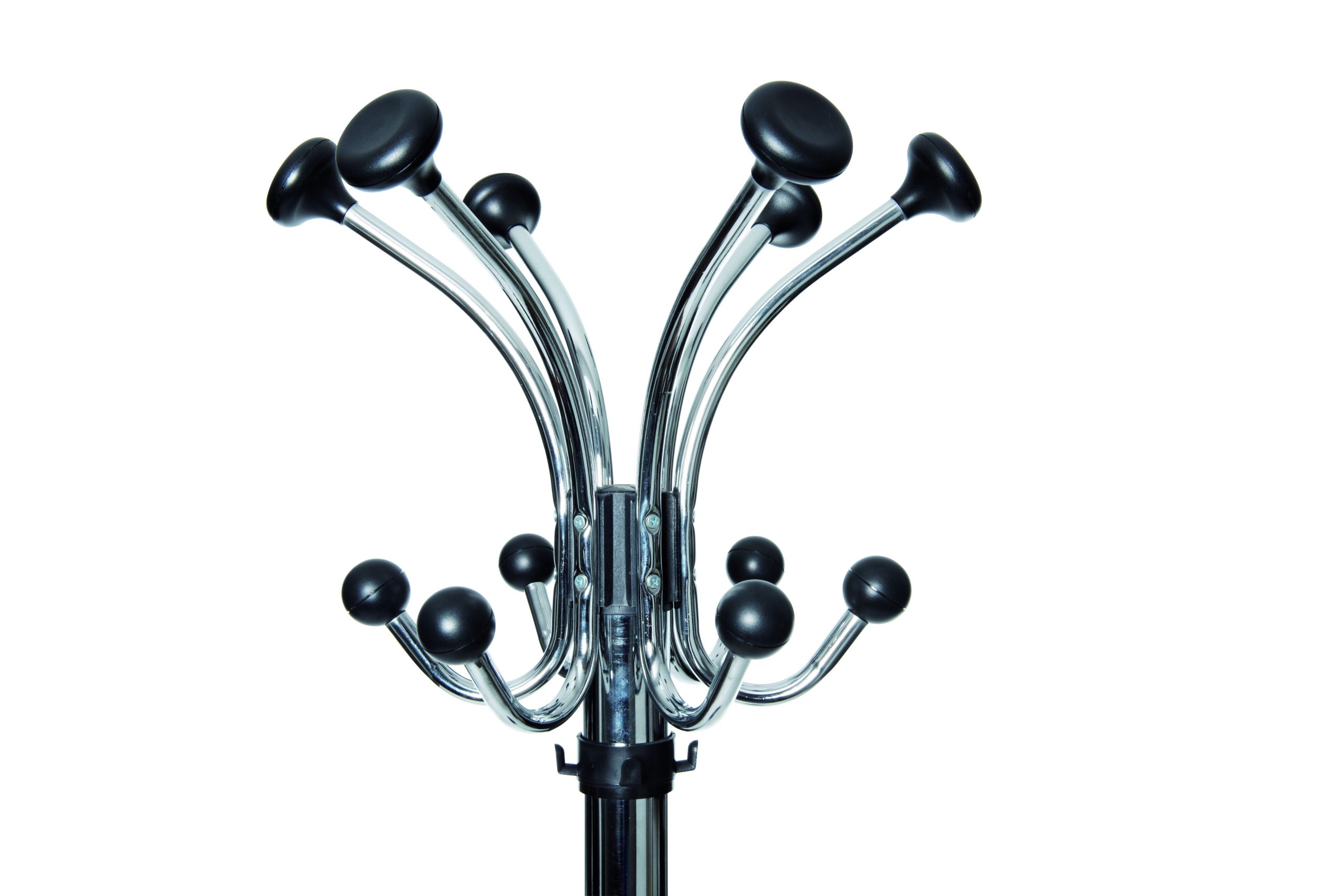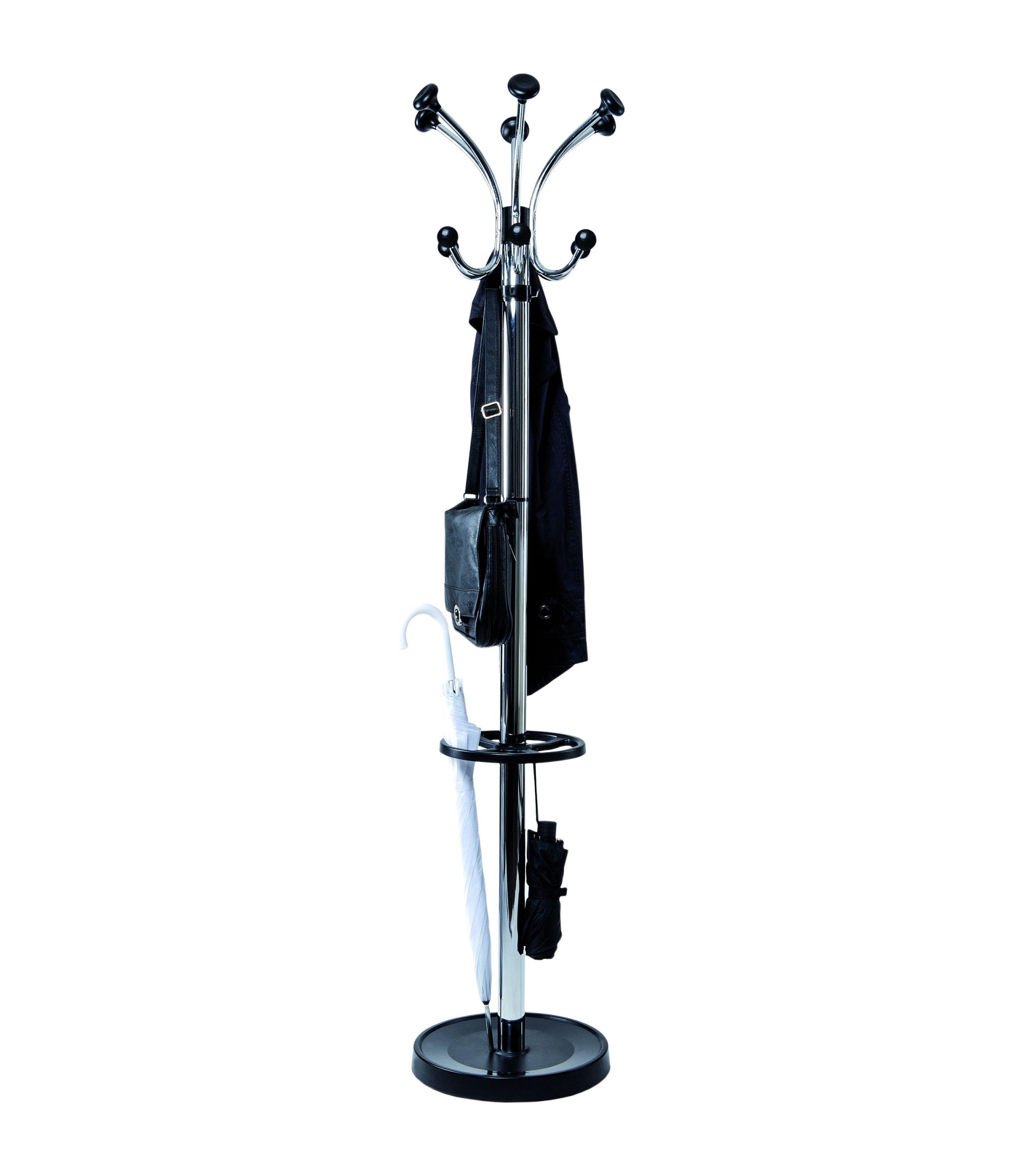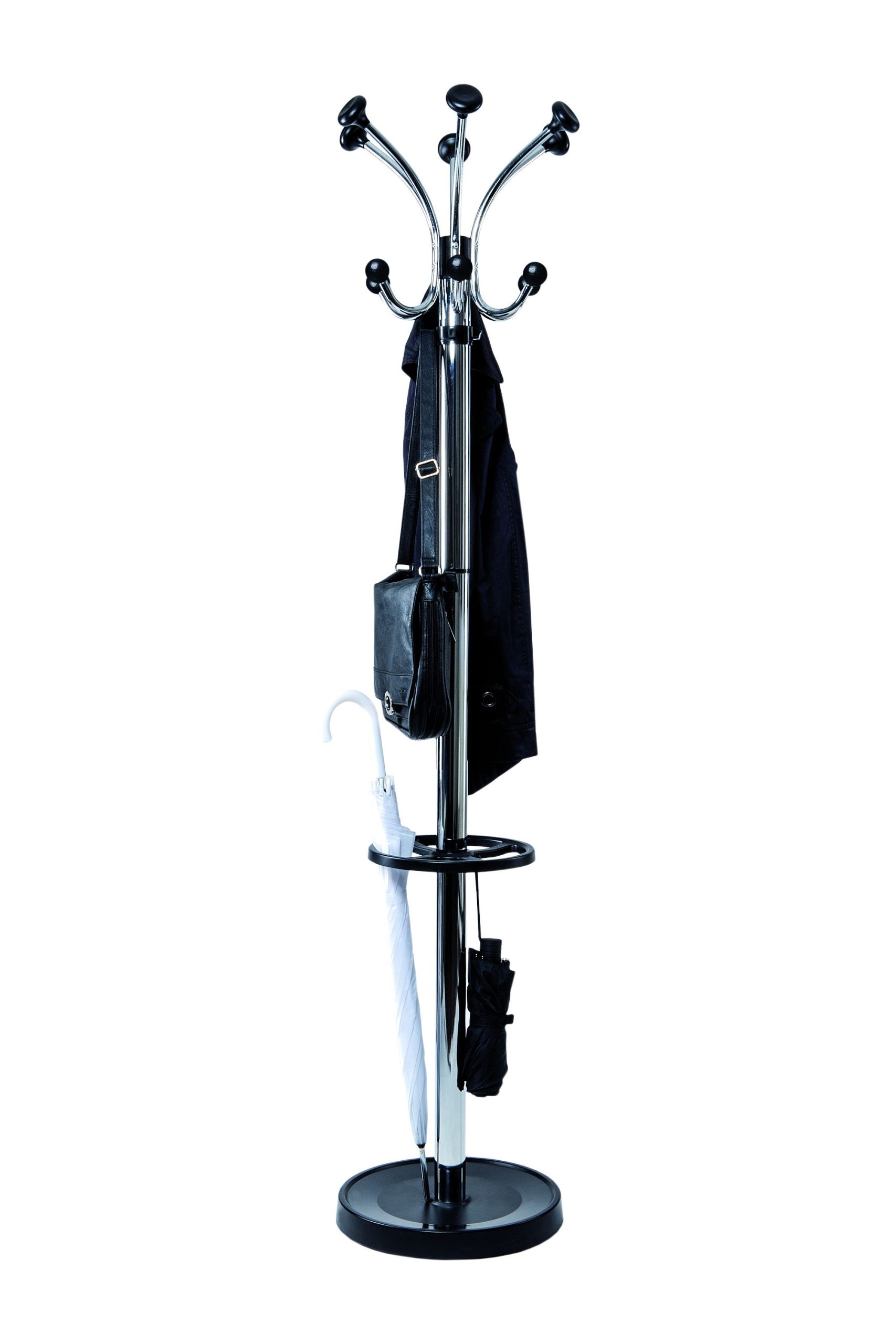 Stumtjener med paraplyholder, MAULnubis, krom MAULnubis er en eksklusiv og ekstra robust stumtjener i stål med elegant krom-look med sorte detaljer. Stumtjeneren er designet til brug i entréer, kontorer og fællesområder og er udstyret med i alt 20 knager. Øverst sidder 12 knager med afrundede hoveder, der beskytter tøjet mod slid og mærker. Derudover har modellen 4 knager på søjlen samt 4 knager ved paraplyholderen, hvilket giver god kapacitet til jakker, tasker, hatte og accessories. Den drejbare krone med en diameter på 41 cm sikrer nem adgang fra alle sider. Den integrerede sorte paraplyholder med en diameter på 27 cm har plads til op til 8 paraplyer samt 4 taskeparaplyer. Den tunge betonfod på 6 kg med plastafdækning sikrer høj stabilitet, mens filtpuder beskytter gulvet mod ridser. Mål: L 40 x B 40 x H 177,5 cm Fod: Ø 36,5 cm Vægt: 9,98 kg