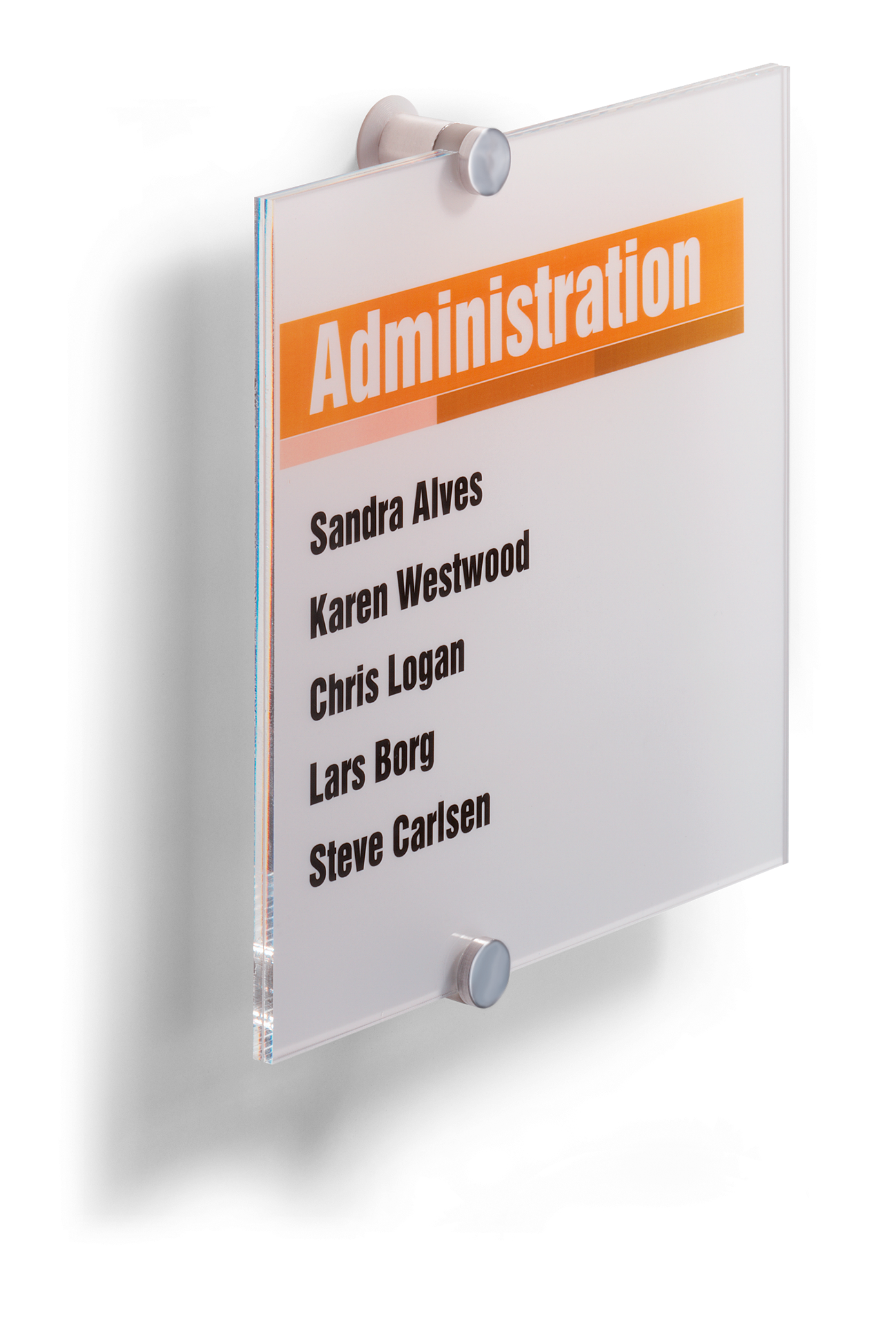 CRYSTAL SIGN dør/vægskilt er en vellykkede kombination af elegant design og høj funktionalitet. Skiltet er af klar akrylplast med to dekorative sølvfarvede skruer, der holder skiltet sammen. Leveres med to halvgennemsigtige indstiksark til laserudskrift og ekstra indstik kan også bestilles separat (varenr.. 4834). Design selv en personlig designet indstiksetiket til skiltet med gratis skabelon på www.duraprint.dk Mål: 210x210mm.