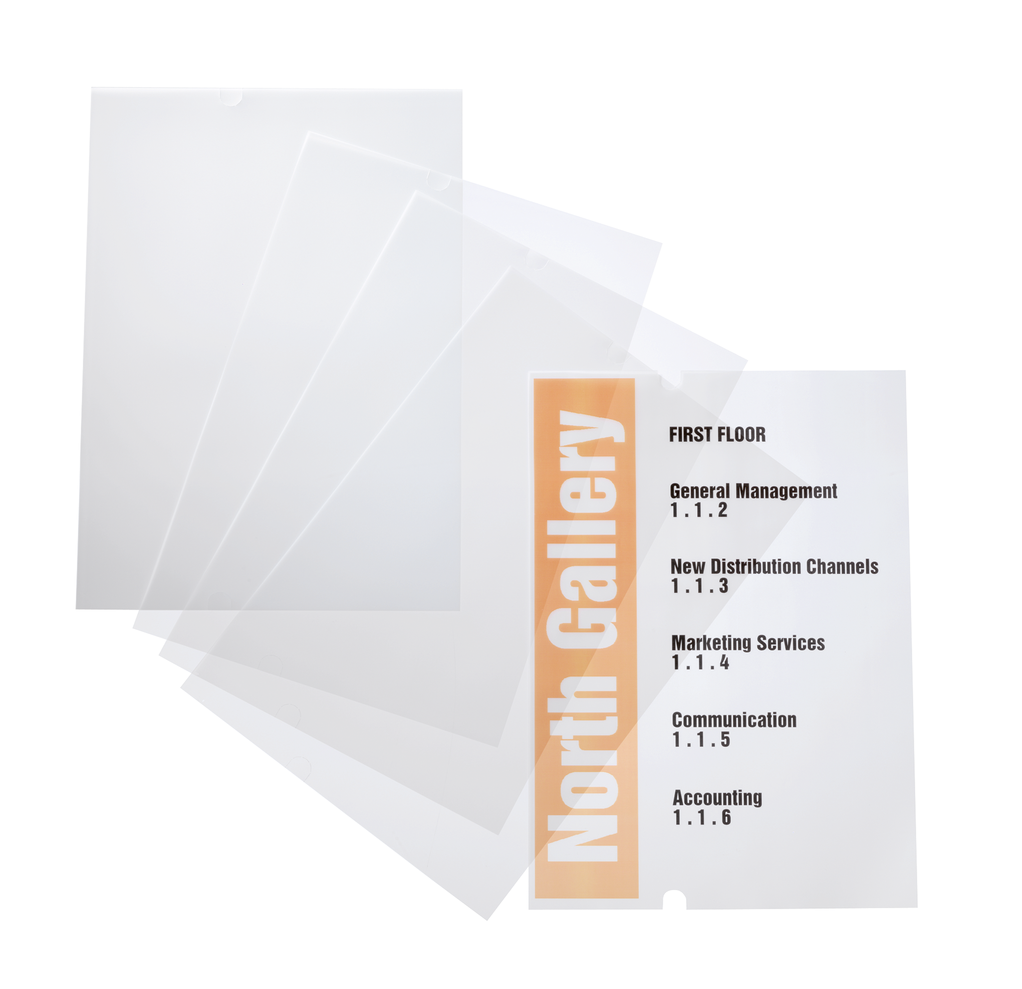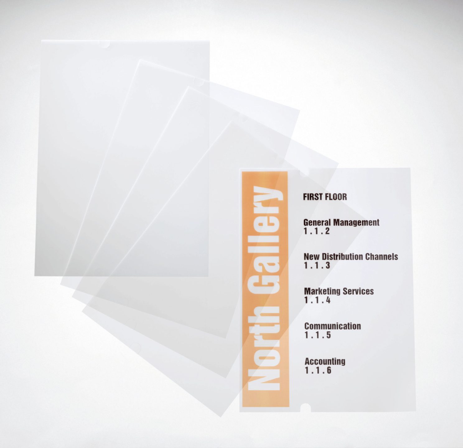 Halvgennemsigtige indstik til laserudskrift på A4-ark til Durable dør/vægskilte CRYSTAL SIGN. Passer til varenr. 482519. En pakke giver 10 skilte. Design selv en personlig designet indstiksetiket til skiltet med gratis skabelon på www.duraprint.dk
