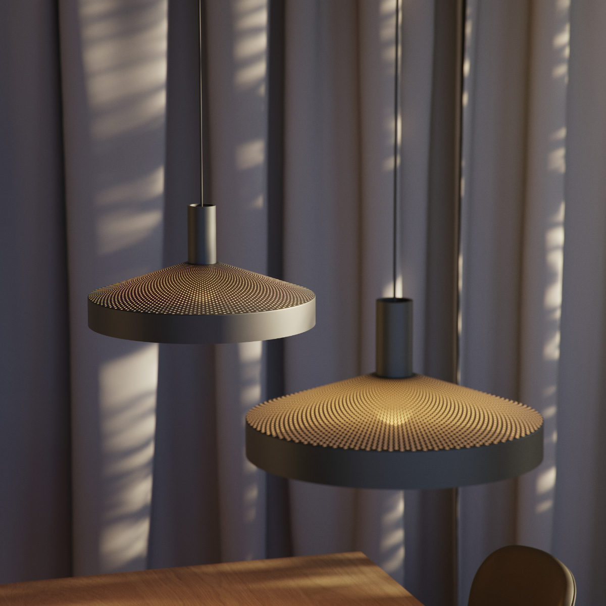 Dawn pendlen er inspireret af den traditionelle værkstedspendel, men har et moderne twist med en laserskåret perforering i lampens øvre del, der skaber en blød og rummelig belysning. Den funktionelle belysning opnås gennem den hvidmalede inderskærm og den tilbagetrukne lyskilde. Det karakteristiske knæk ved lampens kant sikrer en mere fokuseret lysretning, mens perforeringerne bidrager med både opad- og nedadrettet lys.