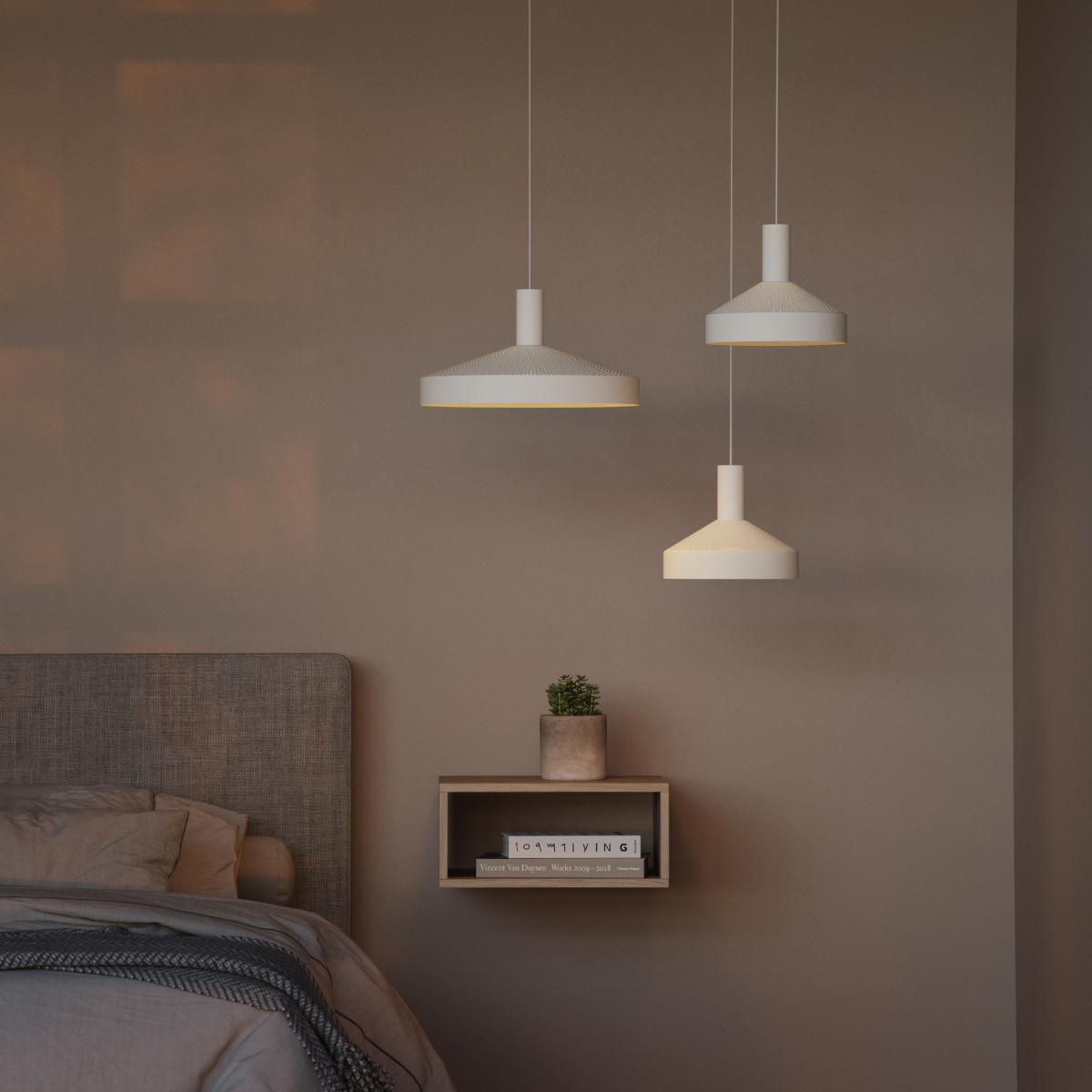 Dawn pendlen er inspireret af den traditionelle værkstedspendel, men har et moderne twist med en laserskåret perforering i lampens øvre del, der skaber en blød og rummelig belysning. Den funktionelle belysning opnås gennem den hvidmalede inderskærm og den tilbagetrukne lyskilde. Det karakteristiske knæk ved lampens kant sikrer en mere fokuseret lysretning, mens perforeringerne bidrager med både opad- og nedadrettet lys.
