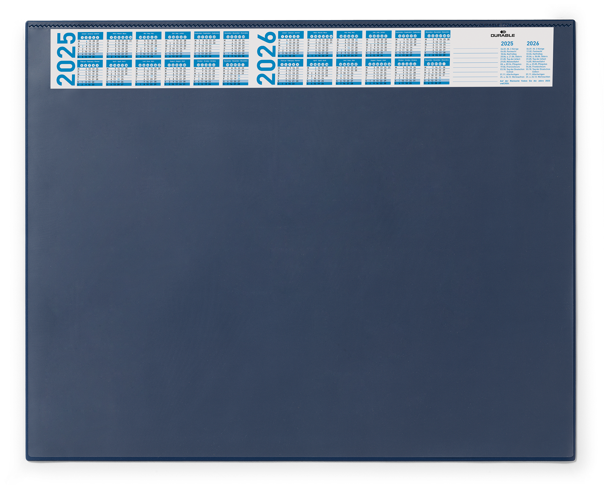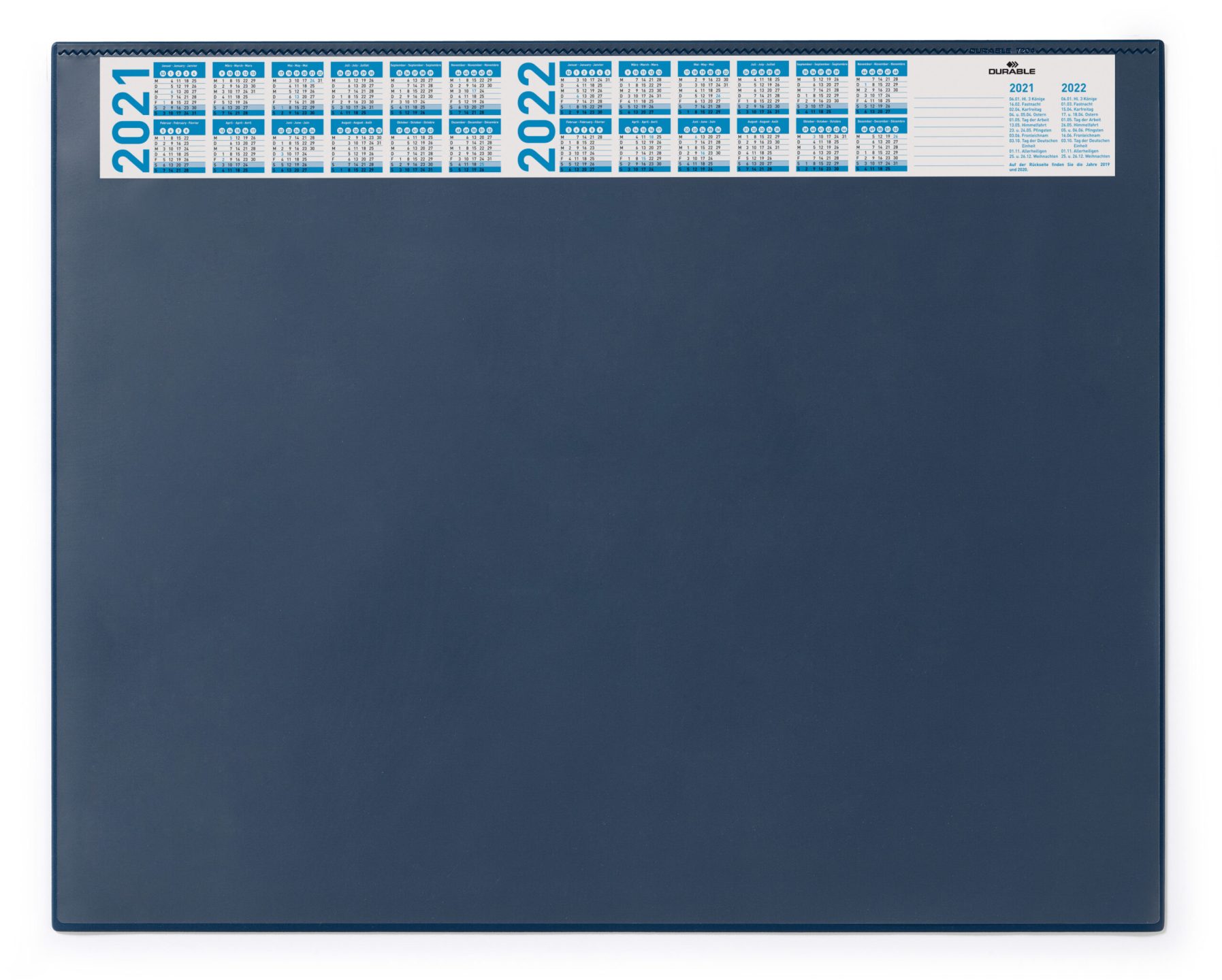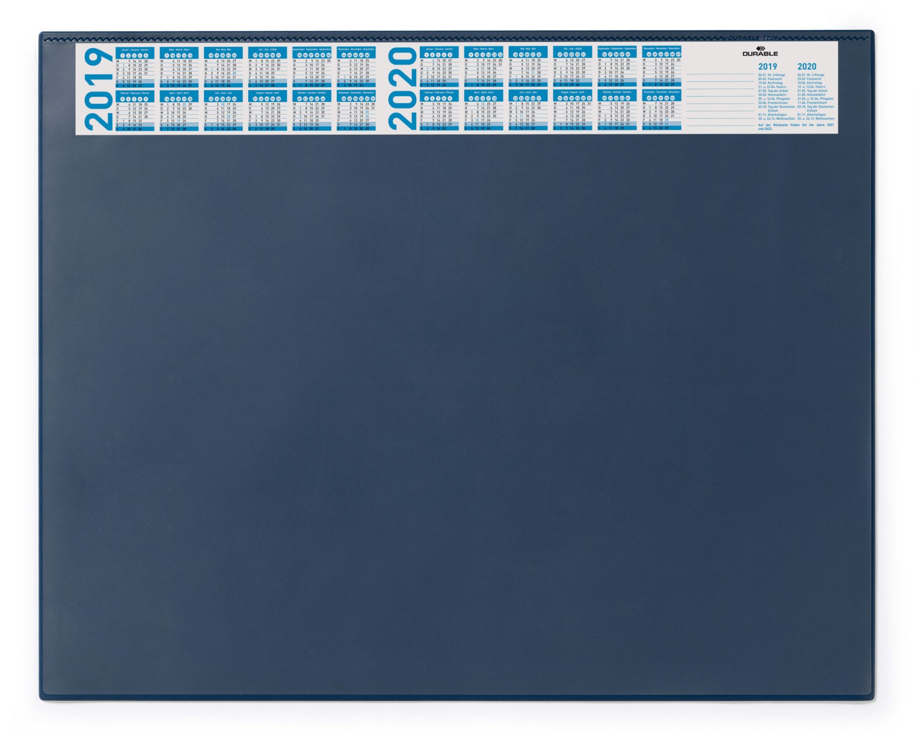DURABLE skriveunderlag er tilgængelige i forskellige formater, så de passer til individuelle krav. Alle skriveunderlagene er behagelige at bruge og kommer i en række stilfulde designs, der passer til enhver arbejdsplads. •Skriveunderlag med transparent dækplade •Med en smal årskalender i 4 år •Skridsikker •Mål: 650 x 520 mm (B x H)